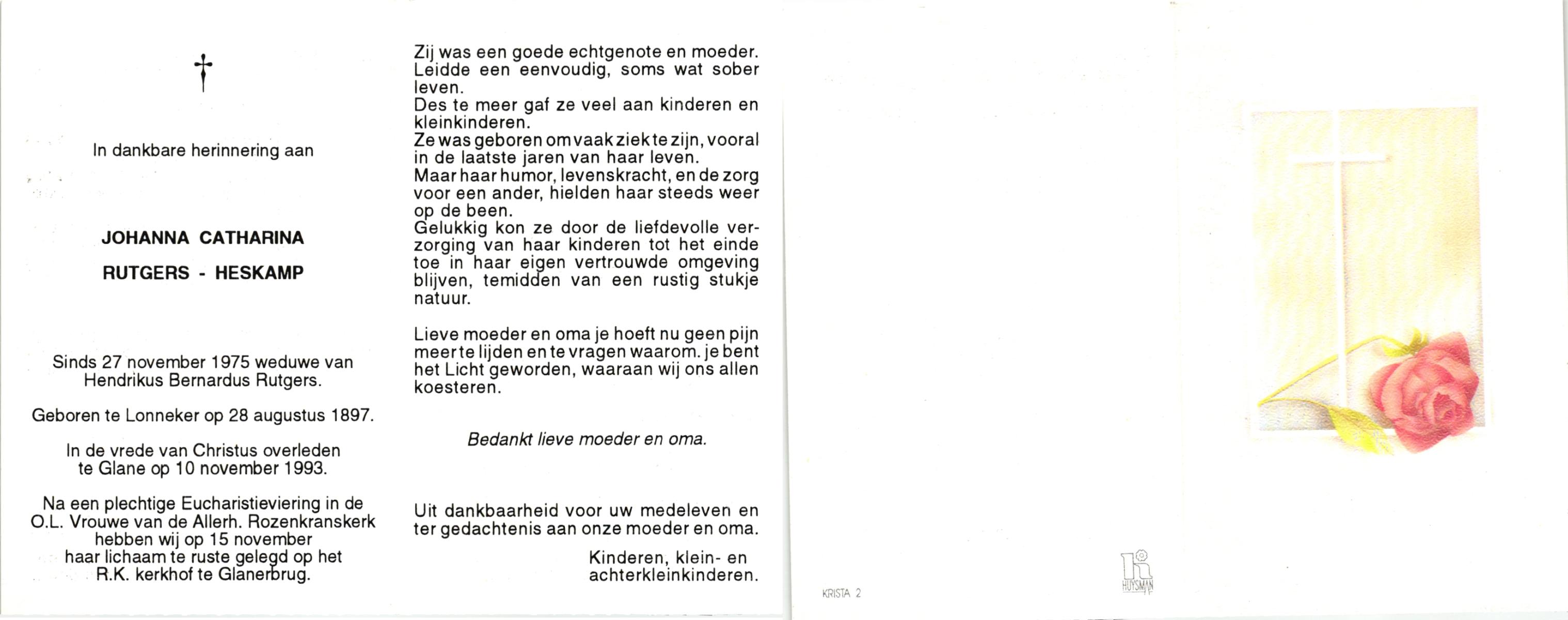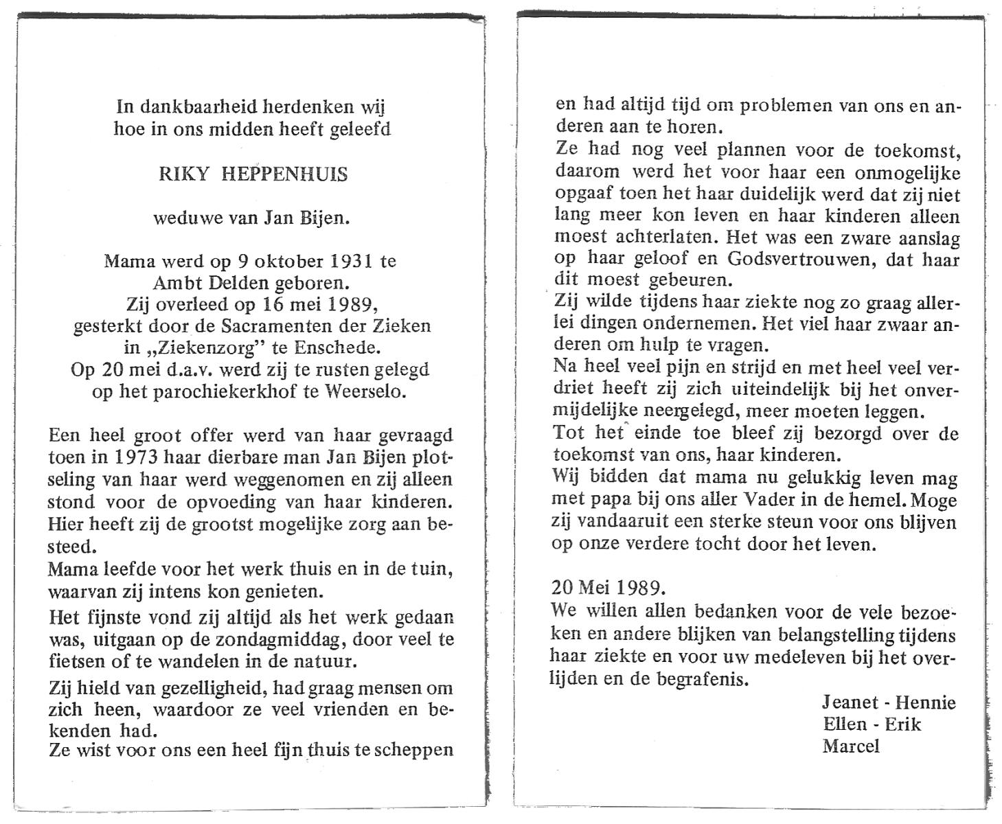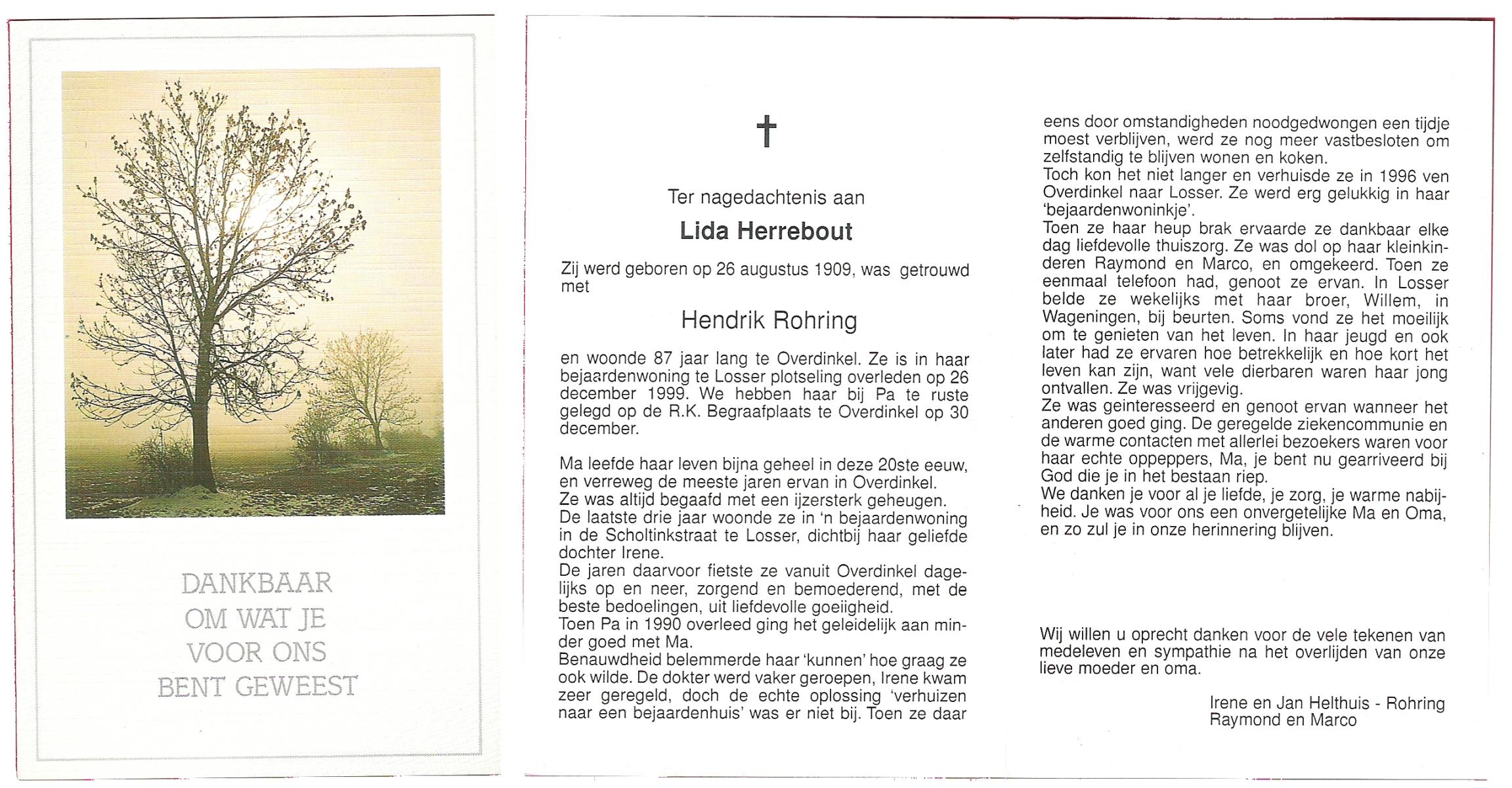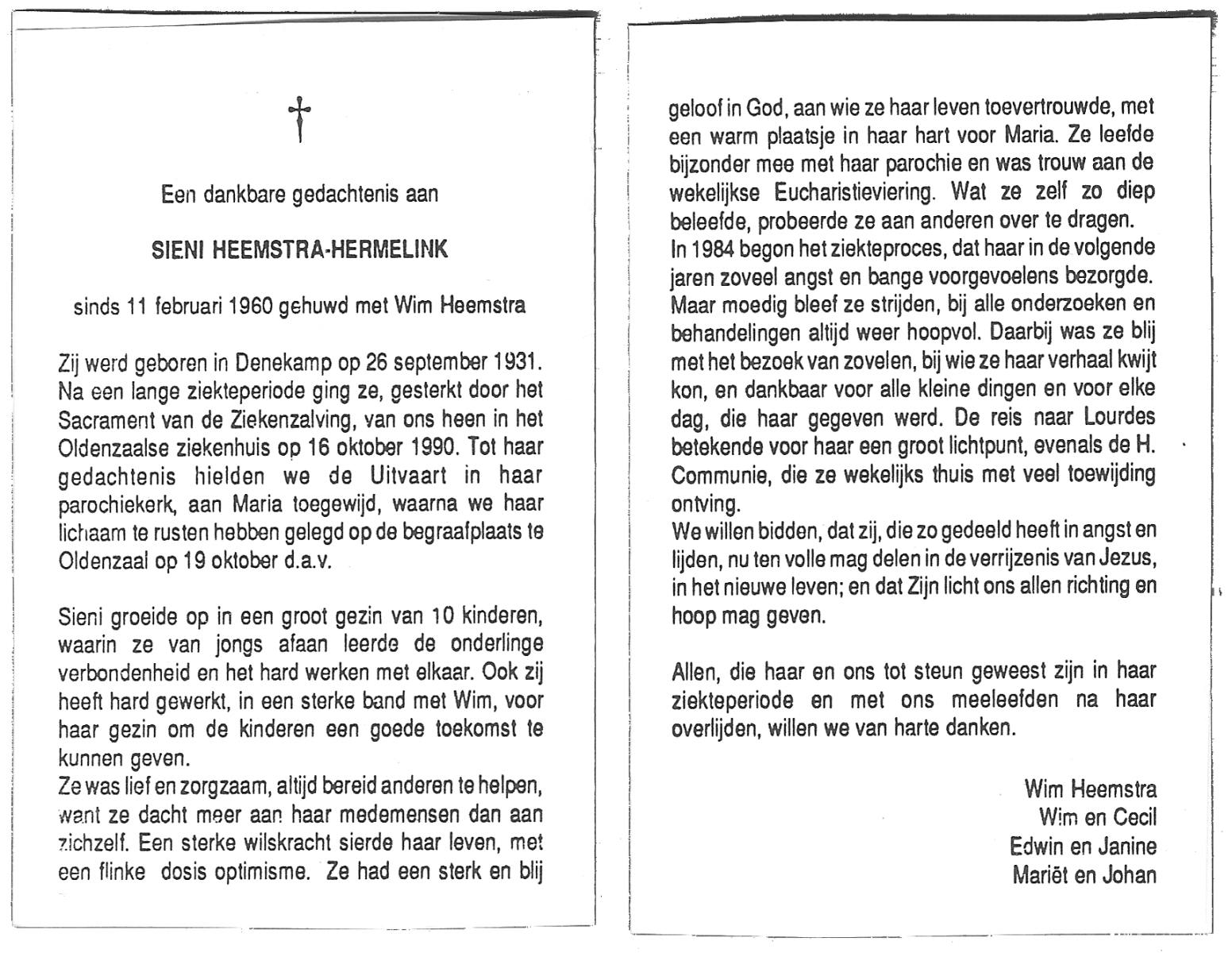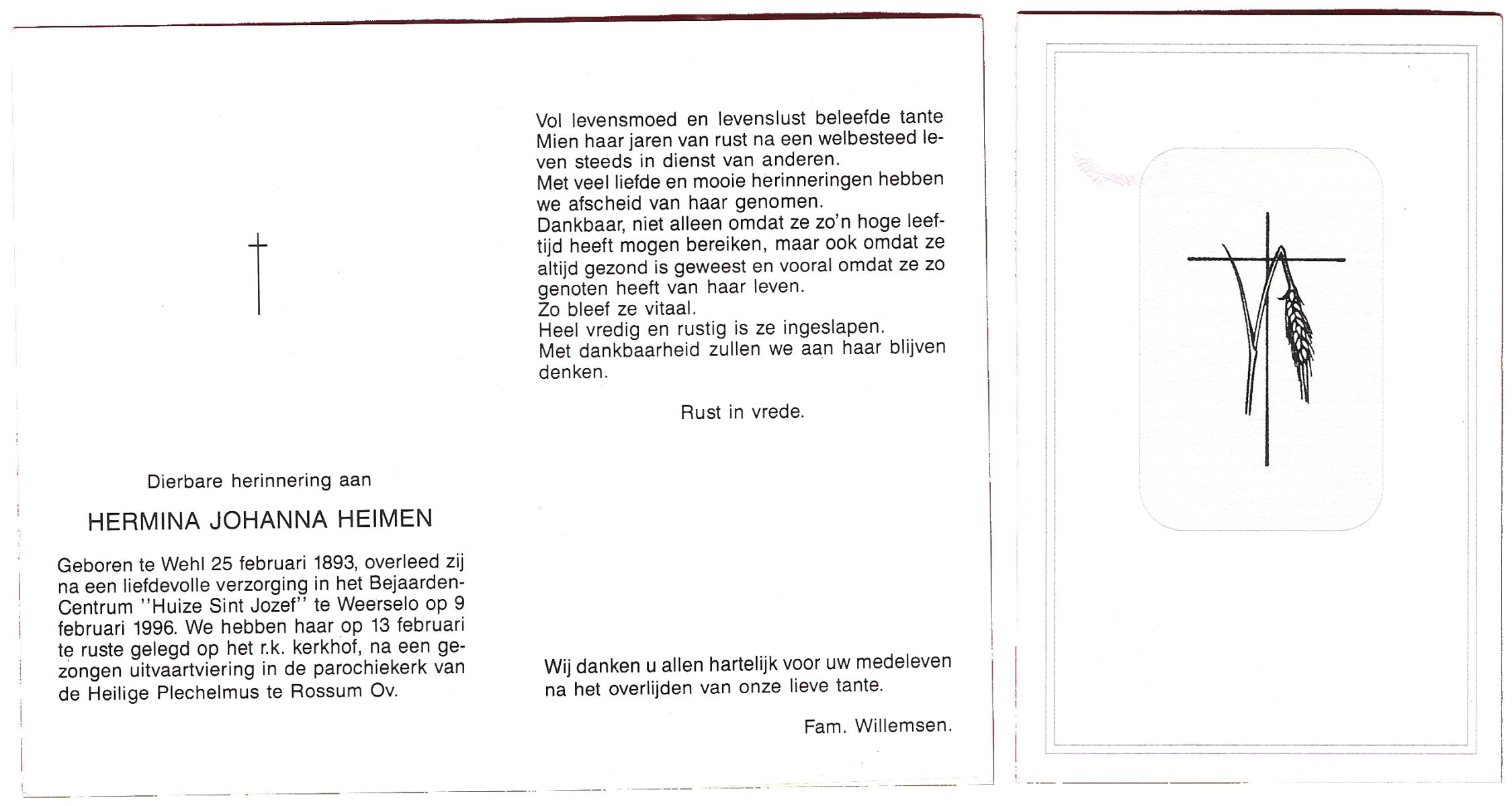 HEIMEN, Hermina Johanna, geboren op 25-02-1893 te Wehl, overleden op 9-2-1996 te Weerselo op 96-jarige leeftijd, begraven op 13-2-1996 te Rossum.