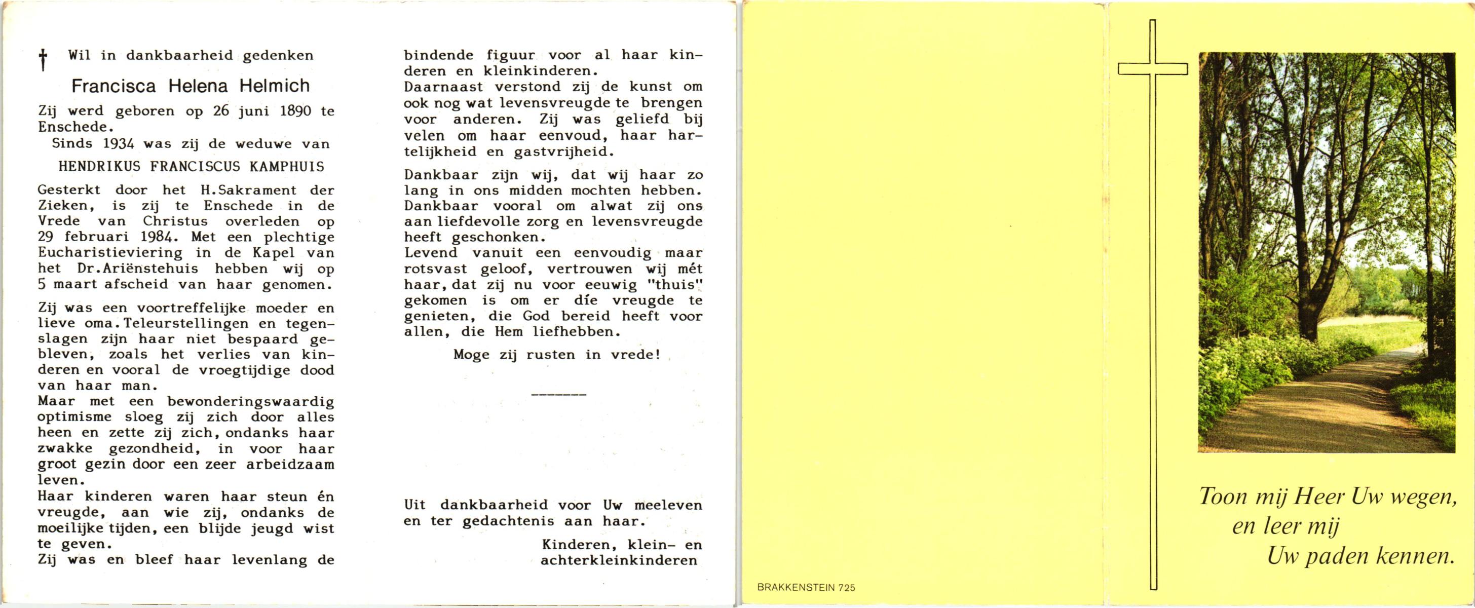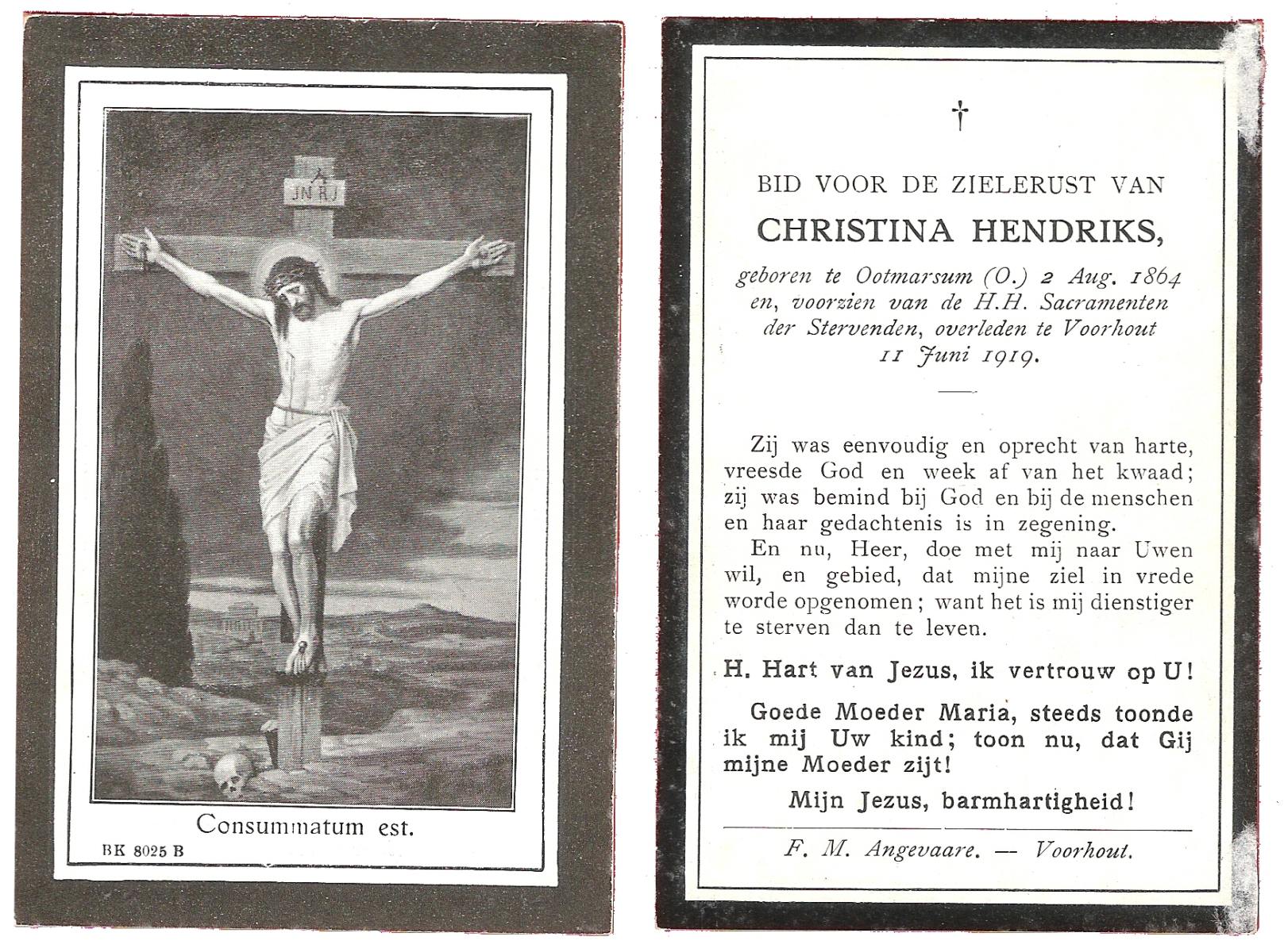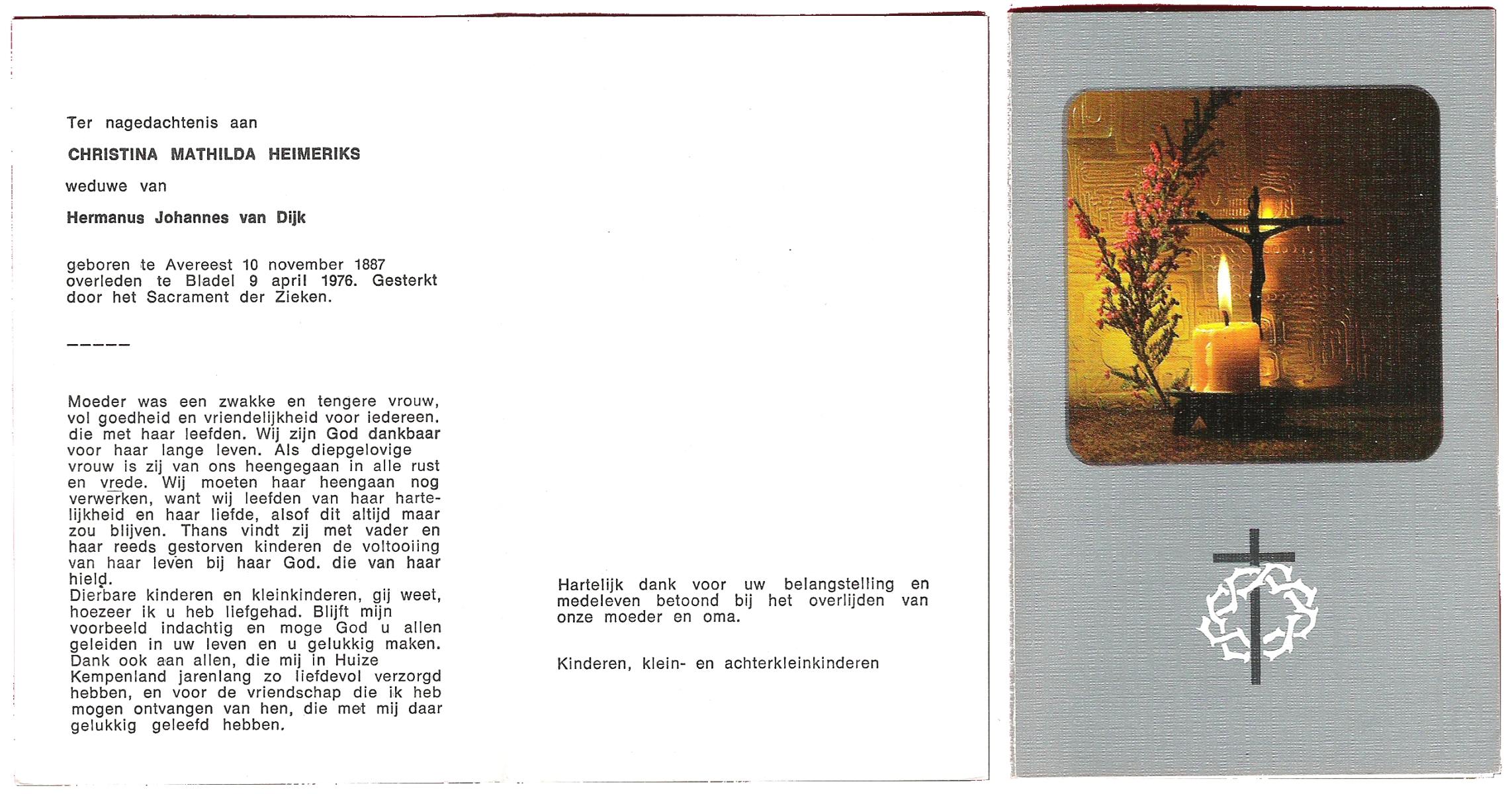 HEIMERIKS, Christina Mathilda, geboren op 10-11-1887 te Avereest, overleden op 9-4-1976 te Bladel op 88-jarige leeftijd.