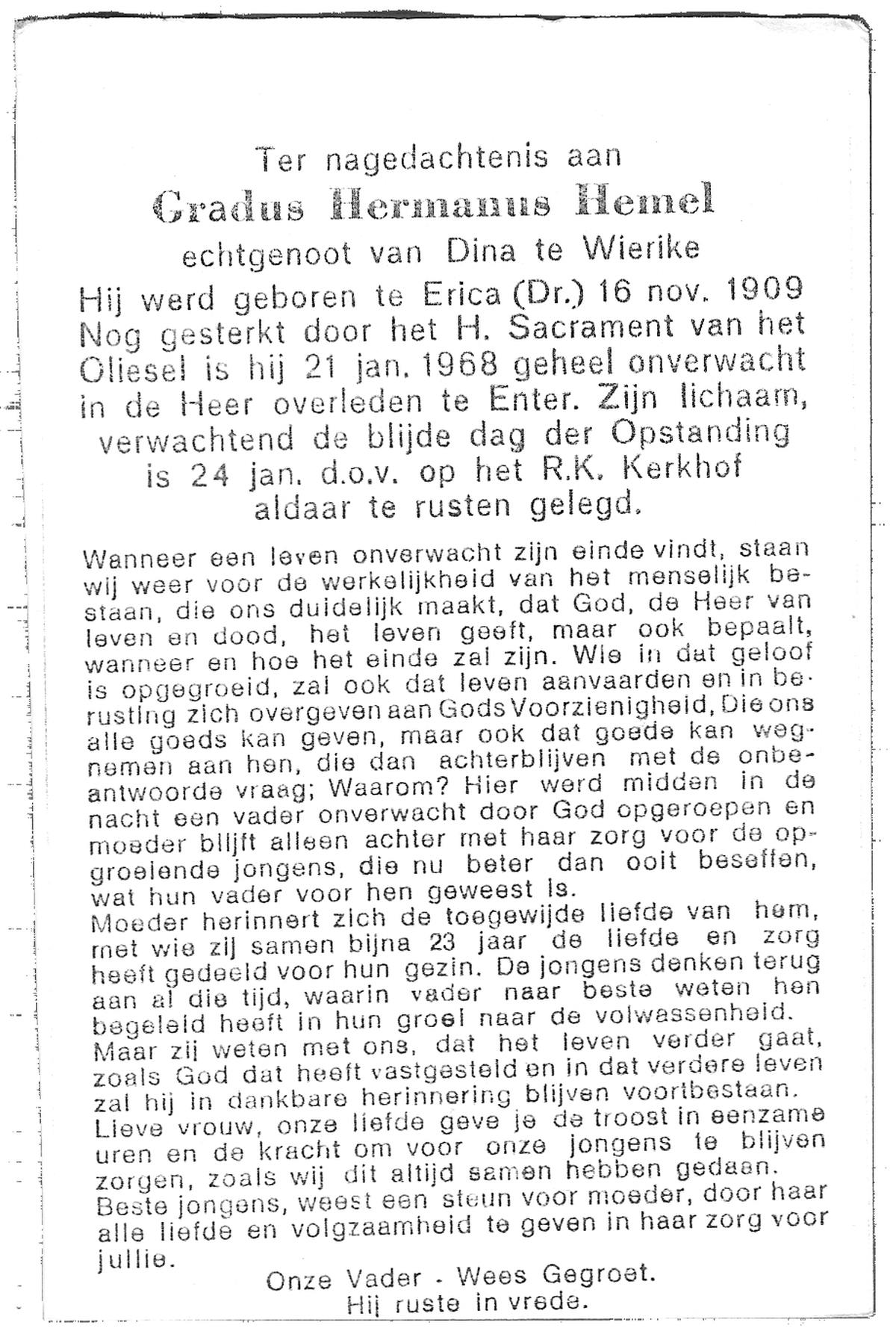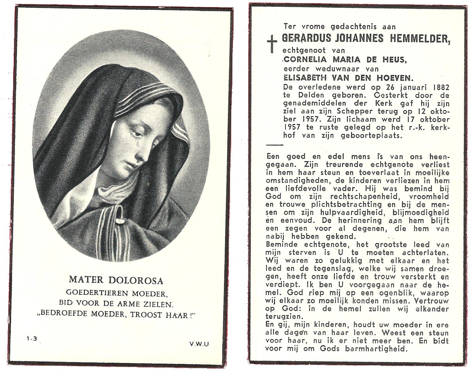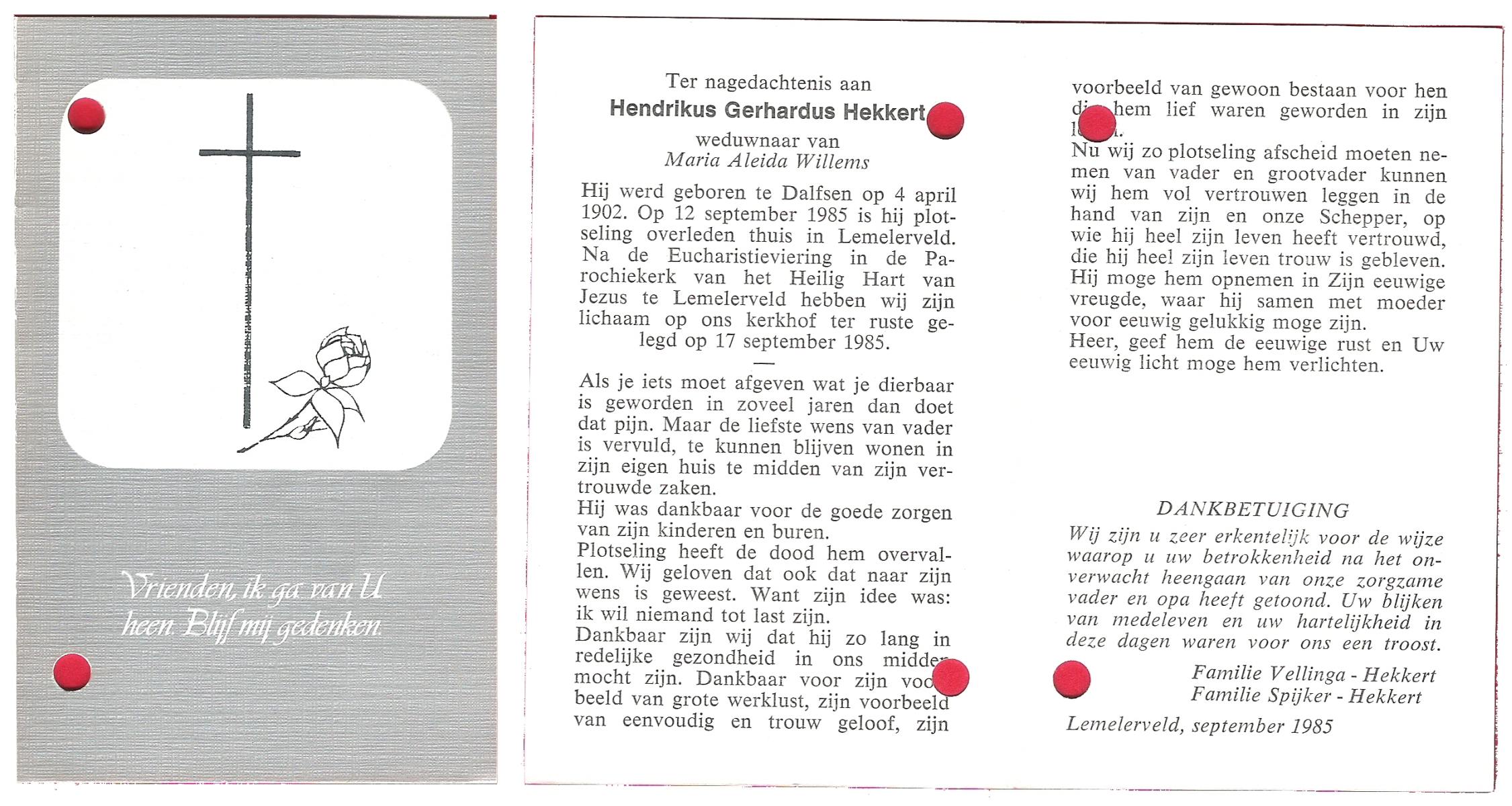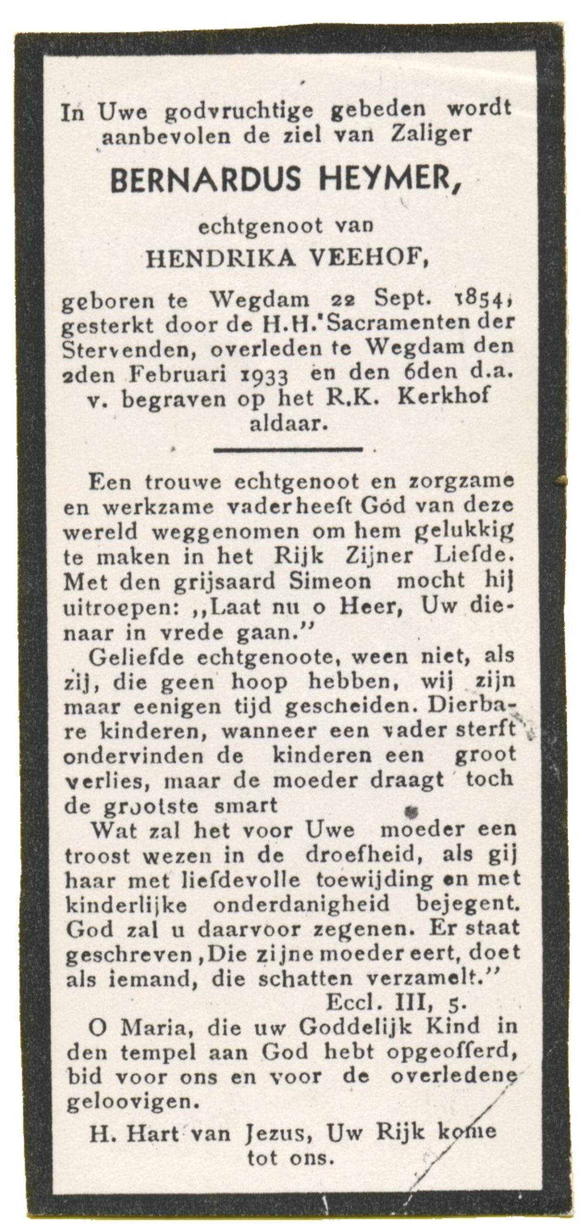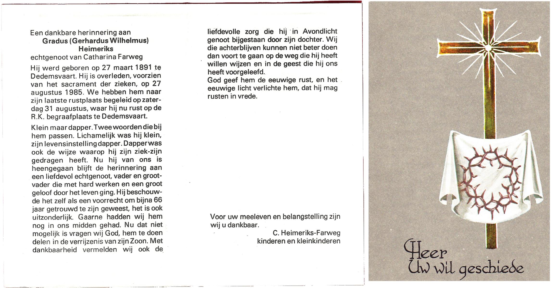 HEIMERIKS, Gradus (Gerhardus Wilhelmus), geboren op 27-03-1891 te Dedemsvaart, overleden op 27-8-1985 op 94-jarige leeftijd, begraven op 31-8-1985 te Dedemsvaart.