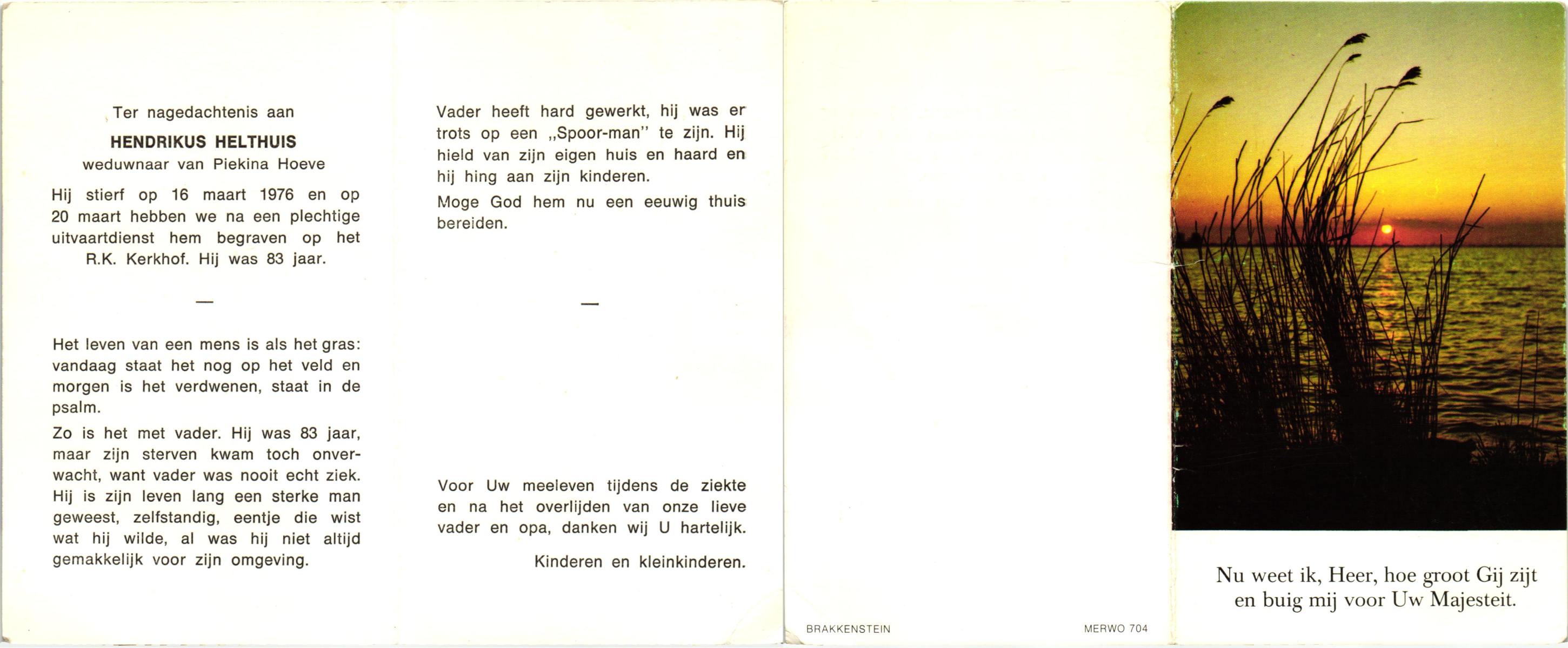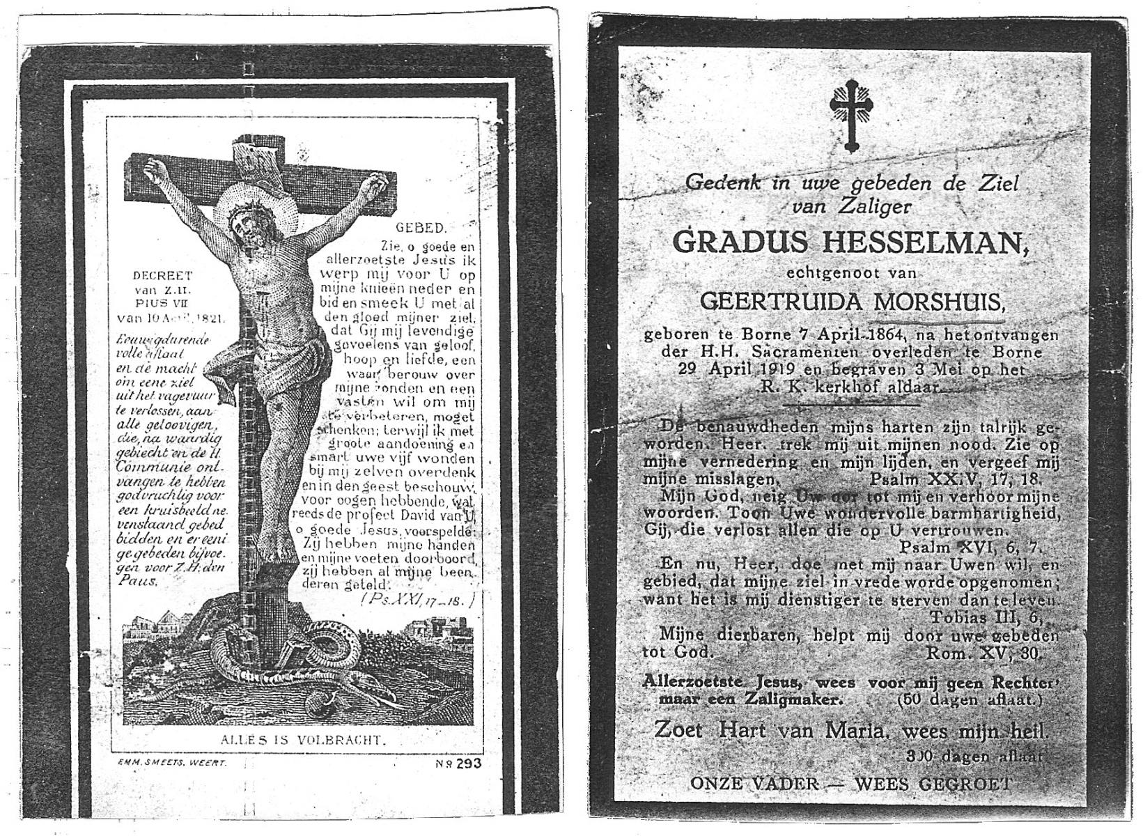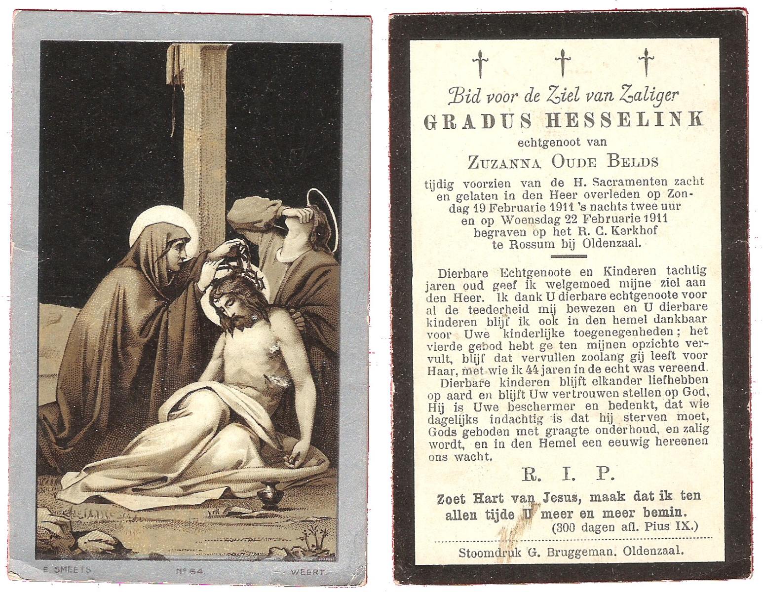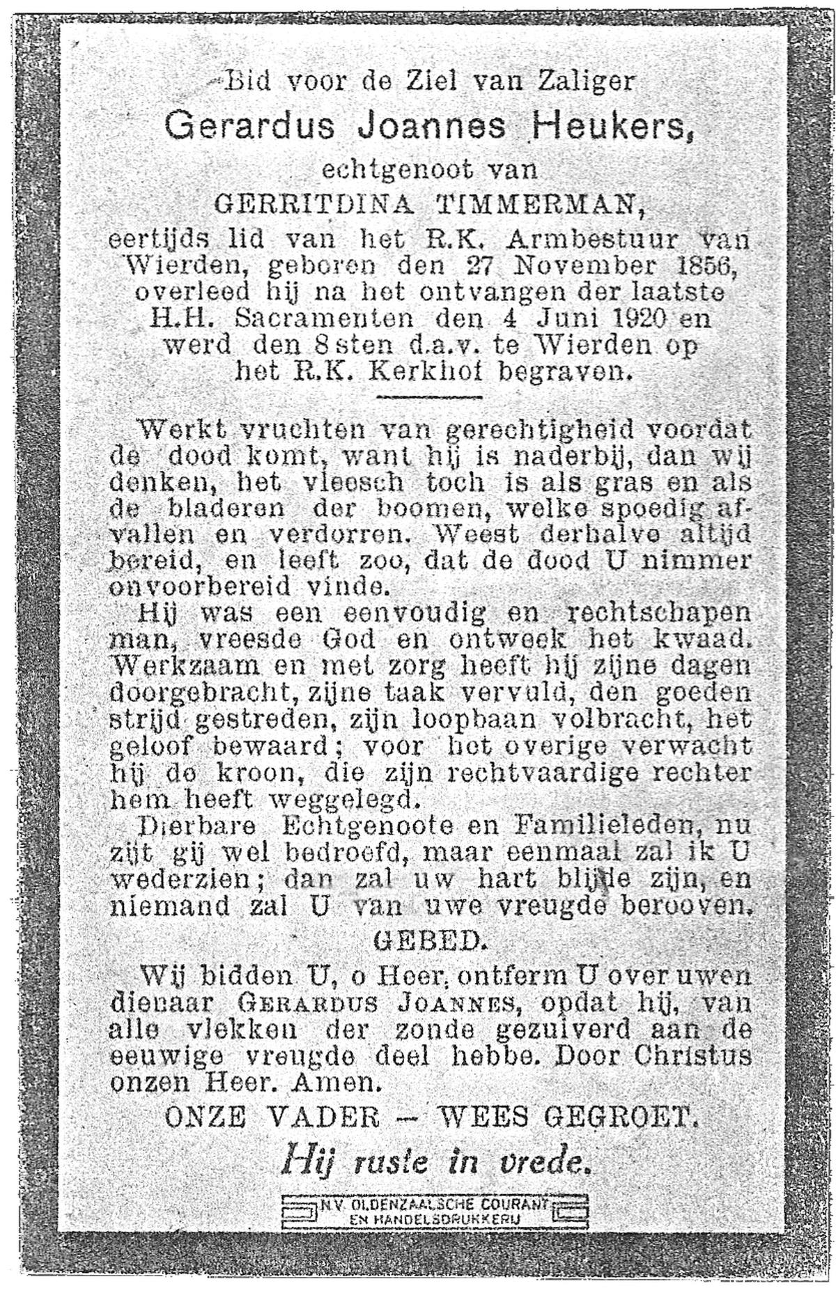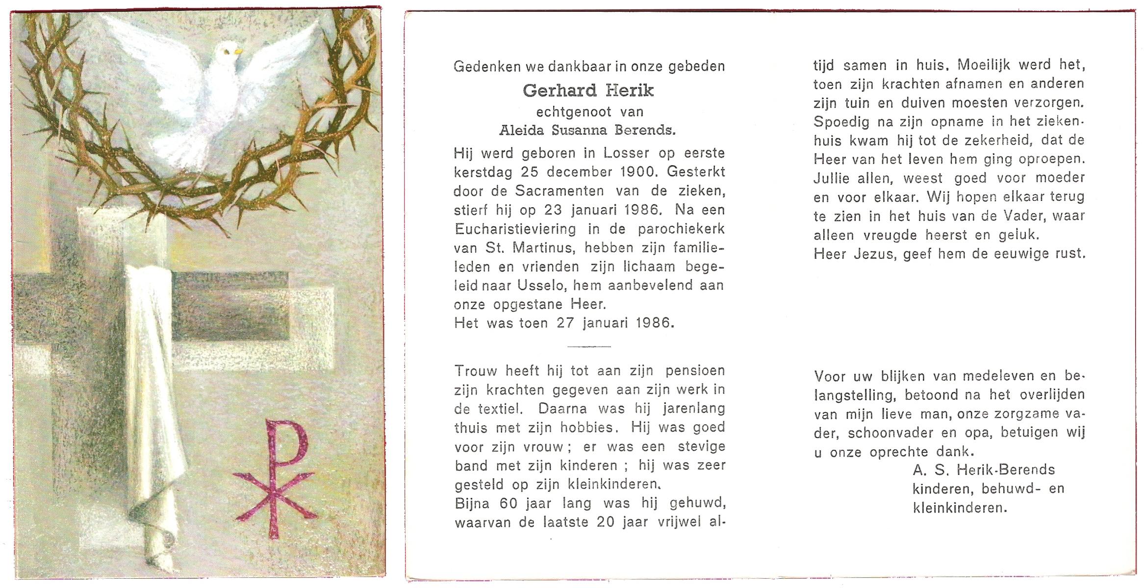 HEIMERIKS, Gradus (Gerhardus Wilhelmus), geboren op 27-03-1891 te Dedemsvaart, overleden op 27-8-1985 op 94-jarige leeftijd, begraven op 31-8-1985 te Dedemsvaart.