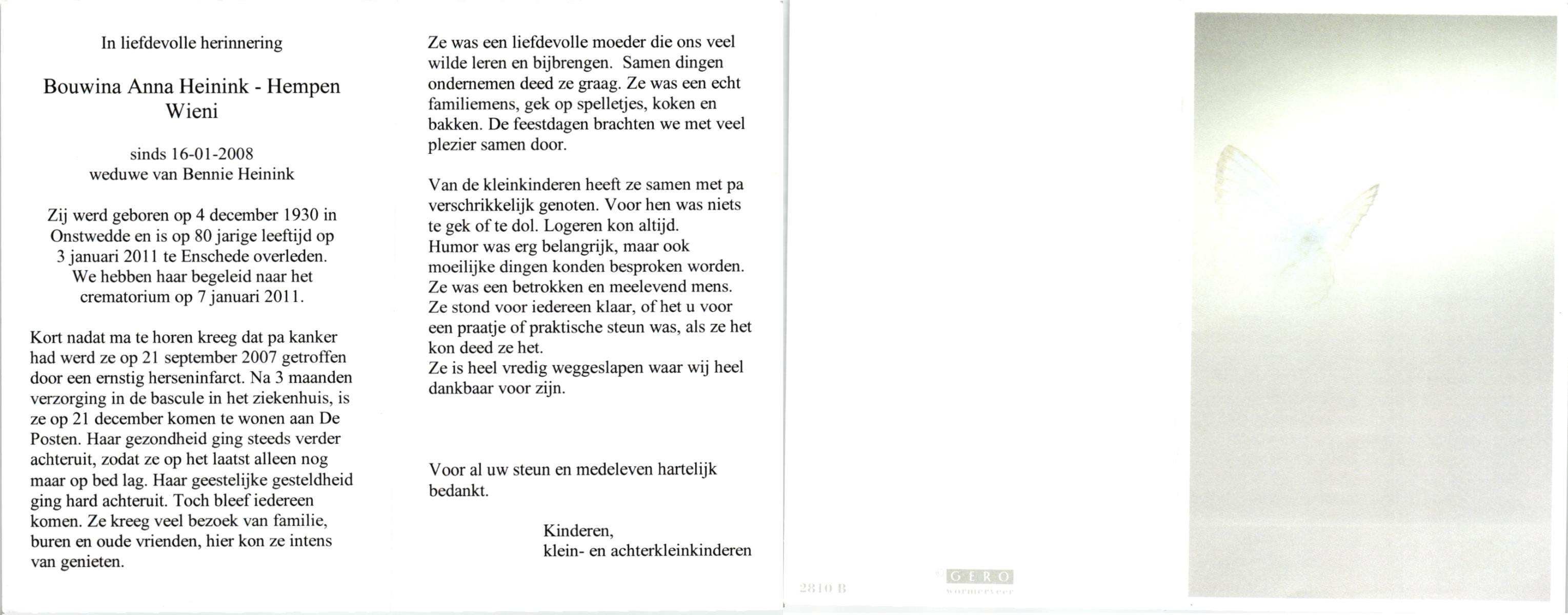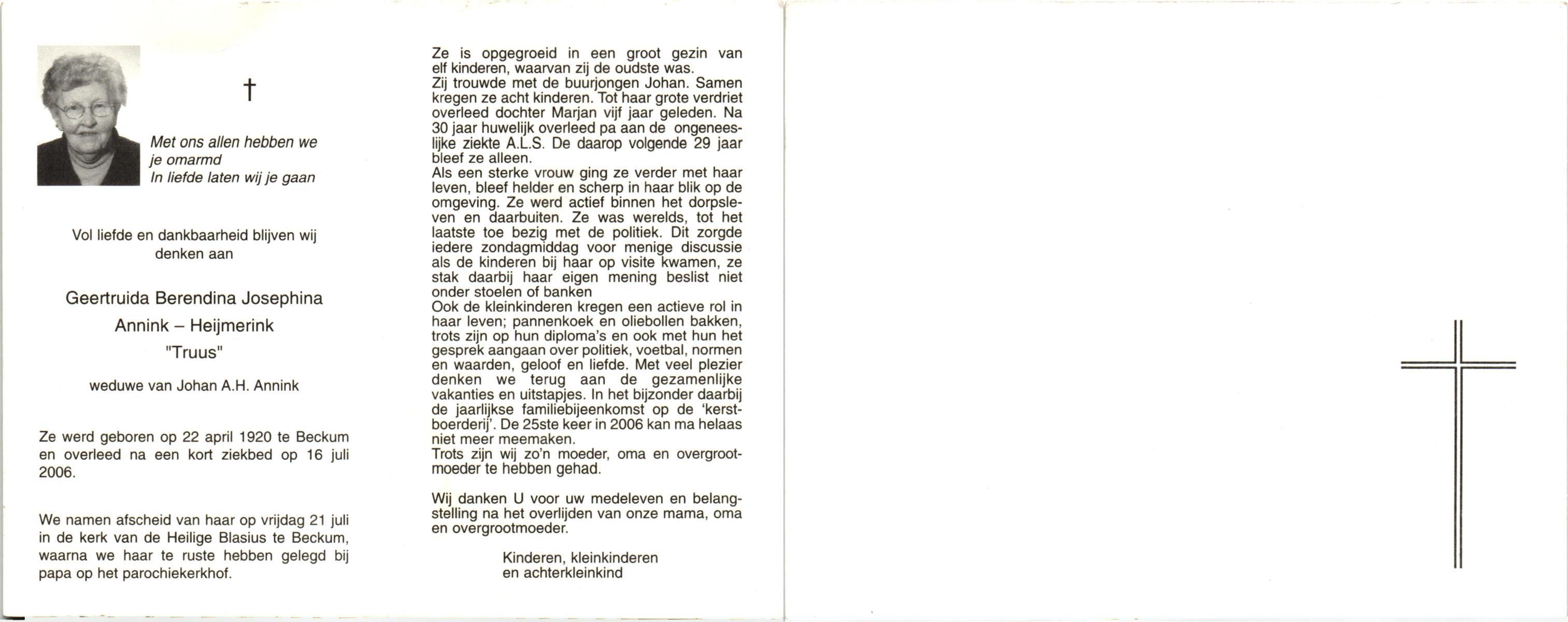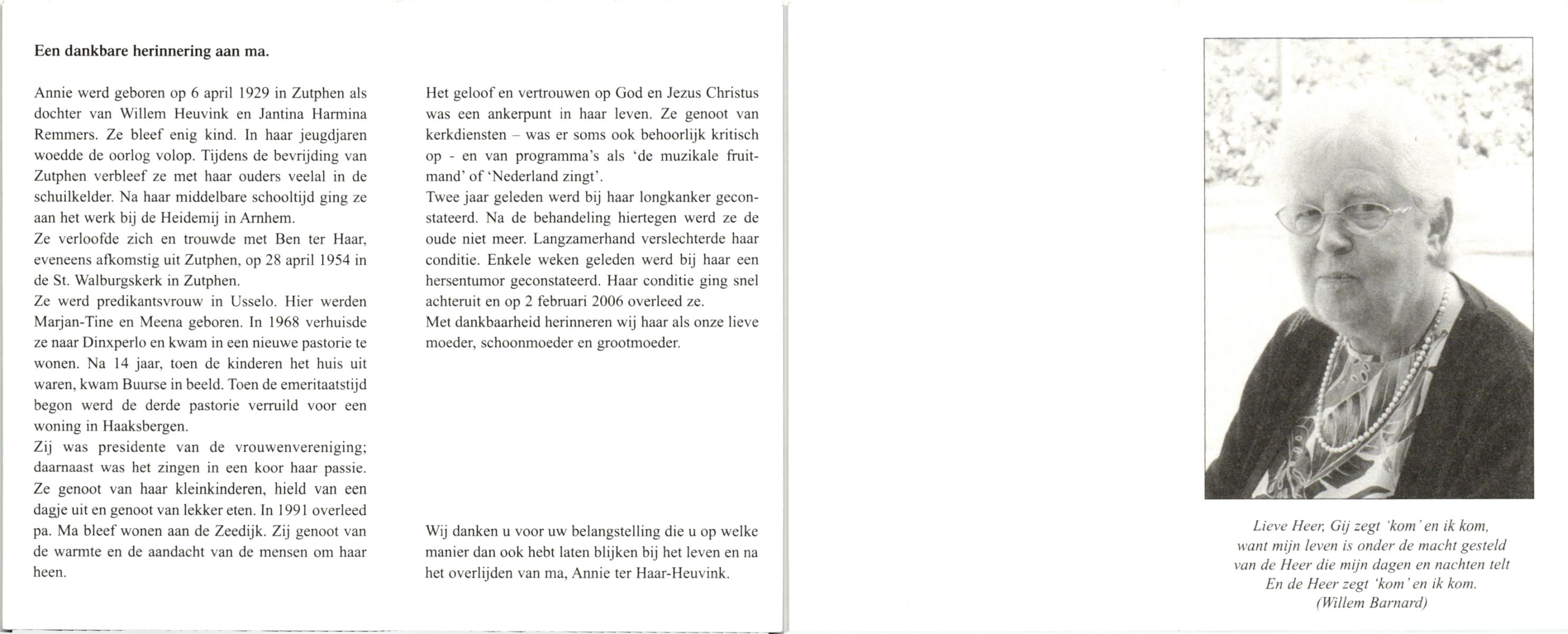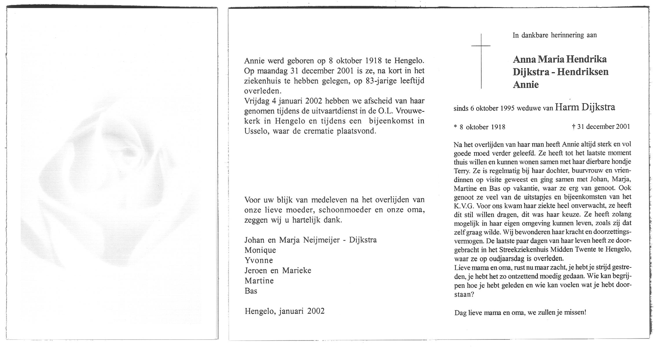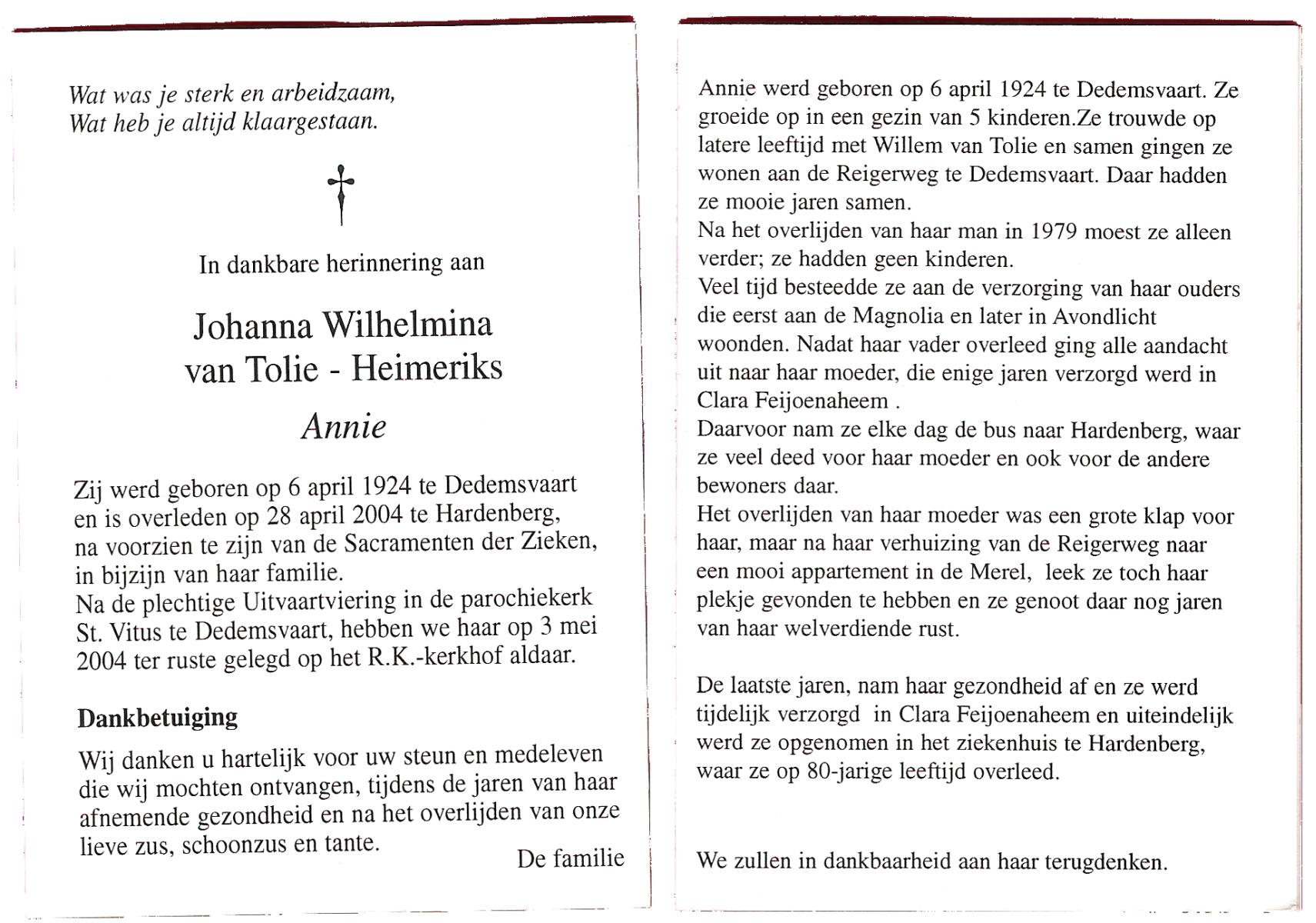 HEIMERIKS, Johanna Wilhelmina (Annie), geboren op 6-4-1924 te Dedemsvaart, overleden op 28-4-2004 te Hardenberg op 80-jarige leeftijd, begraven op 3-5-2004 te Dedemsvaart.