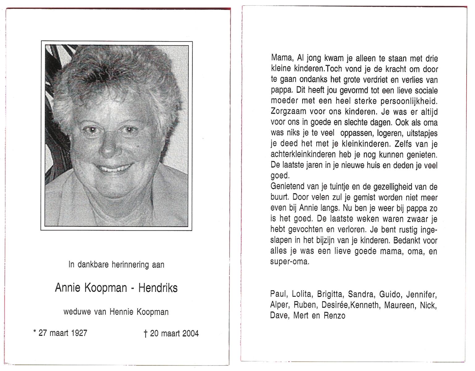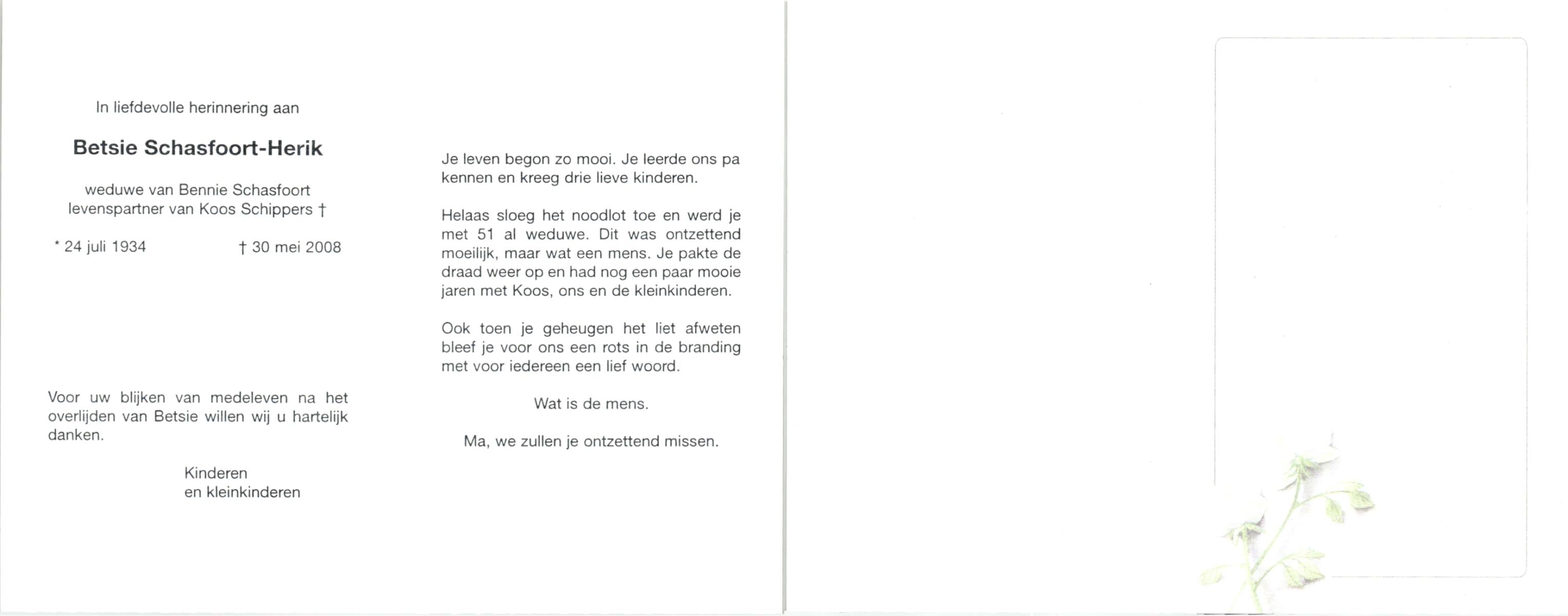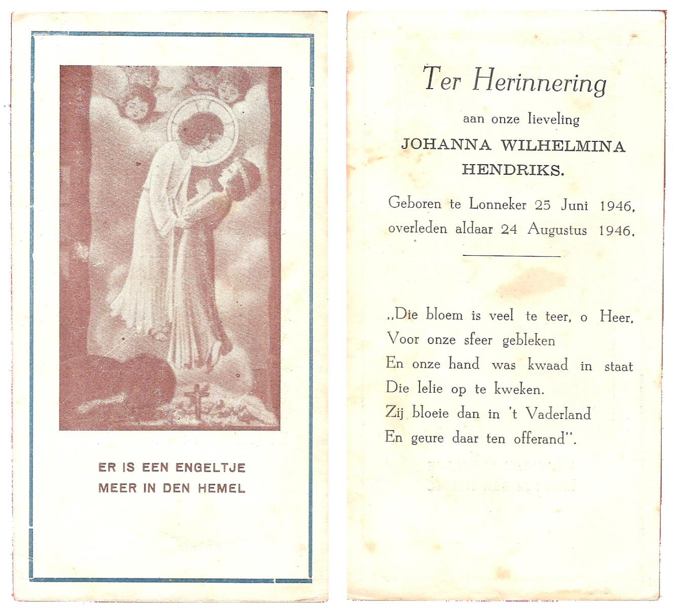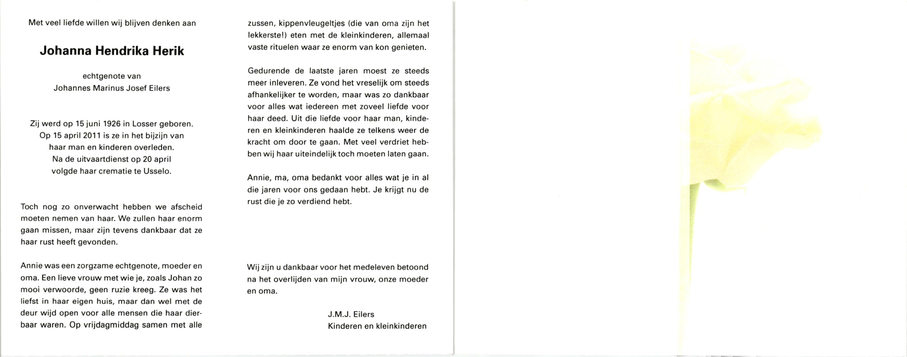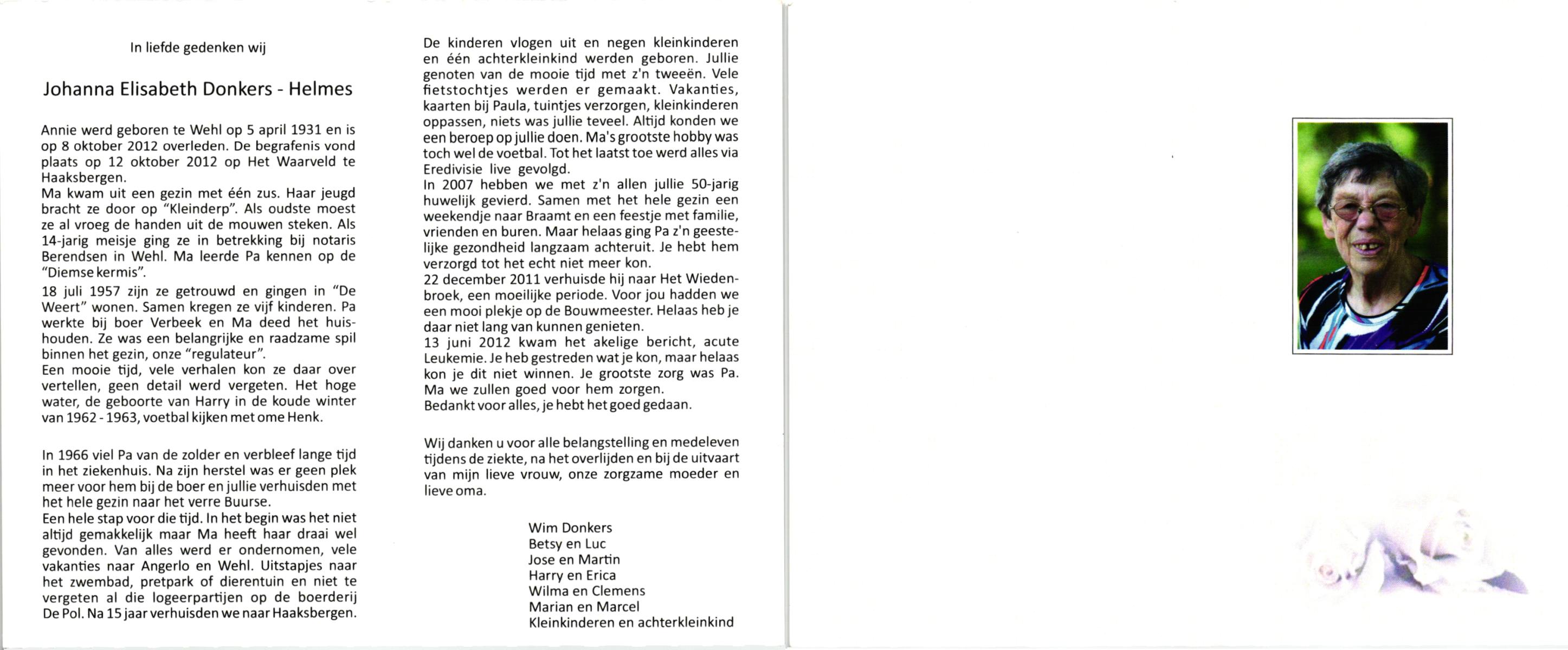 HEIMERIKS, Johanna Wilhelmina (Annie), geboren op 6-4-1924 te Dedemsvaart, overleden op 28-4-2004 te Hardenberg op 80-jarige leeftijd, begraven op 3-5-2004 te Dedemsvaart.