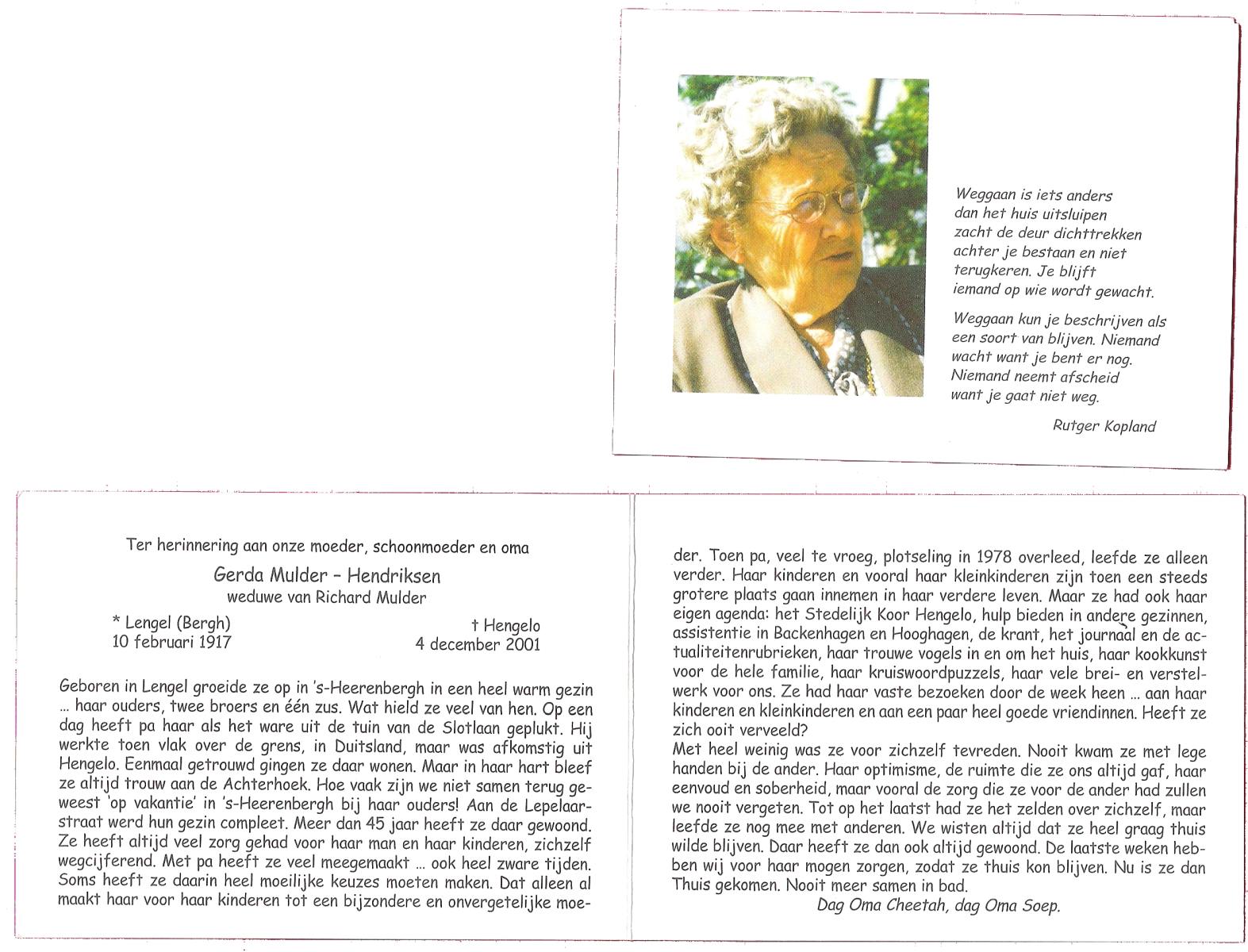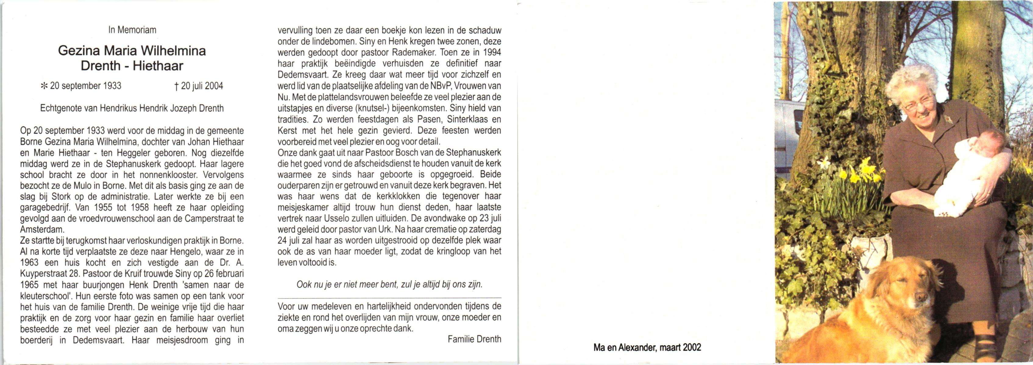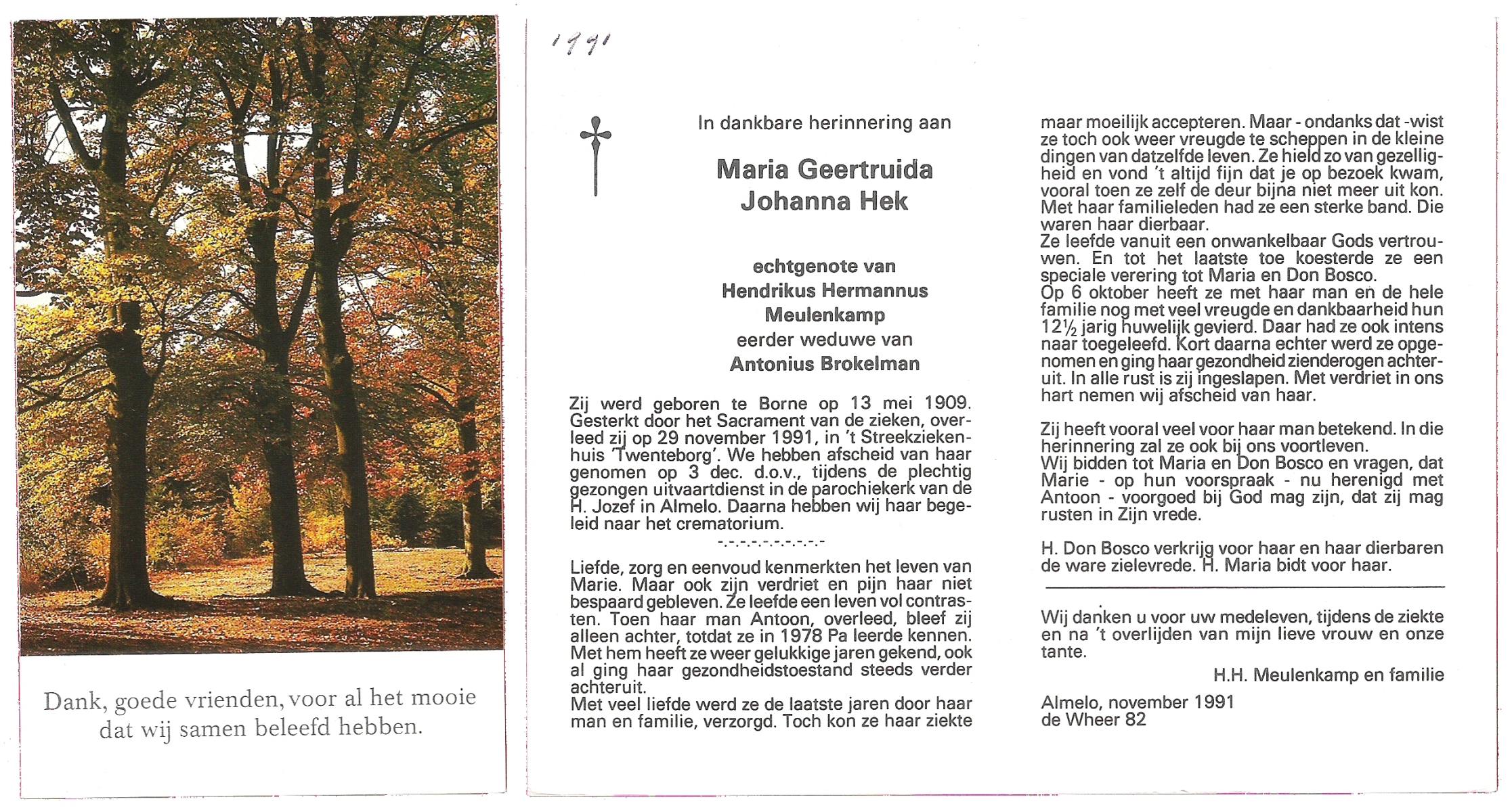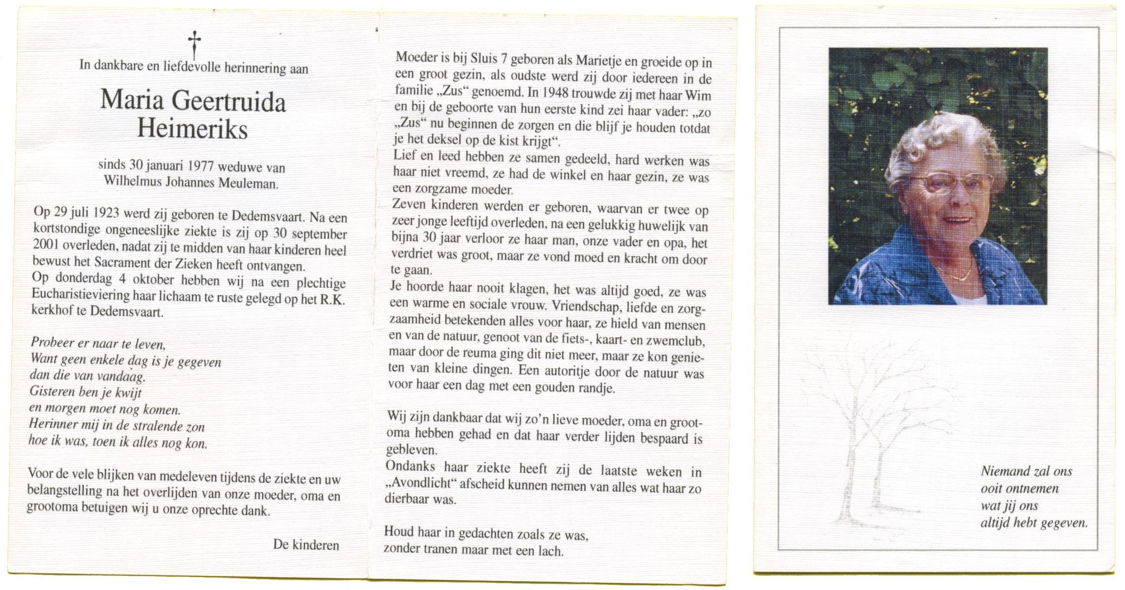 HEIMERIKS, Maria Geertruida, geboren op 29-7-1923 te Dedemsvaart, overleden op 30-9-2001 op 78-jarige leeftijd, begraven op 4-10-2001 te Dedemsvaart.