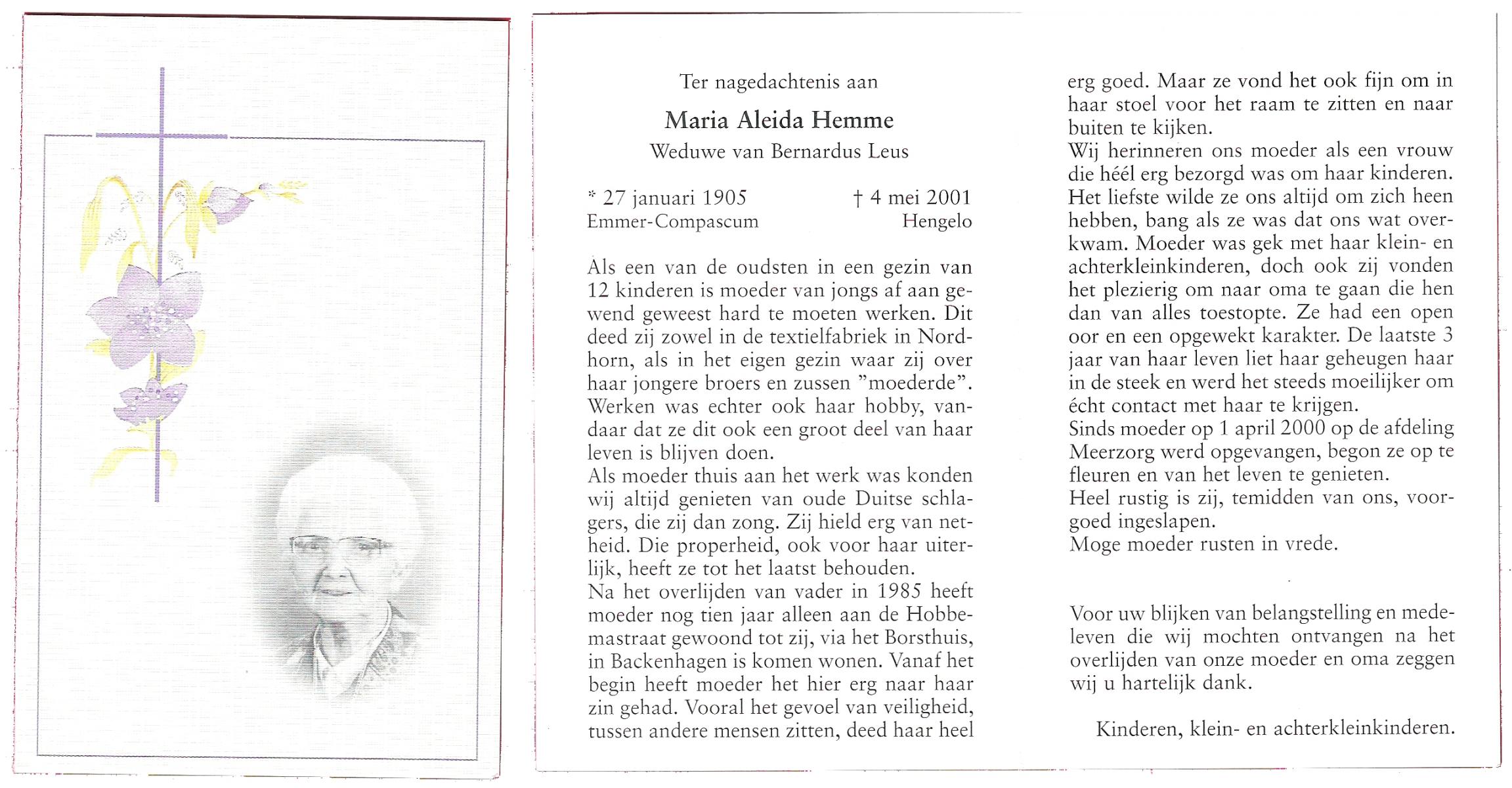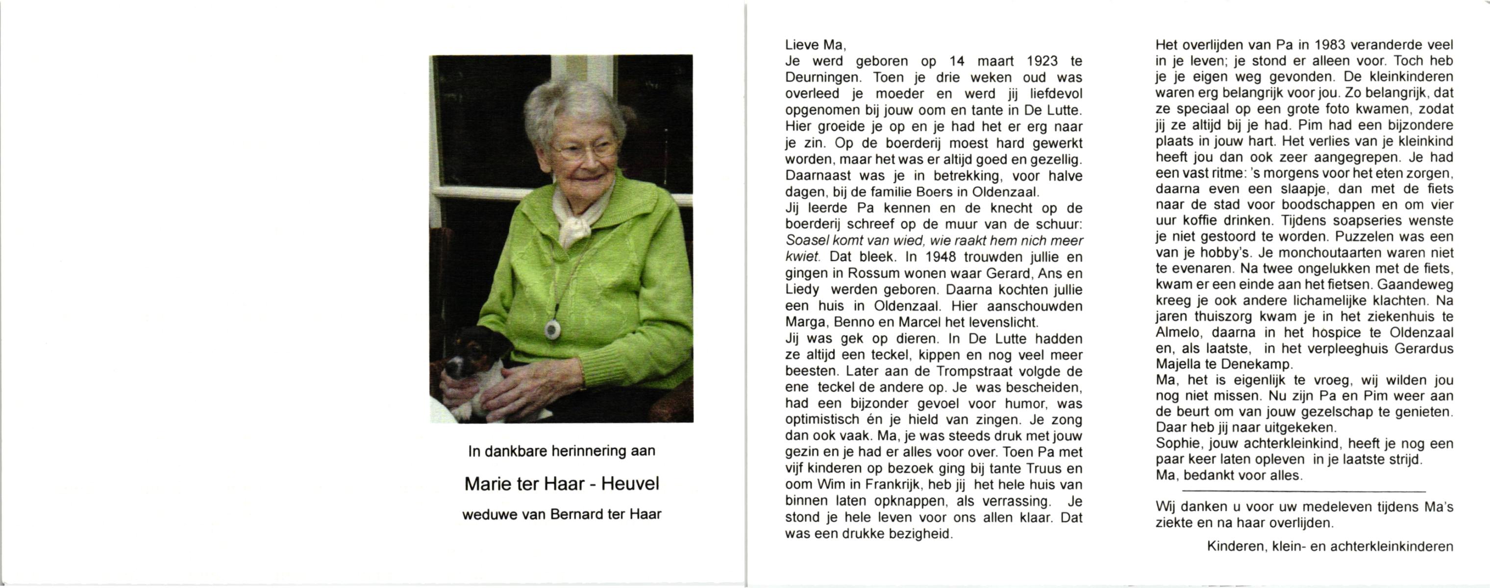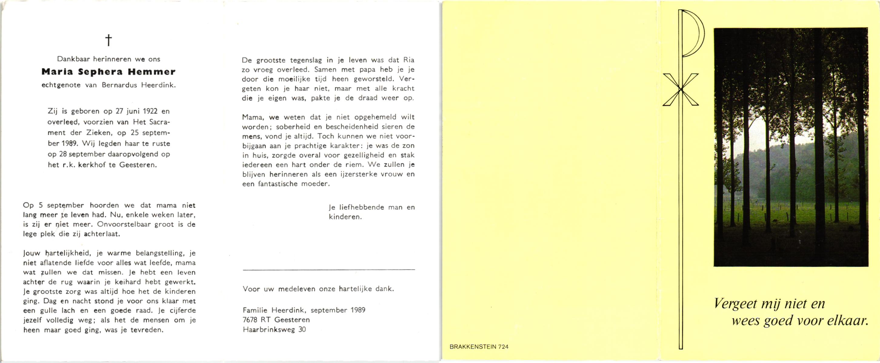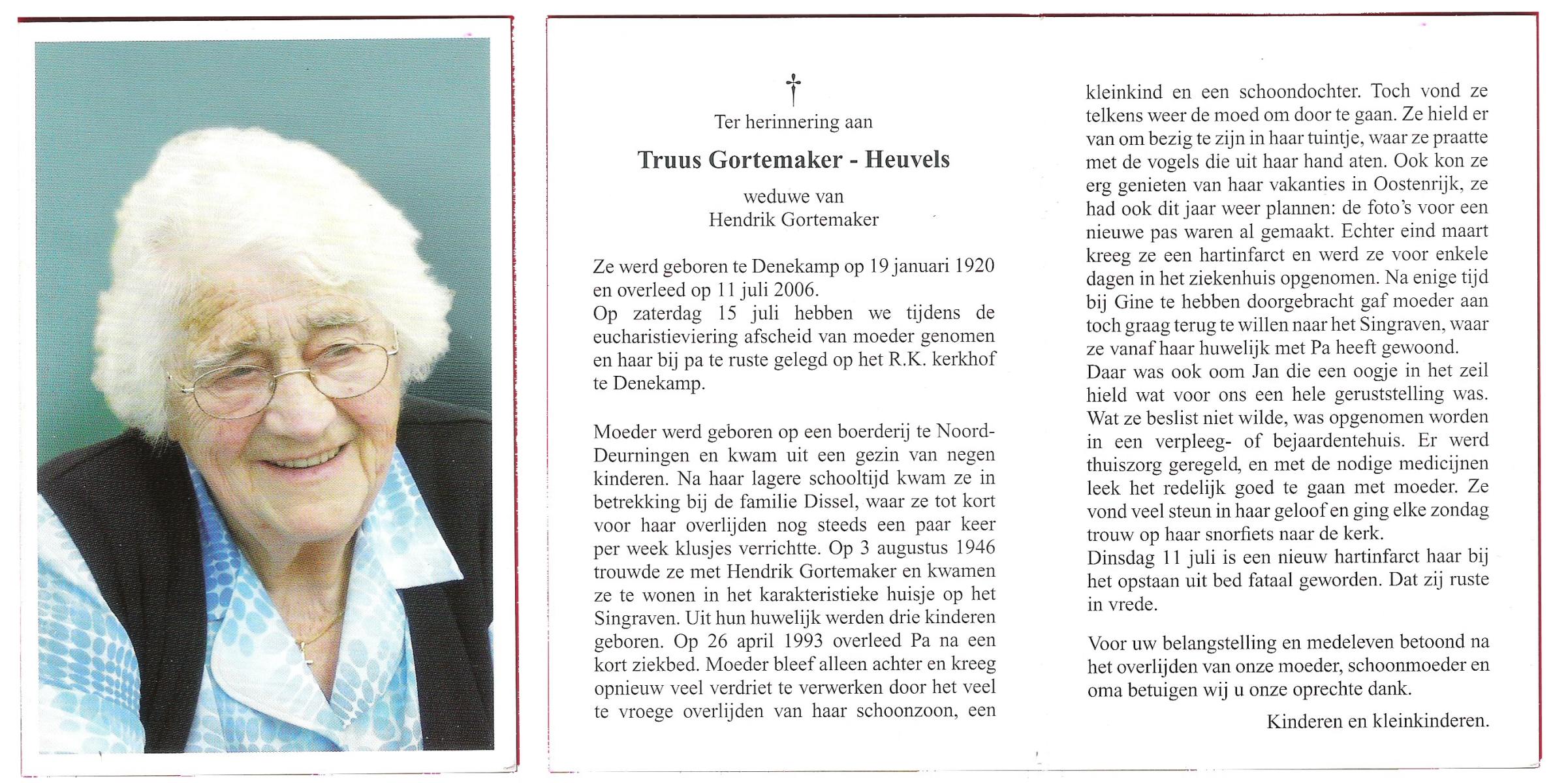 HEIMERIKS, Maria Geertruida, geboren op 29-7-1923 te Dedemsvaart, overleden op 30-9-2001 op 78-jarige leeftijd, begraven op 4-10-2001 te Dedemsvaart.