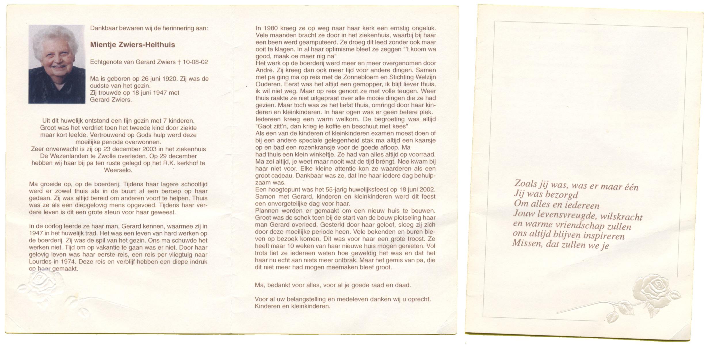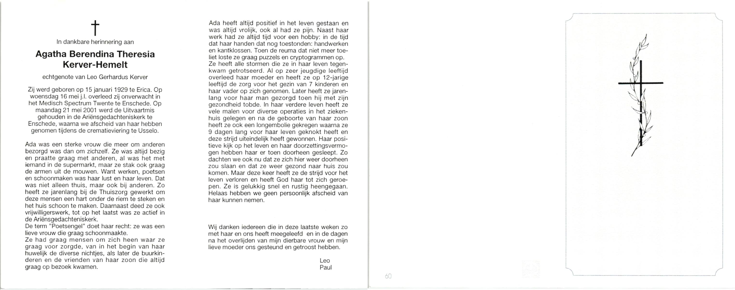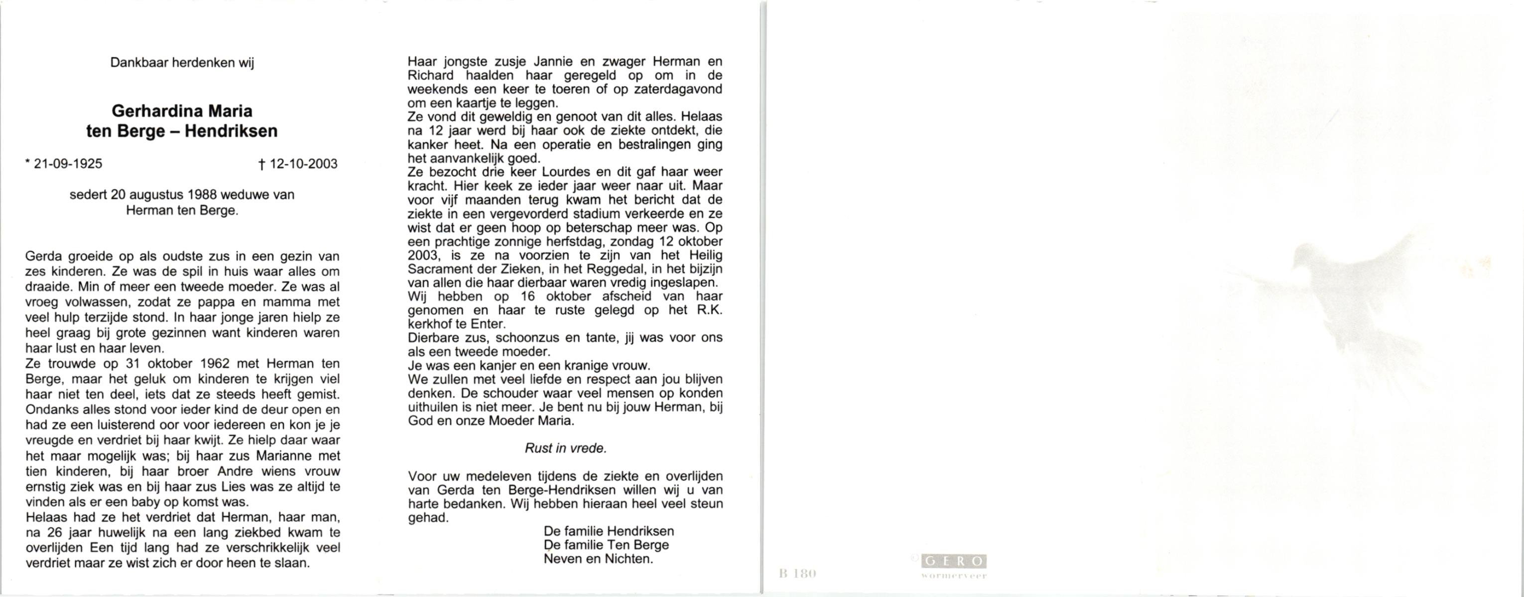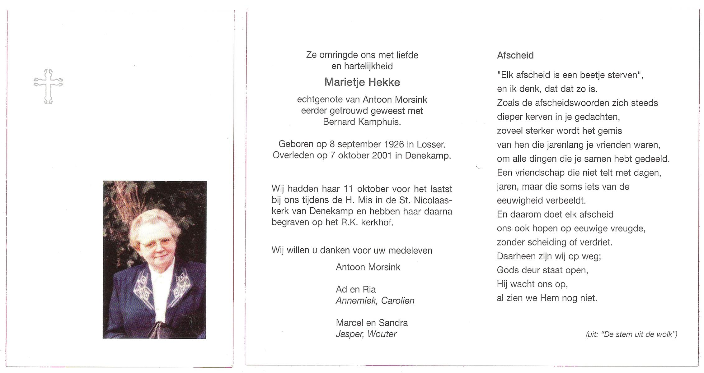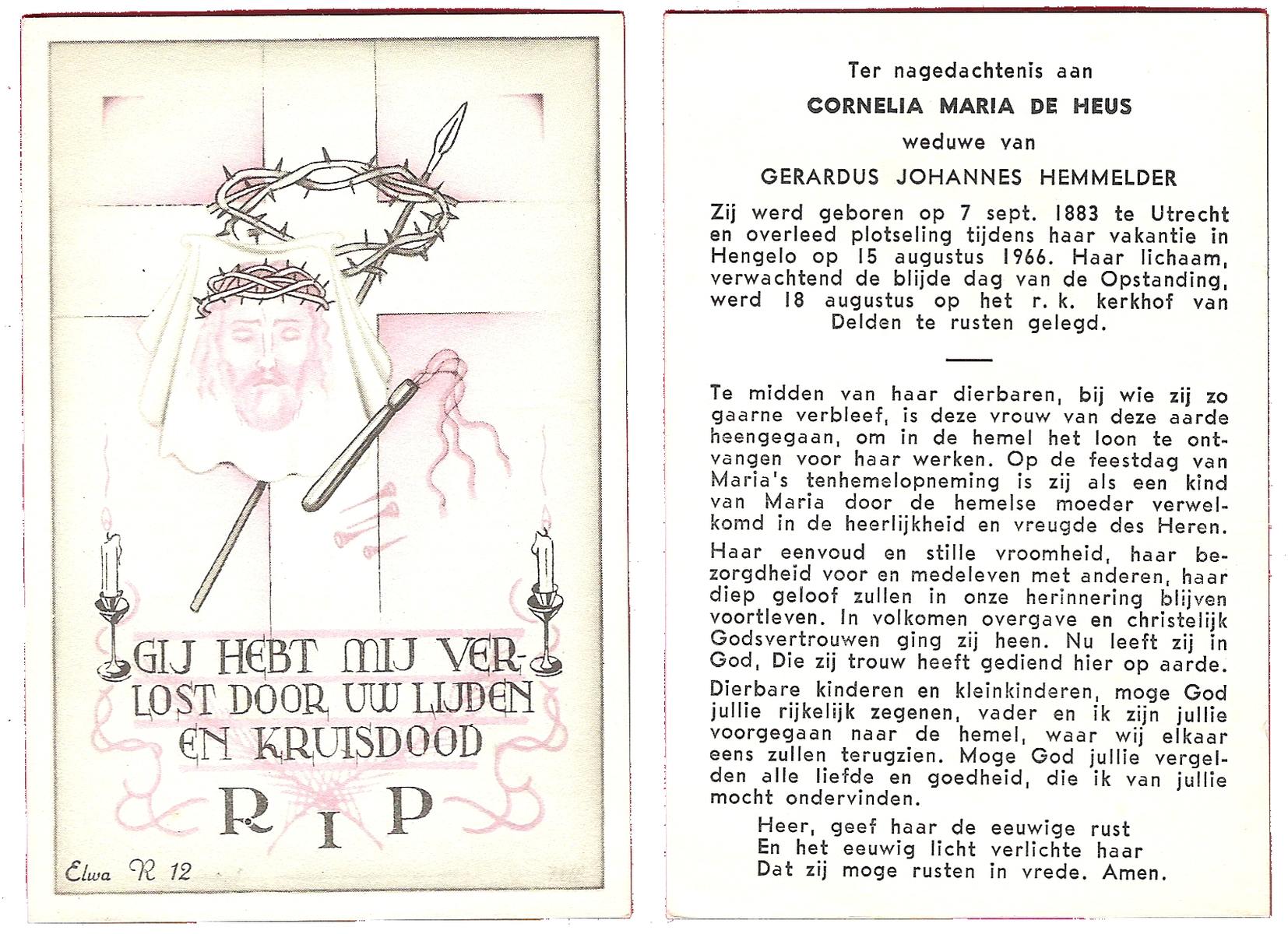 HEIMERIKS, Maria Geertruida, geboren op 29-7-1923 te Dedemsvaart, overleden op 30-9-2001 op 78-jarige leeftijd, begraven op 4-10-2001 te Dedemsvaart.