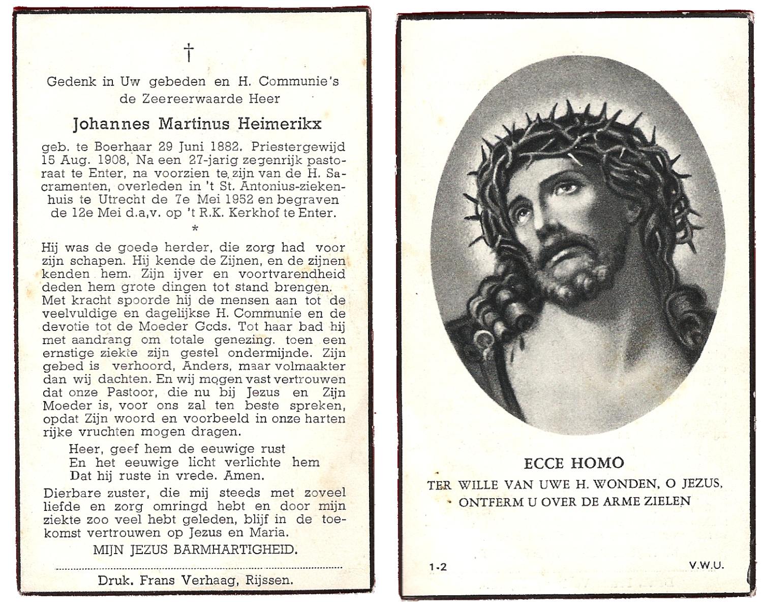 HEIMERIKX, Johannes Martinus, geboren op 29-06-1882 te Boerhaar, overleden op 7-5-1952 te Utrecht op 69-jarige leeftijd, begraven op 12-5-1952 te Enter.
