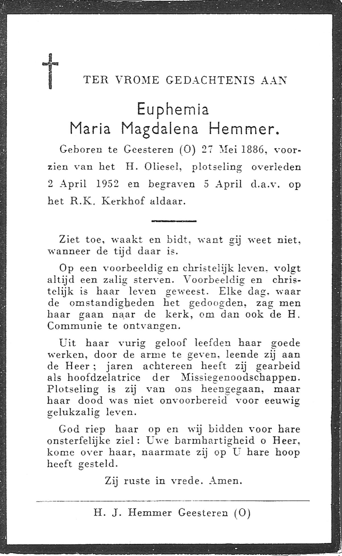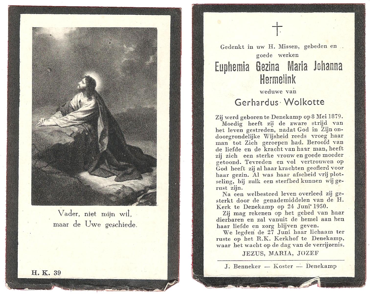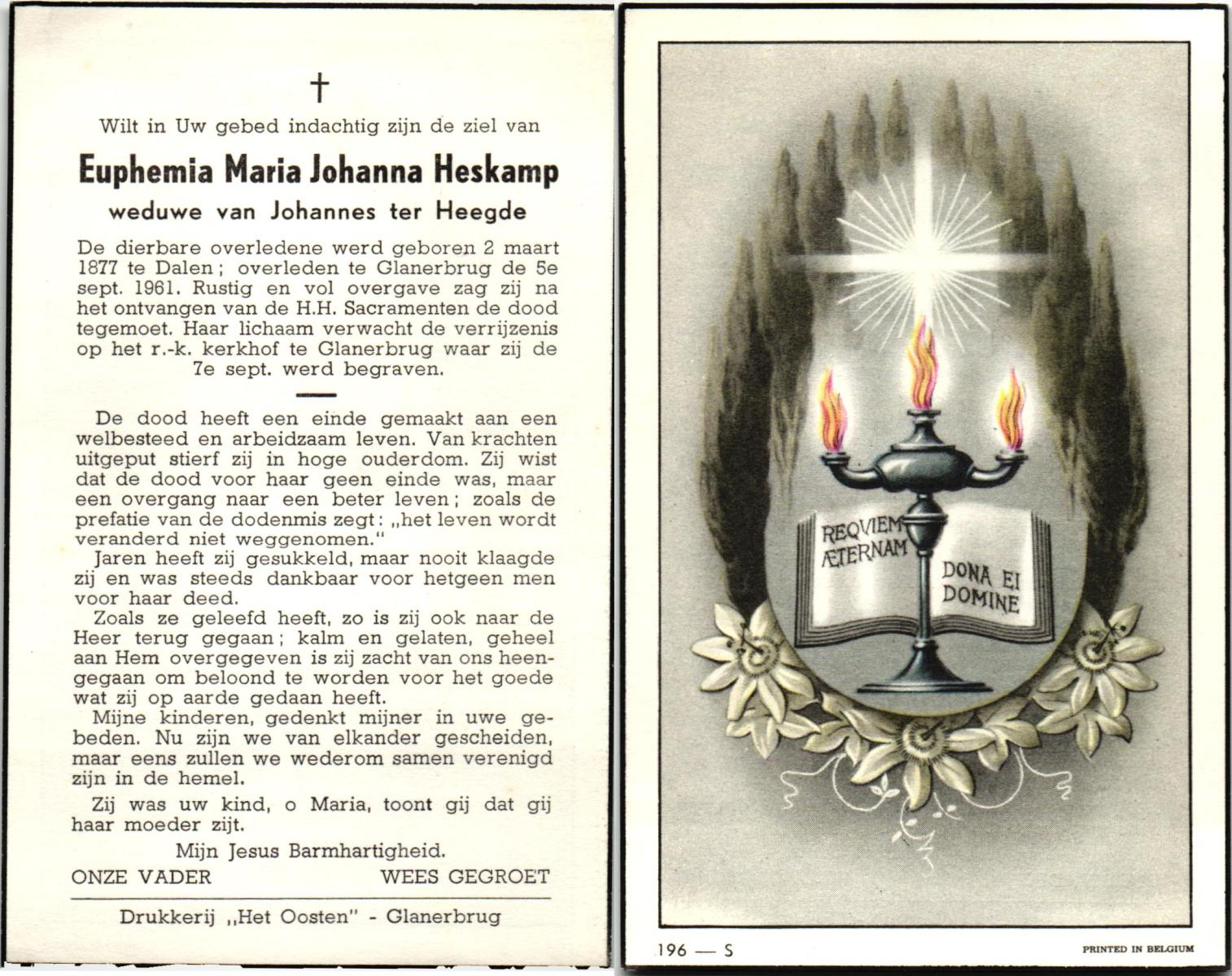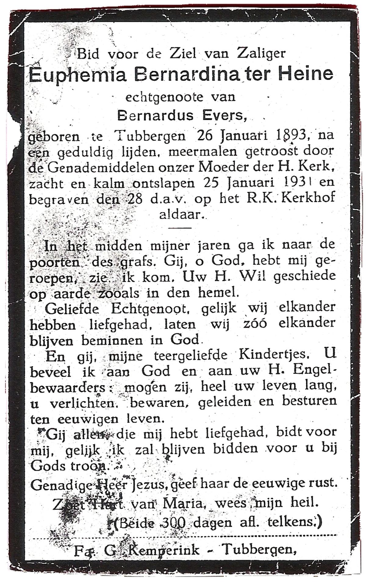 HEINE, ter, Euphemia Bernardina, geboren op 26-01-1893 te Tubbergen, overleden op 25-1-1931 te Tubbergen op 37-jarige leeftijd, begraven op 28-1-1931 te Tubbergen.