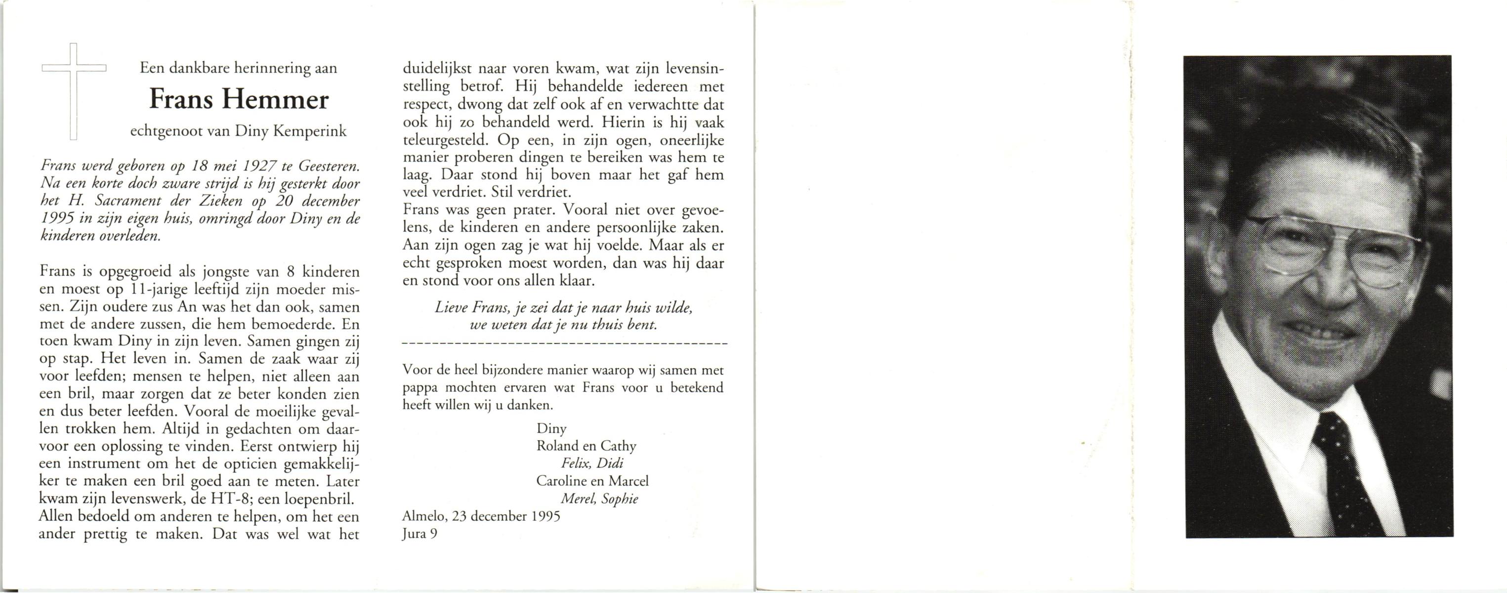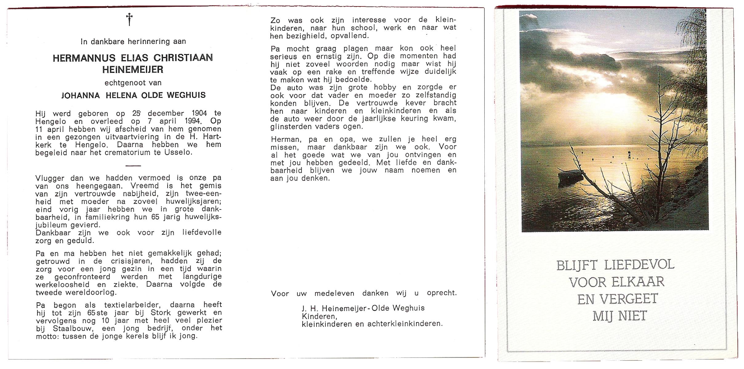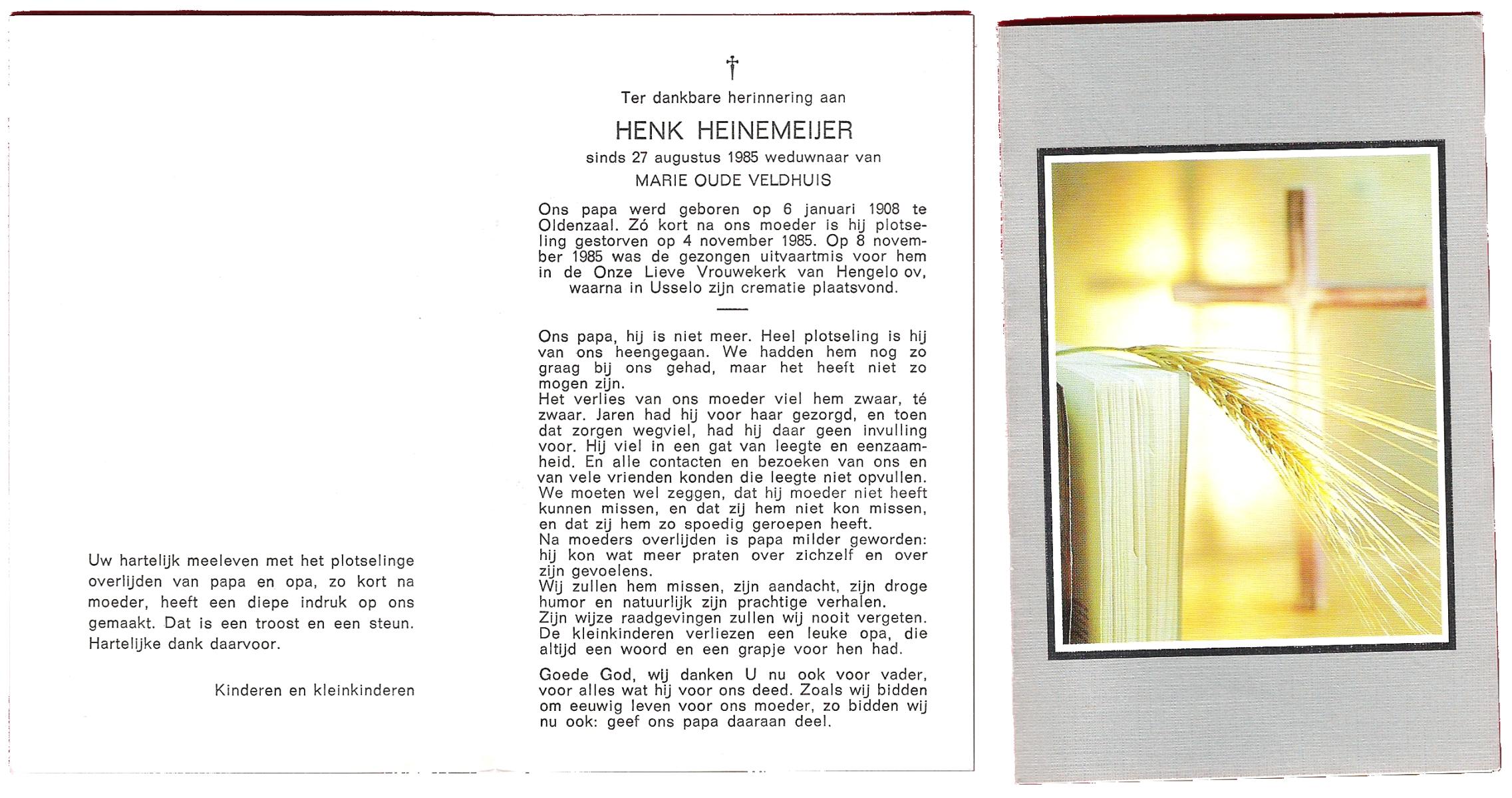 HEINEMIJER, Henk, geboren op 6-1-1908 te Oldenzaal, overleden op 4-11-1985 op 77-jarige leeftijd, gecremeerd op 8-11-1985 te Usselo.