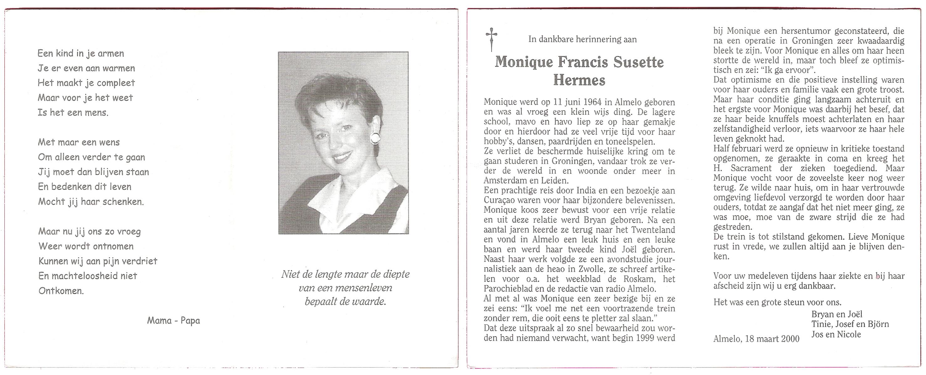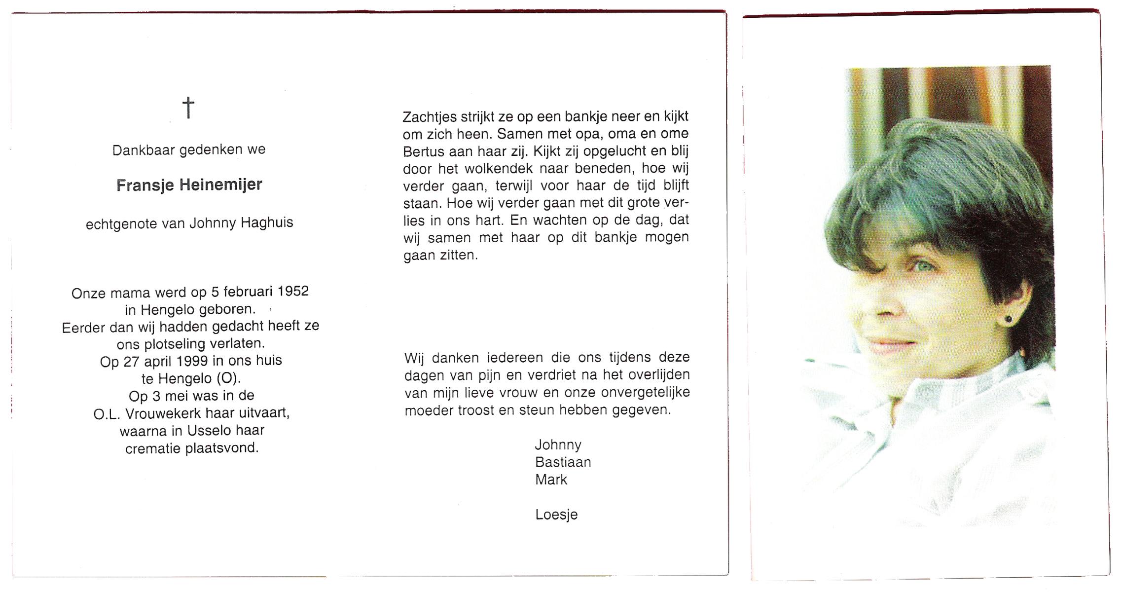 HEINEMIJER, Fransje, geboren op 5-2-1952 te Hengelo (O), overleden op 27-4-1999 te Hengelo (Ov.) op 47-jarige leeftijd, gecremeerd op 3-5-1999 te Usselo.