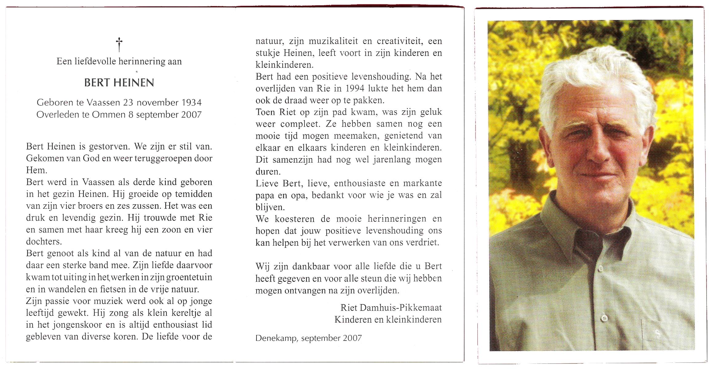 HEINEN, Bert, geboren op 23-11-1934 te Vaassen, overleden op 8-9-2007 te Ommen op 72-jarige leeftijd.