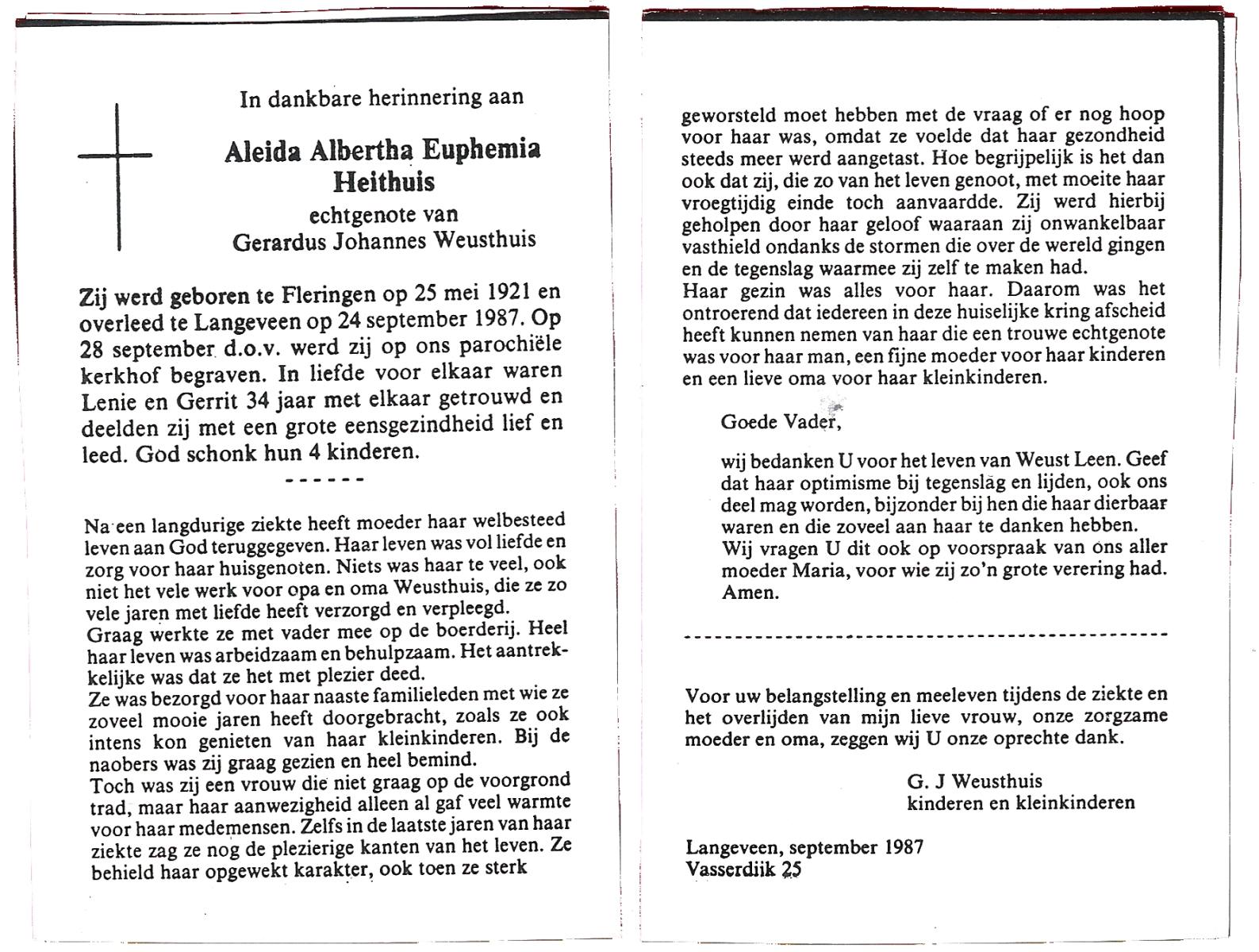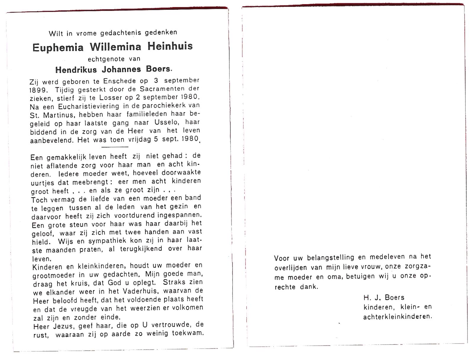 HEINHUIS, Euphemia Willemina, geboren op 03-09-1899 te Enschede, overleden op 2-9-1980 te Losser op 80-jarige leeftijd, gecremeerd op 5-9-1980 te Usselo.