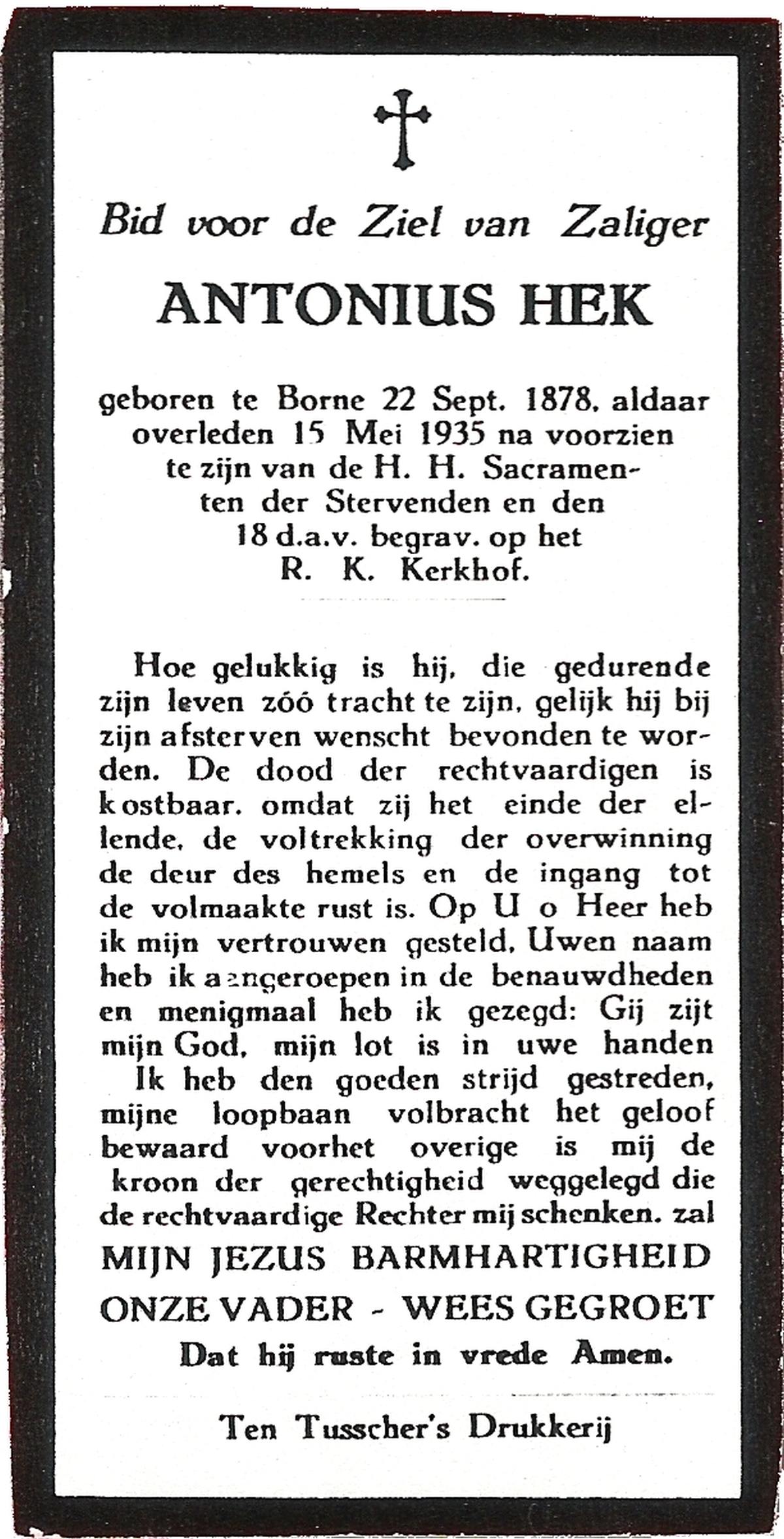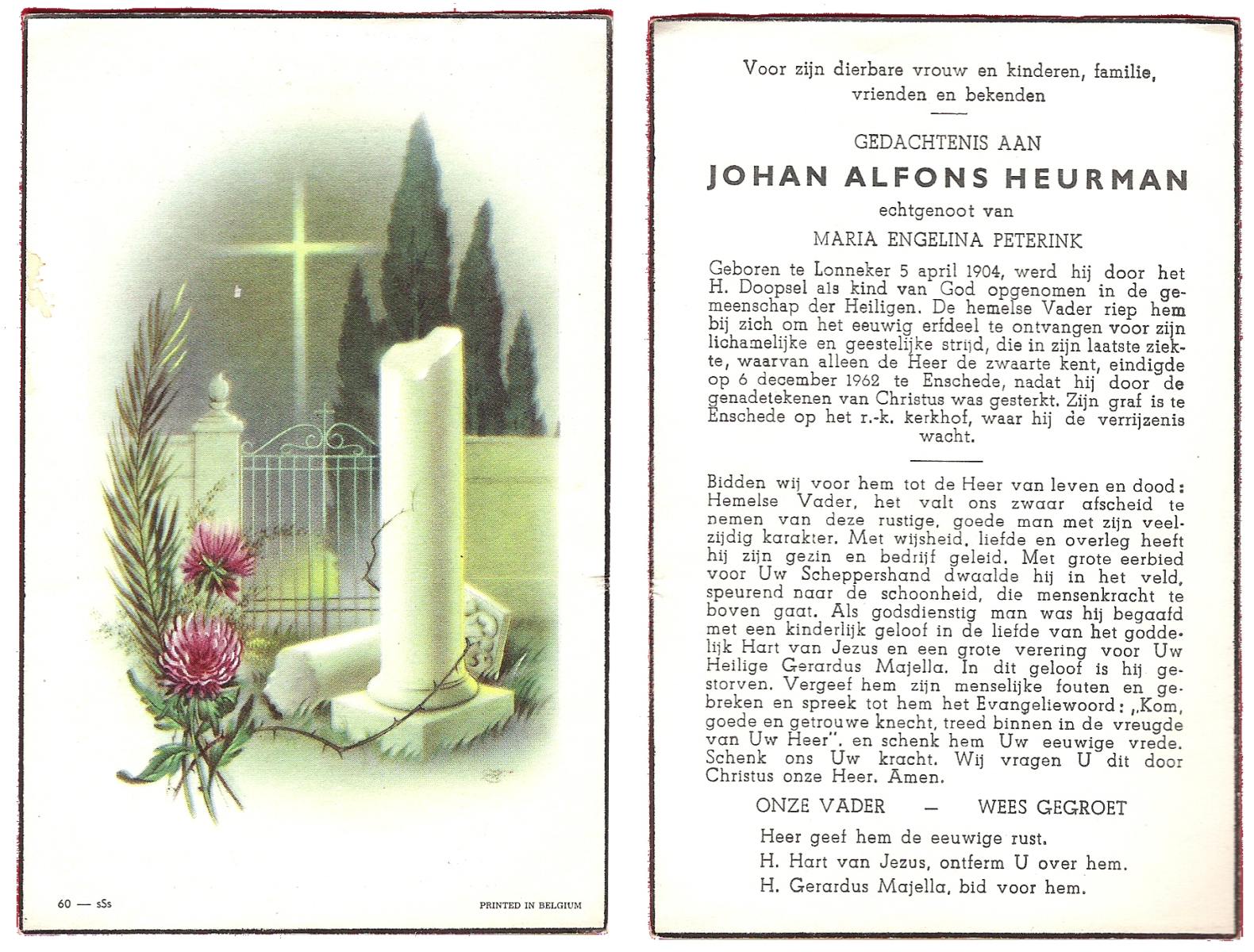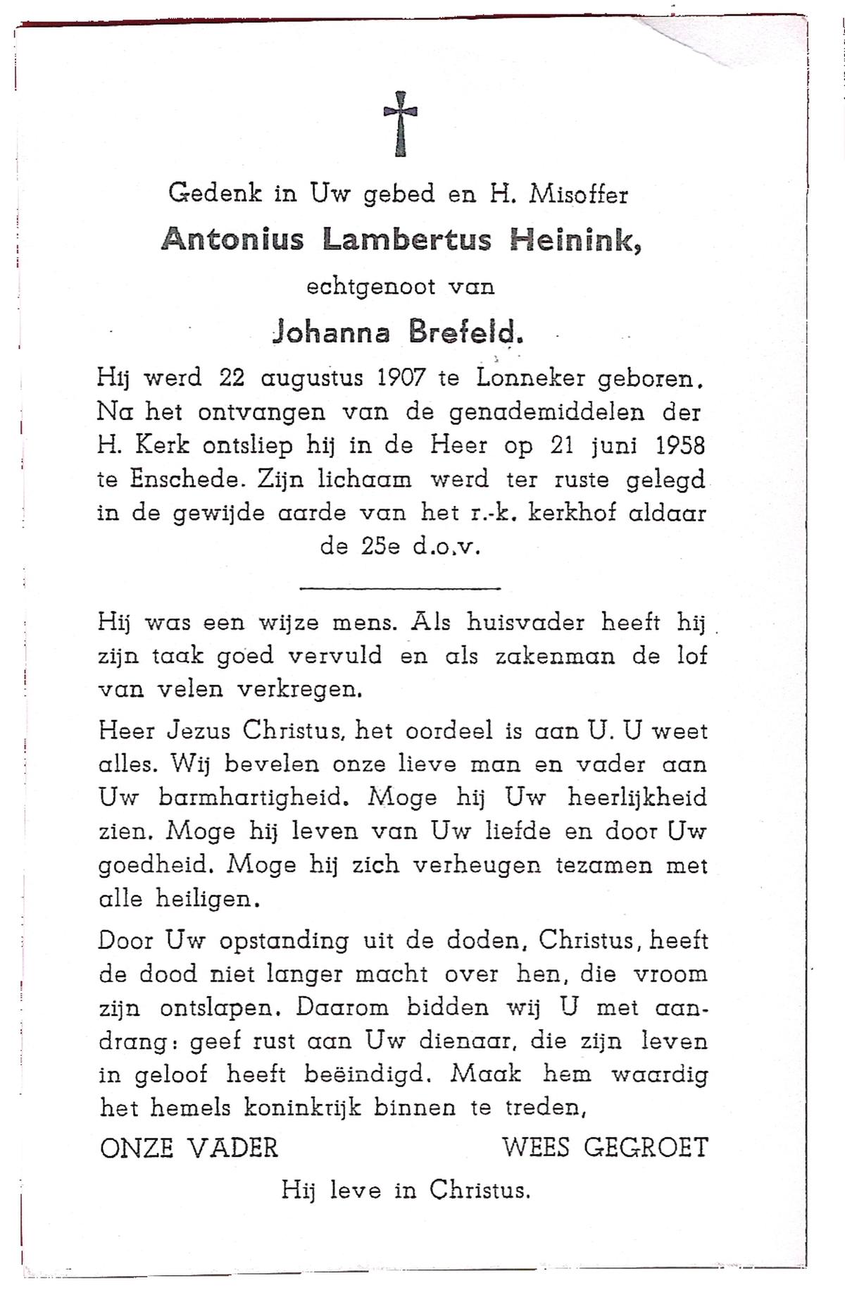 HEININK, Antonius Lambertus, geboren op 22-8-1907 te Lonneker, overleden op 21-6-1958 te Enschede op 50-jarige leeftijd, begraven op 25-6-1958 te Enschede.