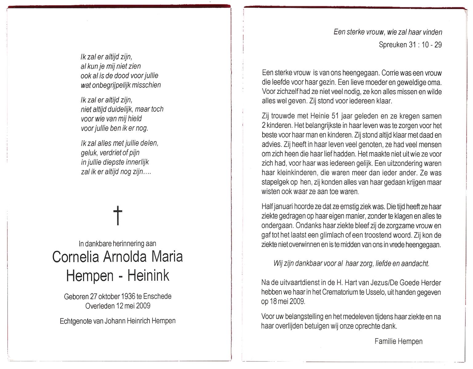 HEININK, Cornelia Arnolda Maria, geboren op 27-10-1936 te Enschede, overleden op 12-5-2009 op 72-jarige leeftijd, gecremeerd op 18-5-2009 te Usselo.