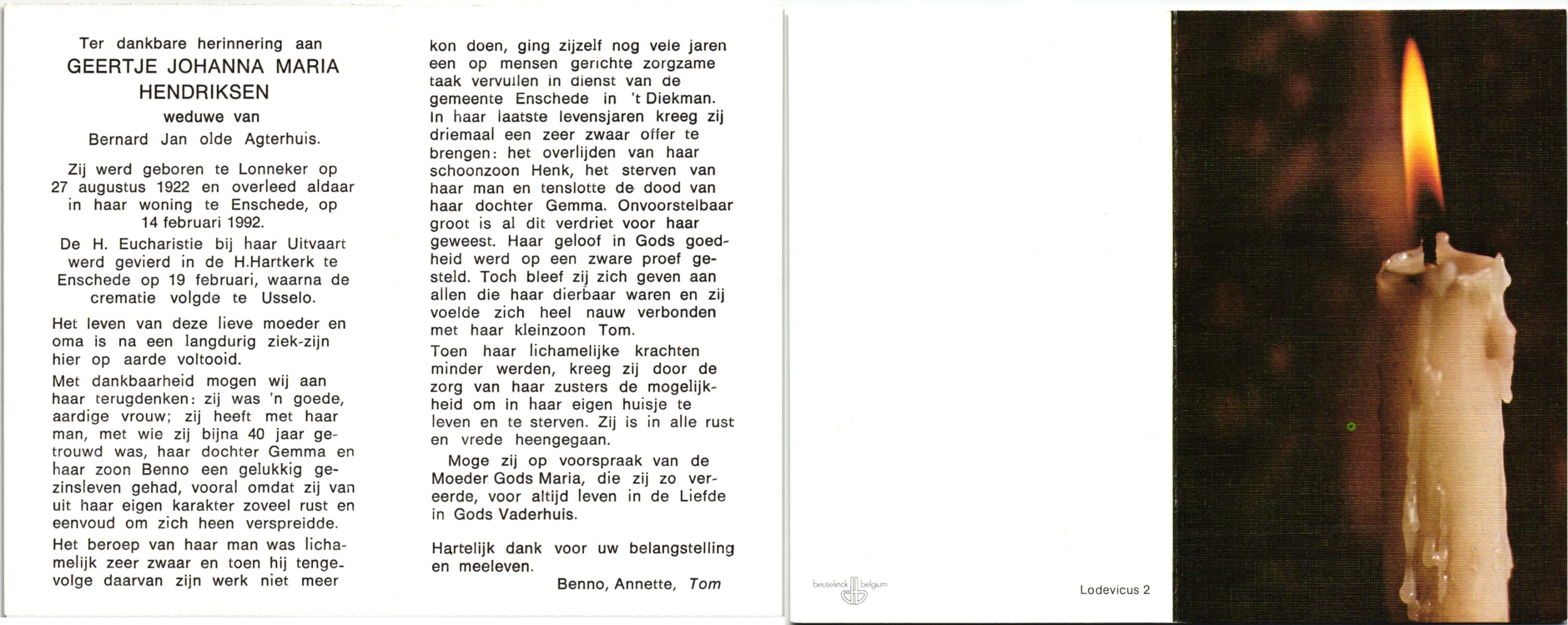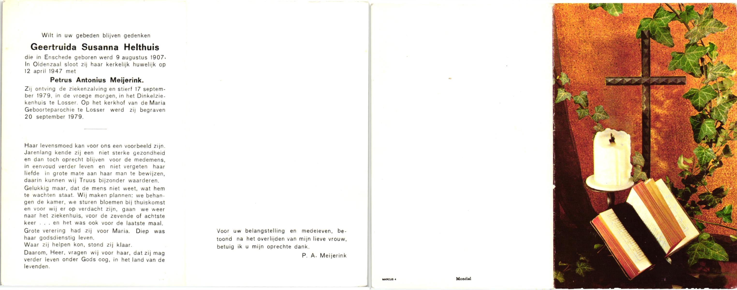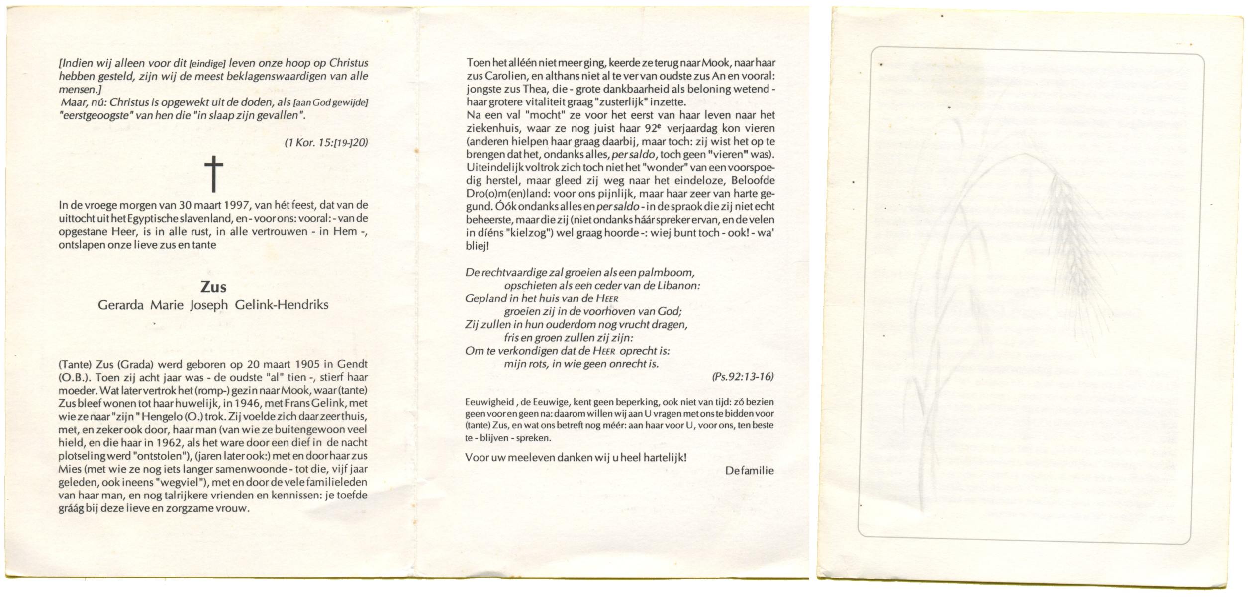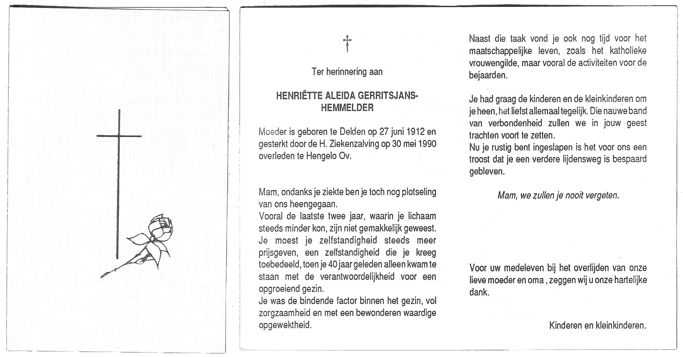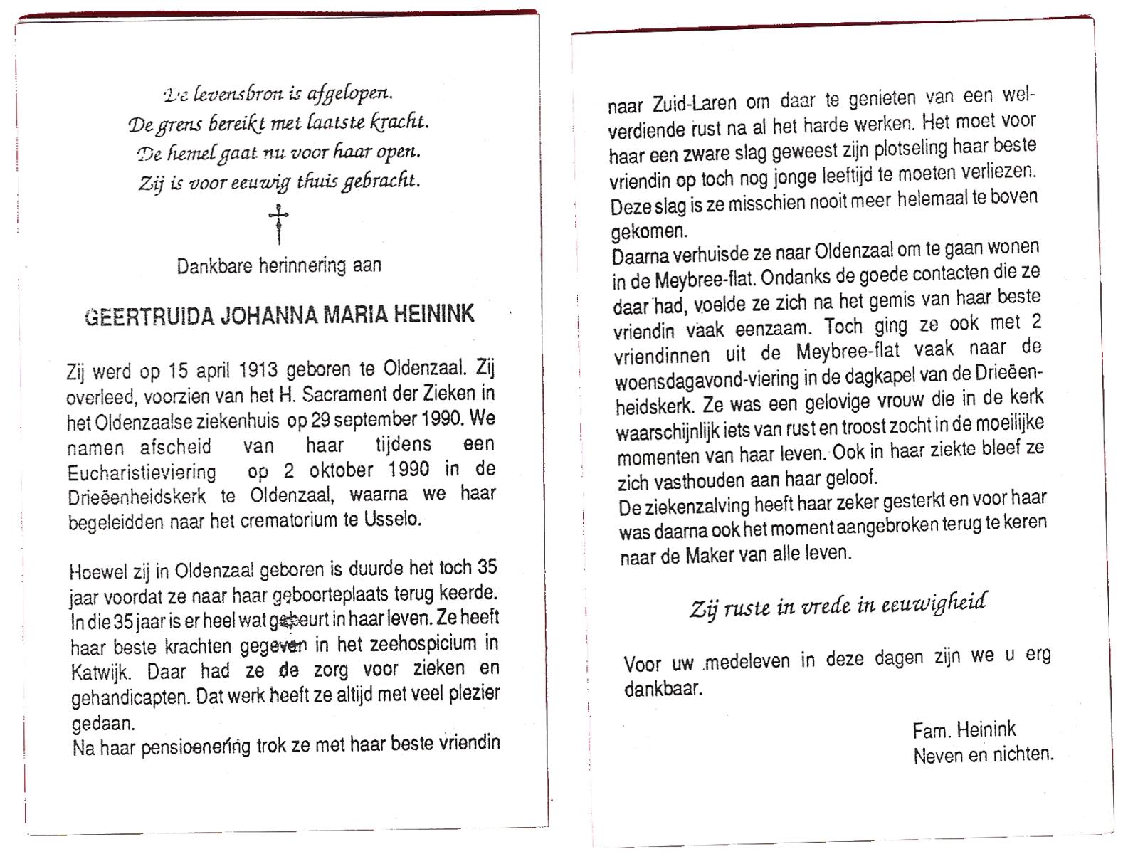 HEININK, Geertruida Johanna Maria, geboren op 15-4-1913 te Oldenzaal, overleden op 29-9-1990 te Oldenzaal op 77-jarige leeftijd, gecremeerd op 2-10-1990 te Usselo.