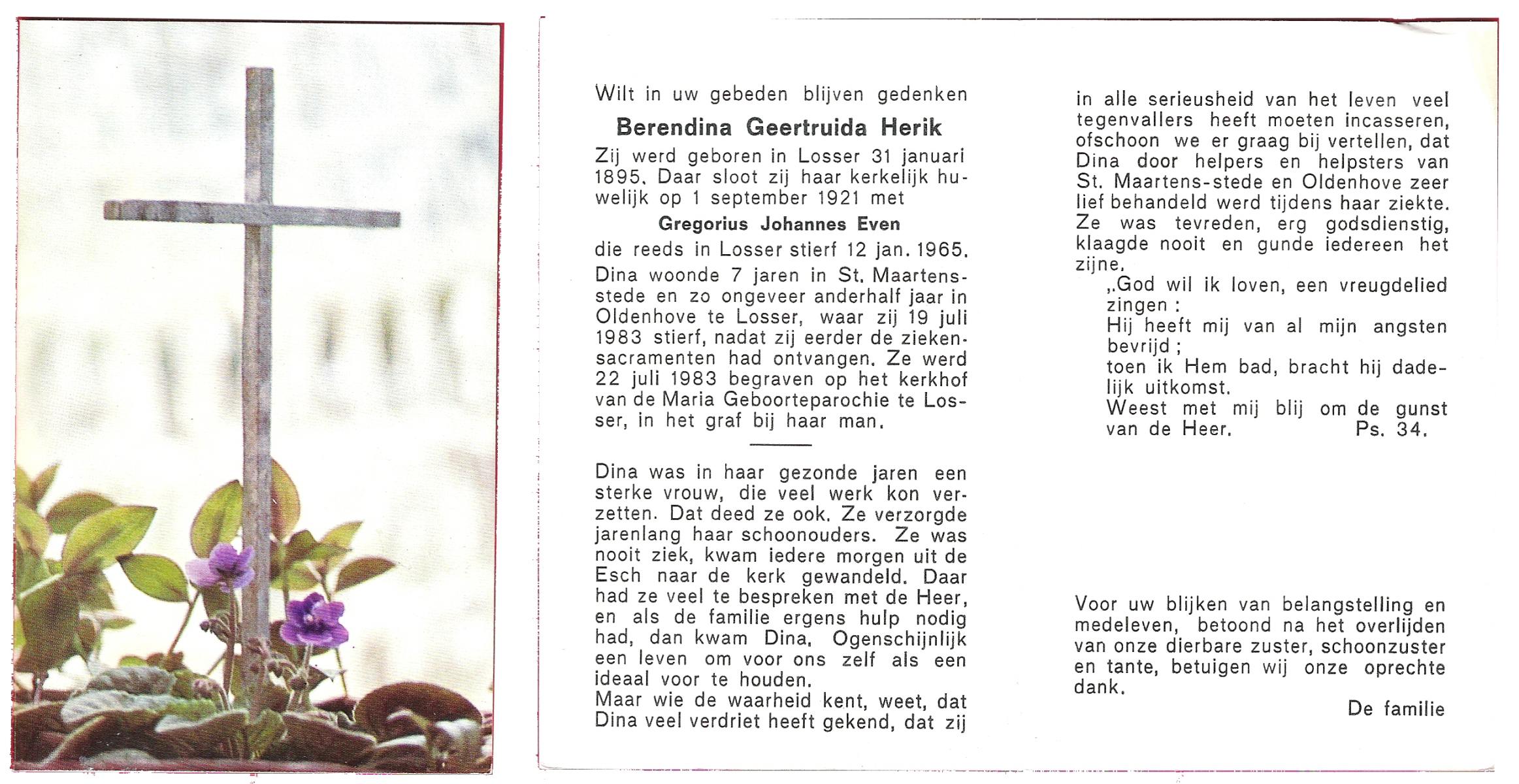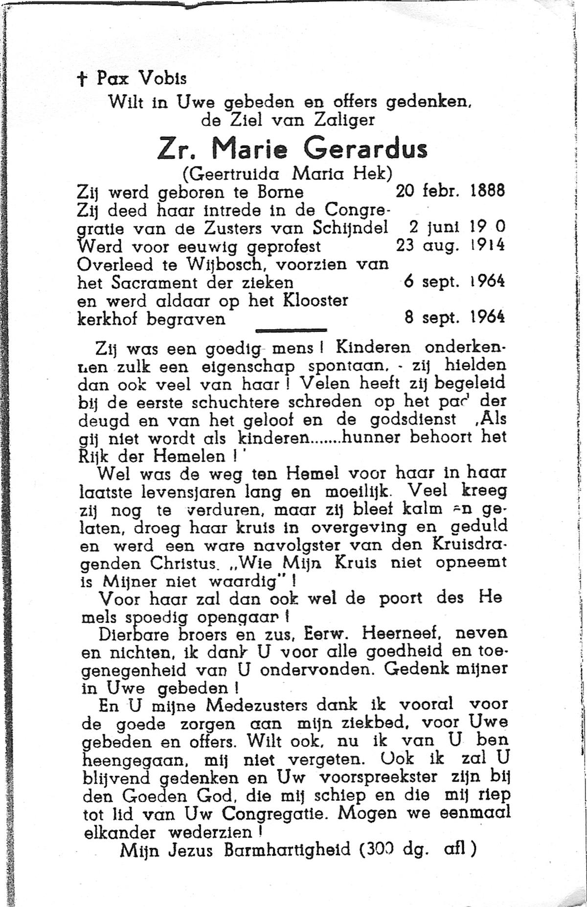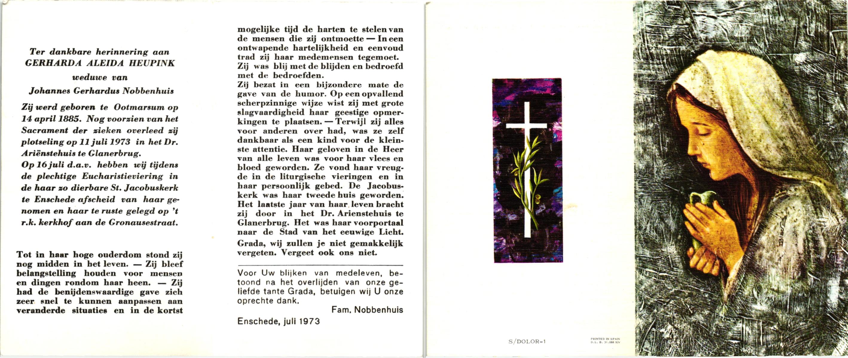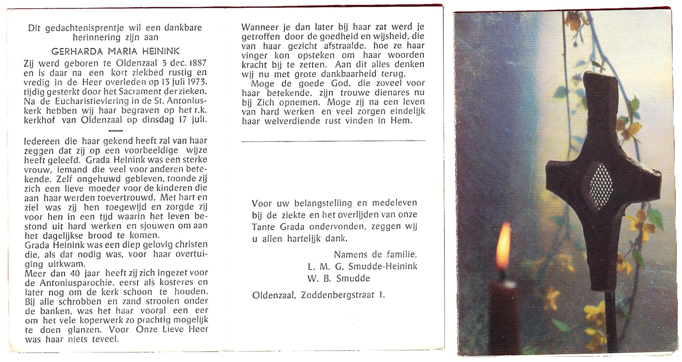 HEININK, Gerharda Maria, geboren op 03-12-1887 te Oldenzaal, overleden op 13-7-1973 op 85-jarige leeftijd, begraven op 17-7-1973 te Oldenzaal.