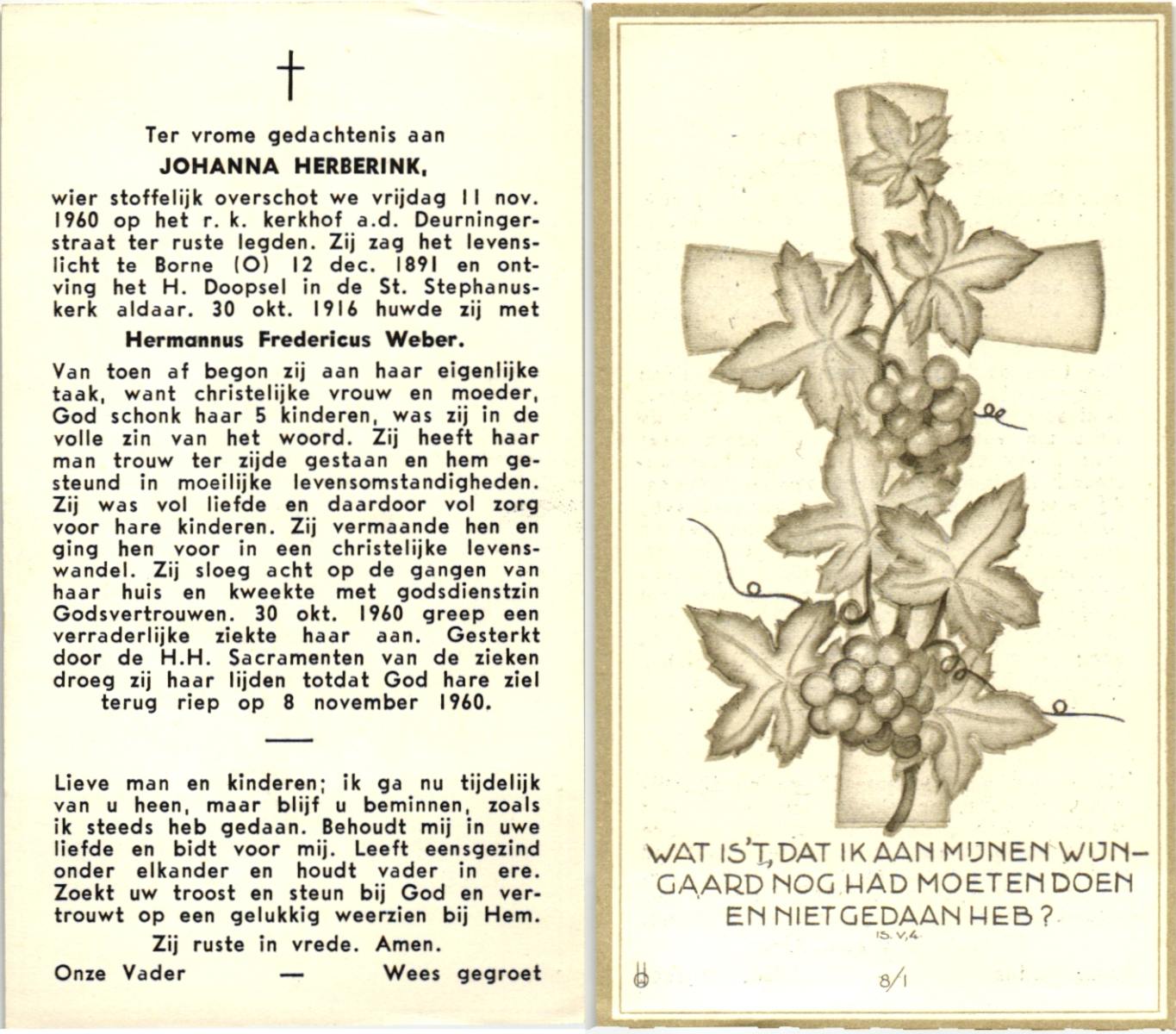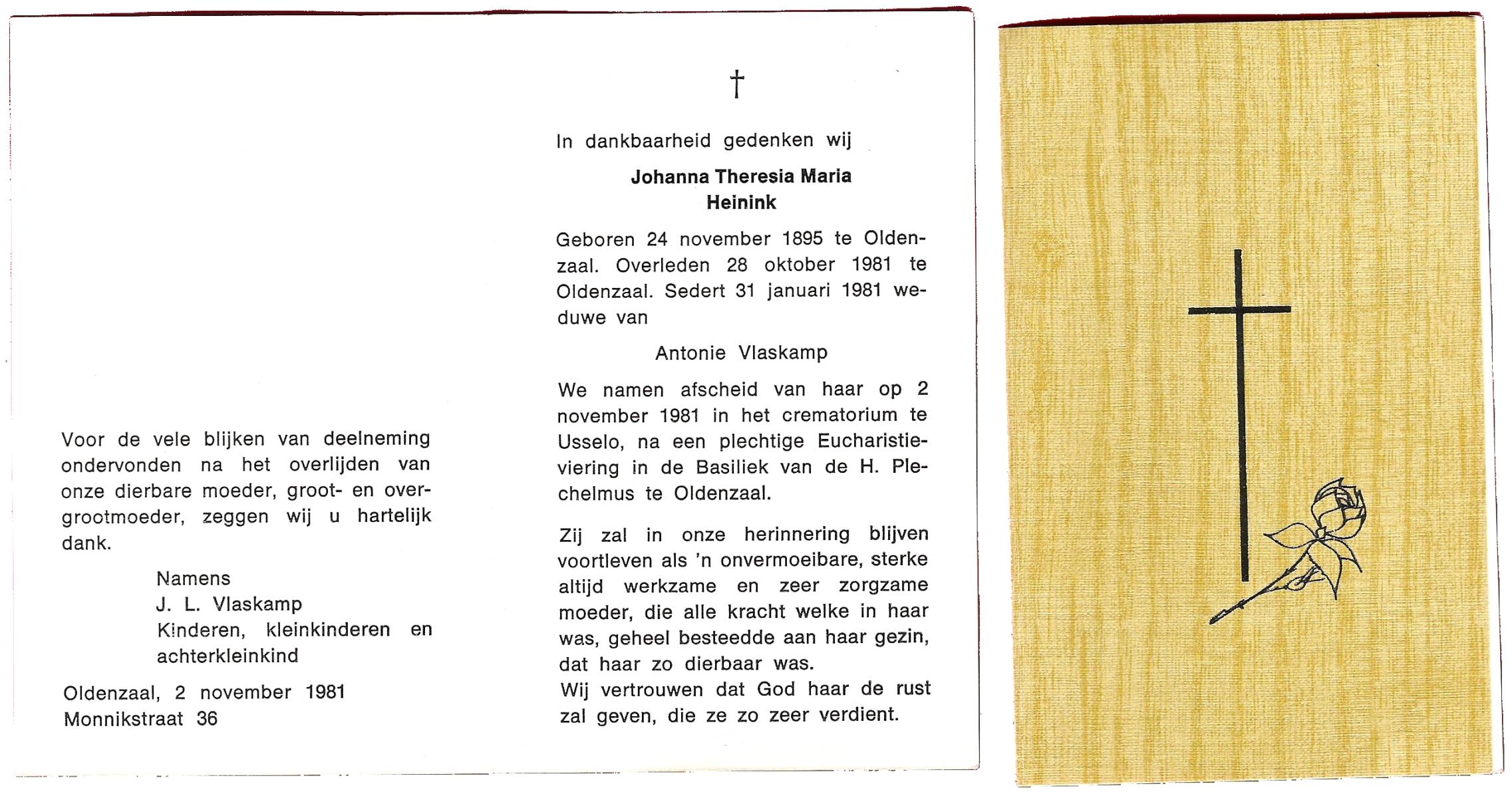 HEININK, Johanna Theresia Maria, geboren op 24-11-1895 te Oldenzaal, overleden op 28-10-1981 te Oldenzaal op 85-jarige leeftijd, gecremeerd op 2-11-1981 te Usselo.