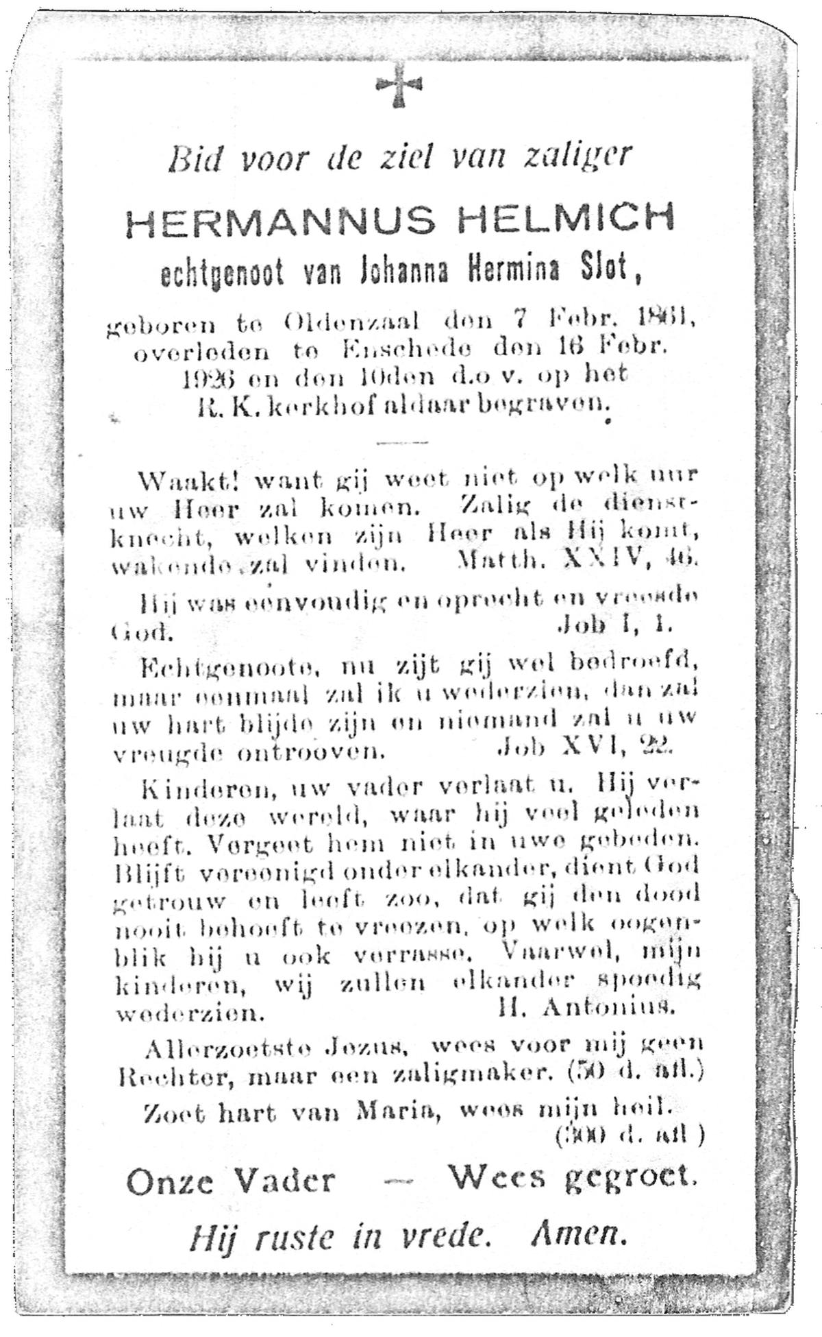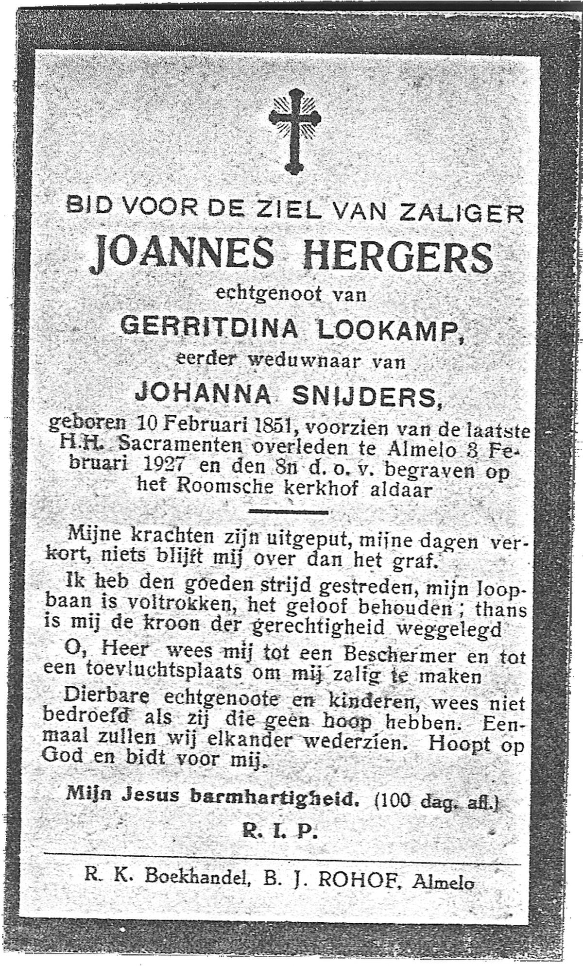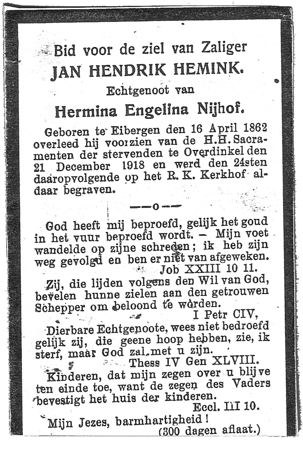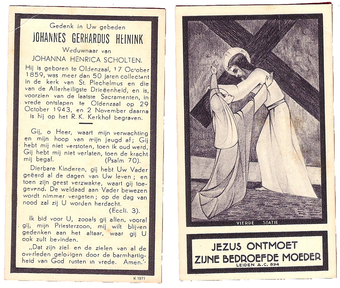 HEININK, Johannes Gerhardus, geboren op 17-10-1859 te Oldenzaal, overleden op 29-10-1943 te Oldenzaal op 84-jarige leeftijd, begraven op 2-11-1943 te Oldenzaal.
