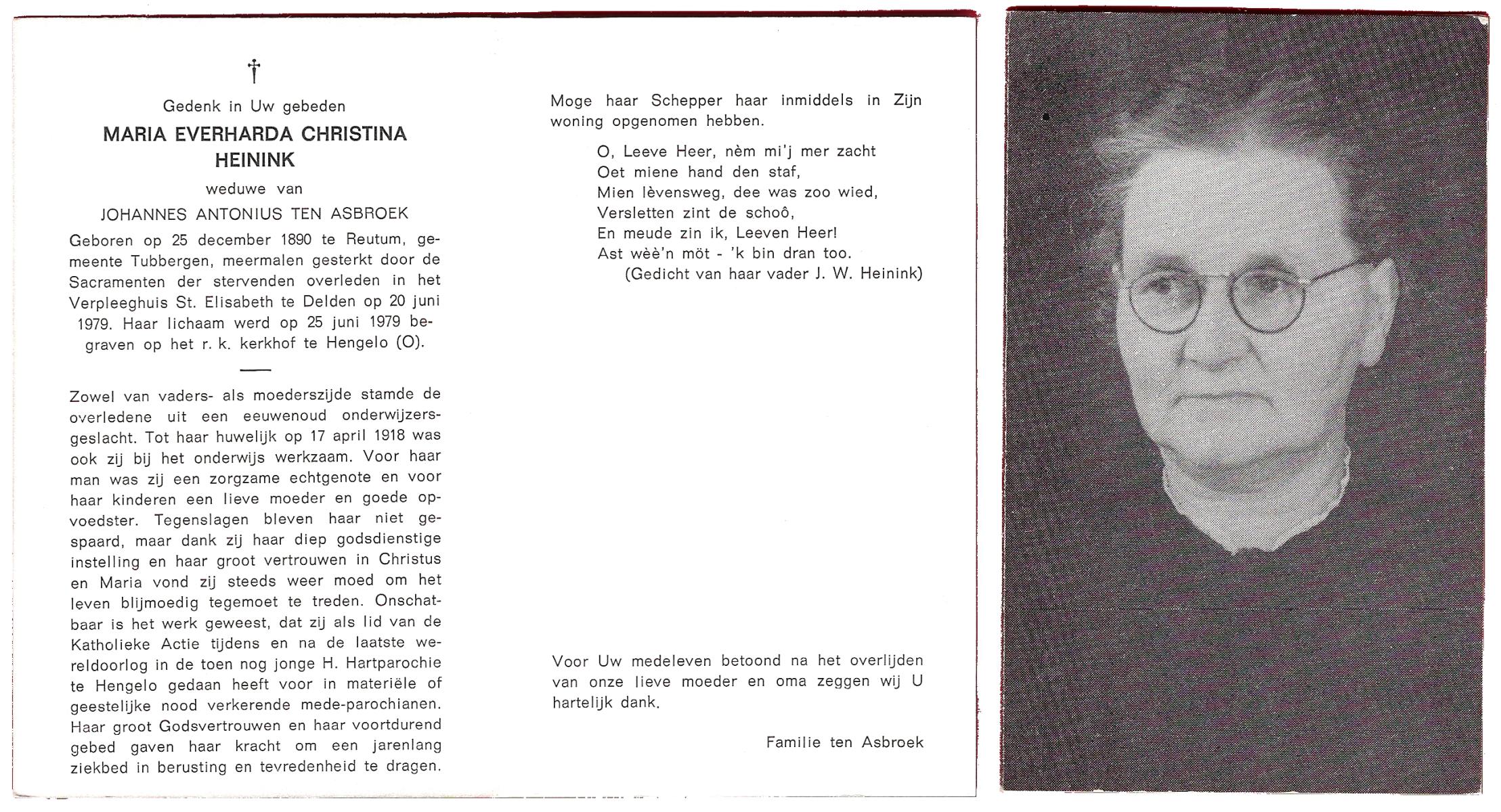 HEININK, Maria Everharda Christina, geboren op 25-12-1890 te Reutum, overleden op 20-6-1979 te Delden op 88-jarige leeftijd, begraven op 25-6-1979 te Hengelo (Ov.).