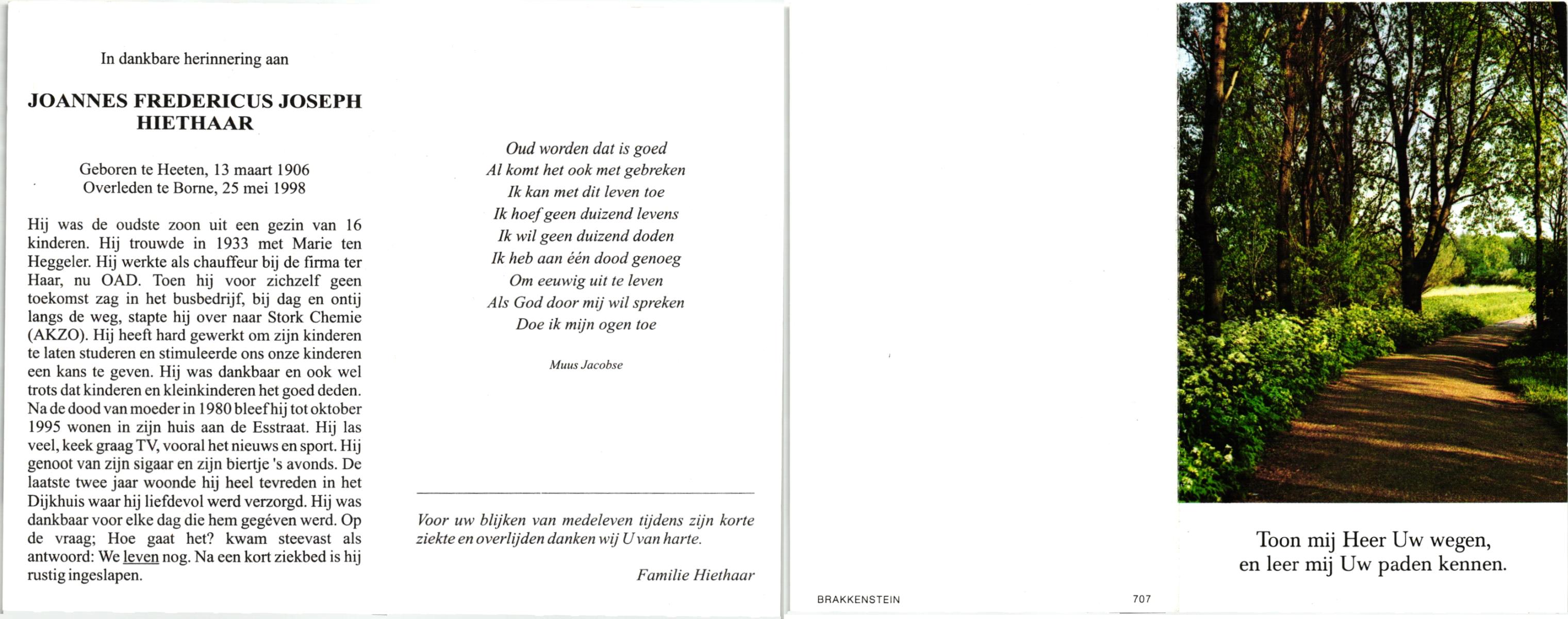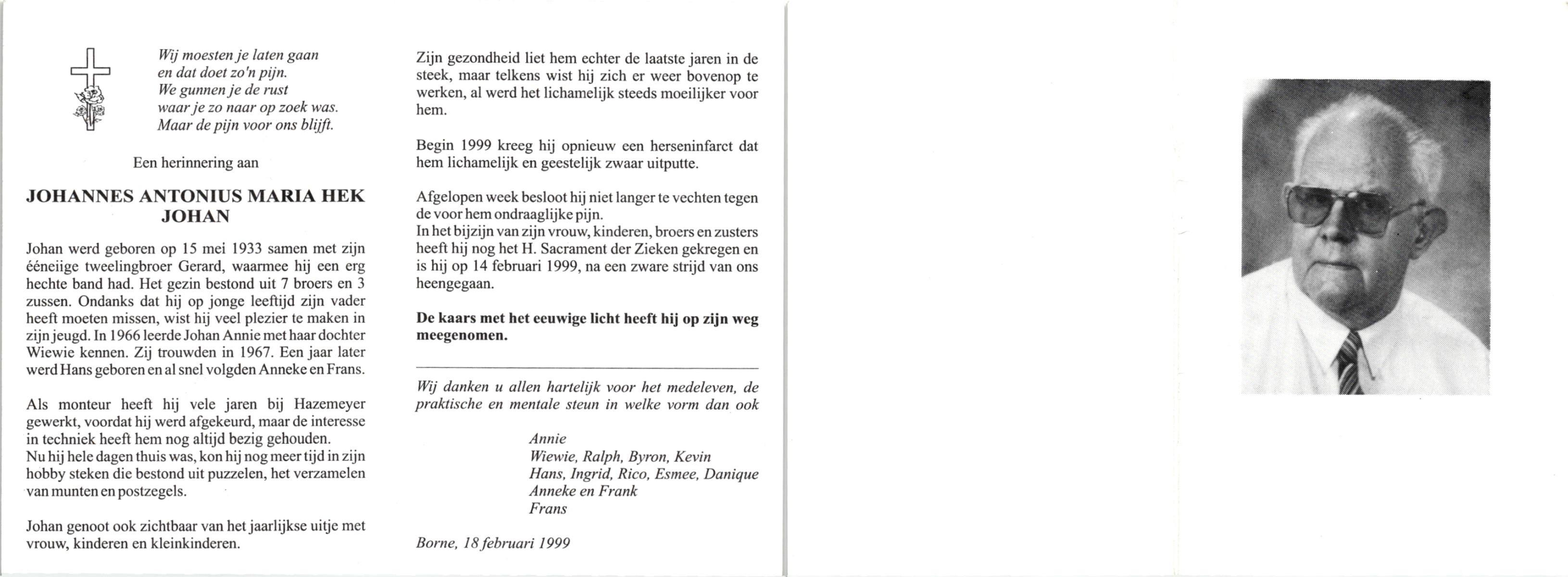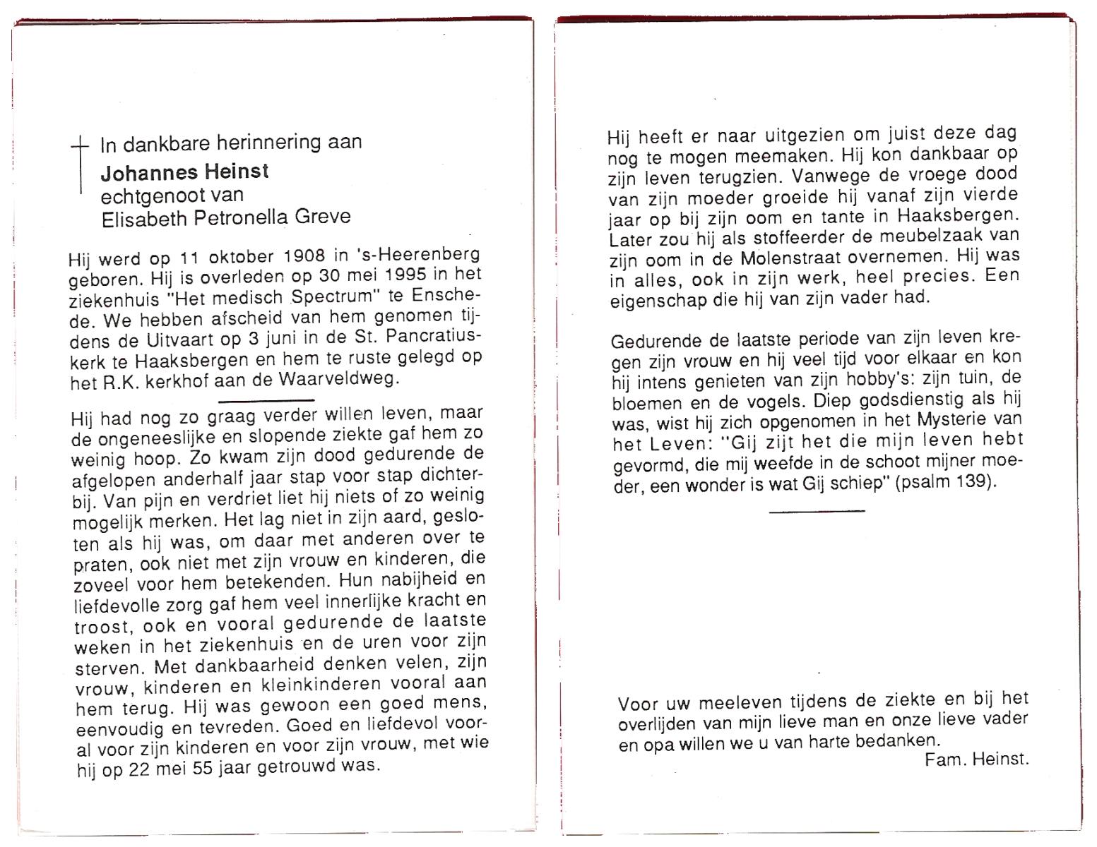 HEINST, Johannes, geboren op 11-10-1908 te 's Heerenberg, overleden op 30-5-1995 te Enschede op 86-jarige leeftijd, begraven op 3-6-1995 te Haaksbergen.