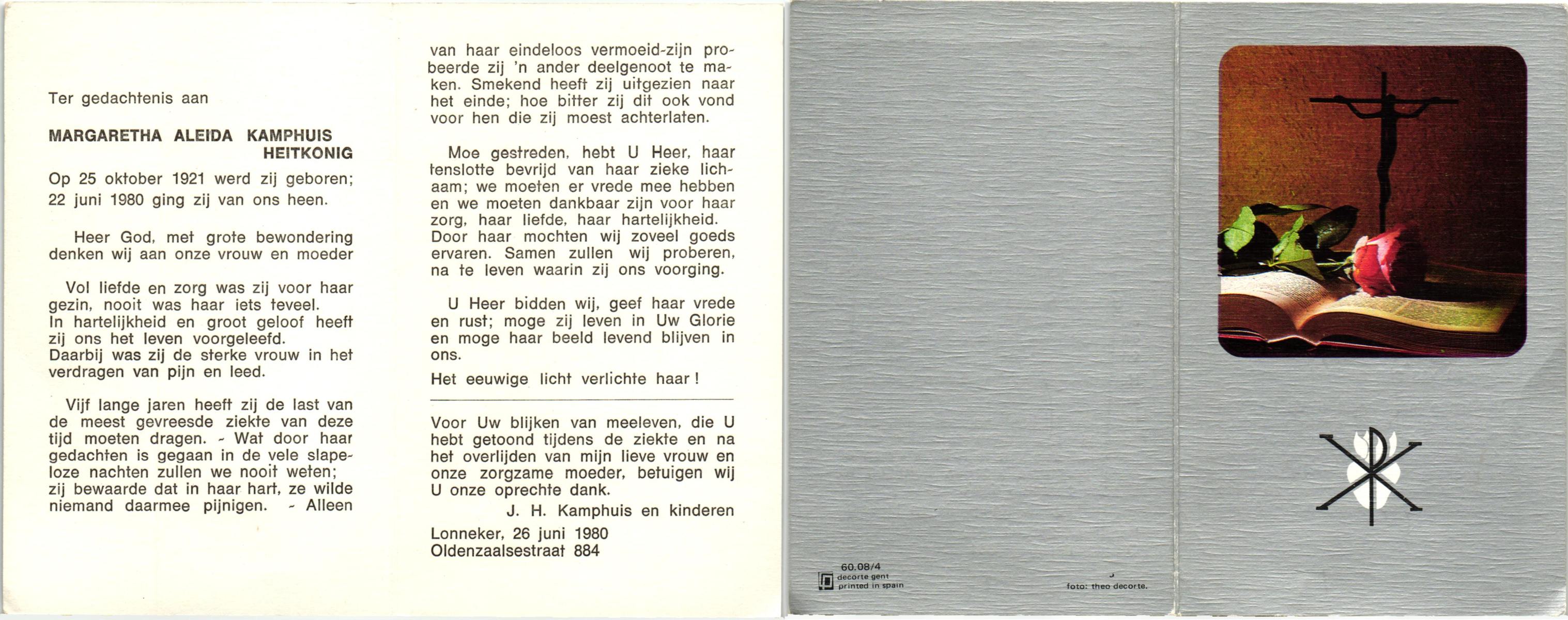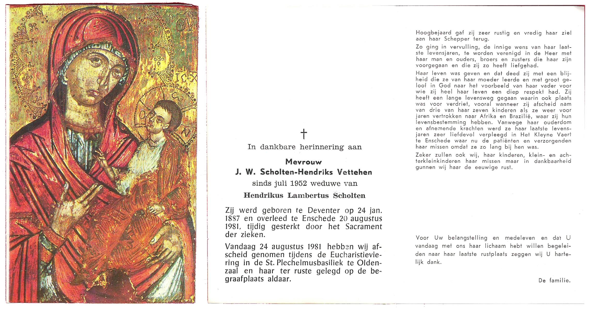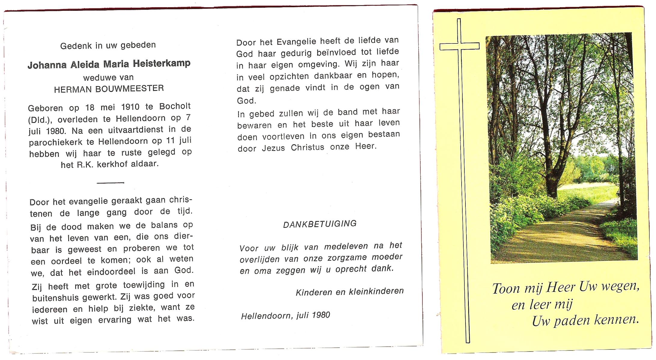 HEISTERKAMP, Johanna Aleida Maria, geboren op 18-5-1910 te Bocholt (Dld), overleden op 7-7-1980 te Hellendoorn op 70-jarige leeftijd, begraven op 11-7-1980 te Hellendoorn.