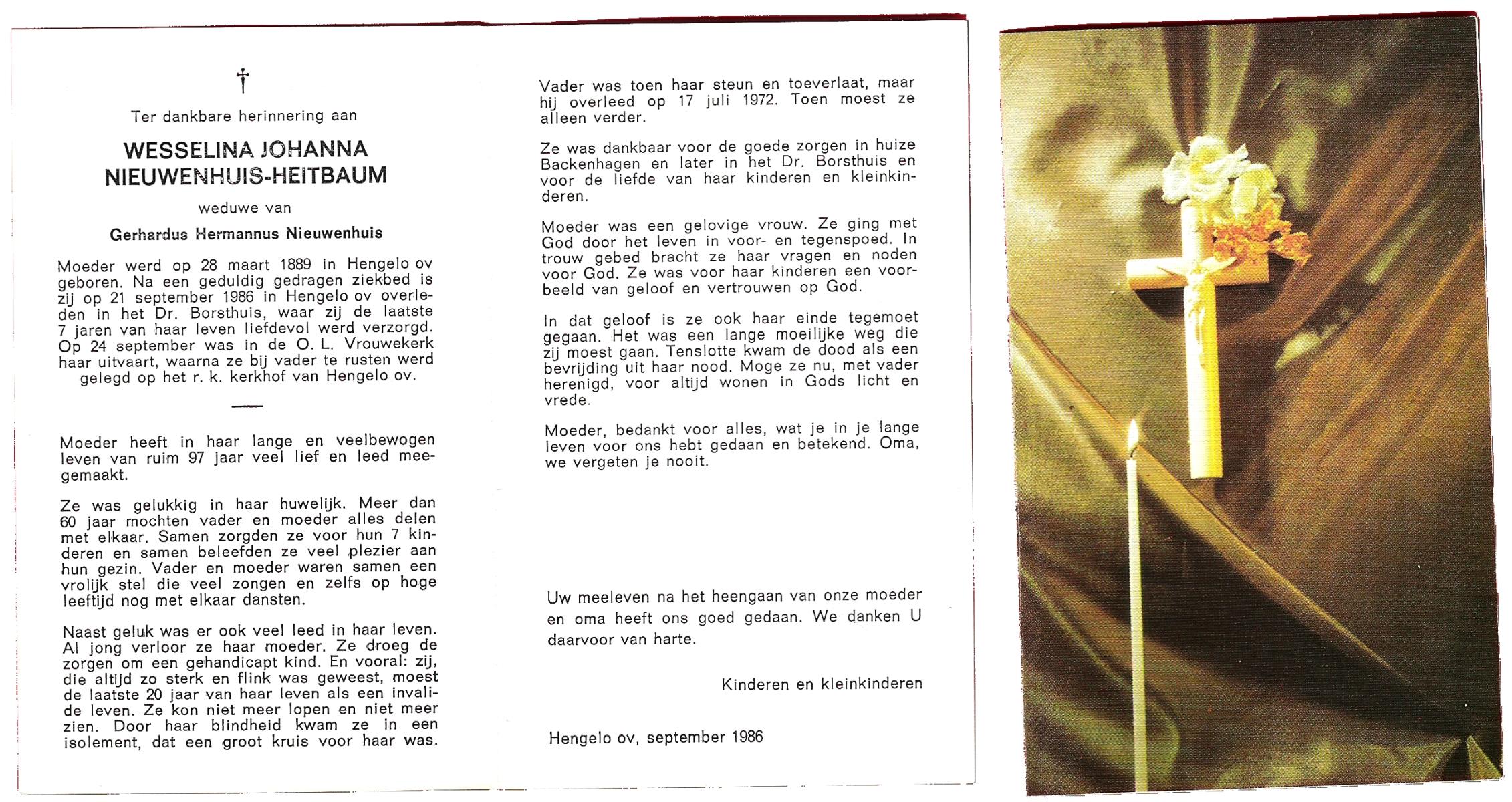 HEITBAUM, Wesselina Johanna, geboren op 28-03-1889 te Hengelo (O), overleden op 21-9-1986 te Hengelo (Ov.) op 97-jarige leeftijd, begraven op 24-9-1986 te Hengelo (Ov.).