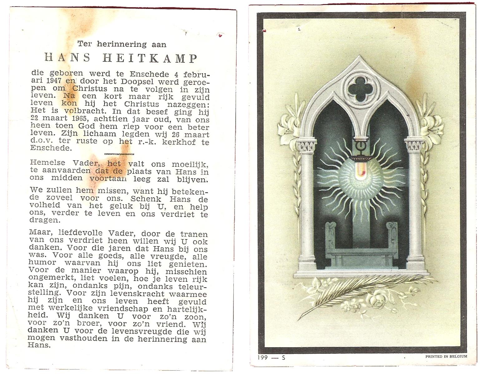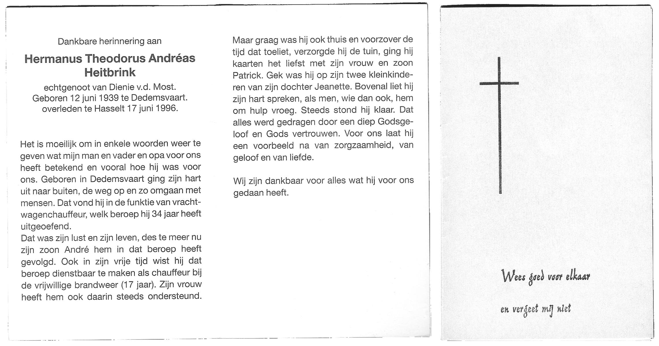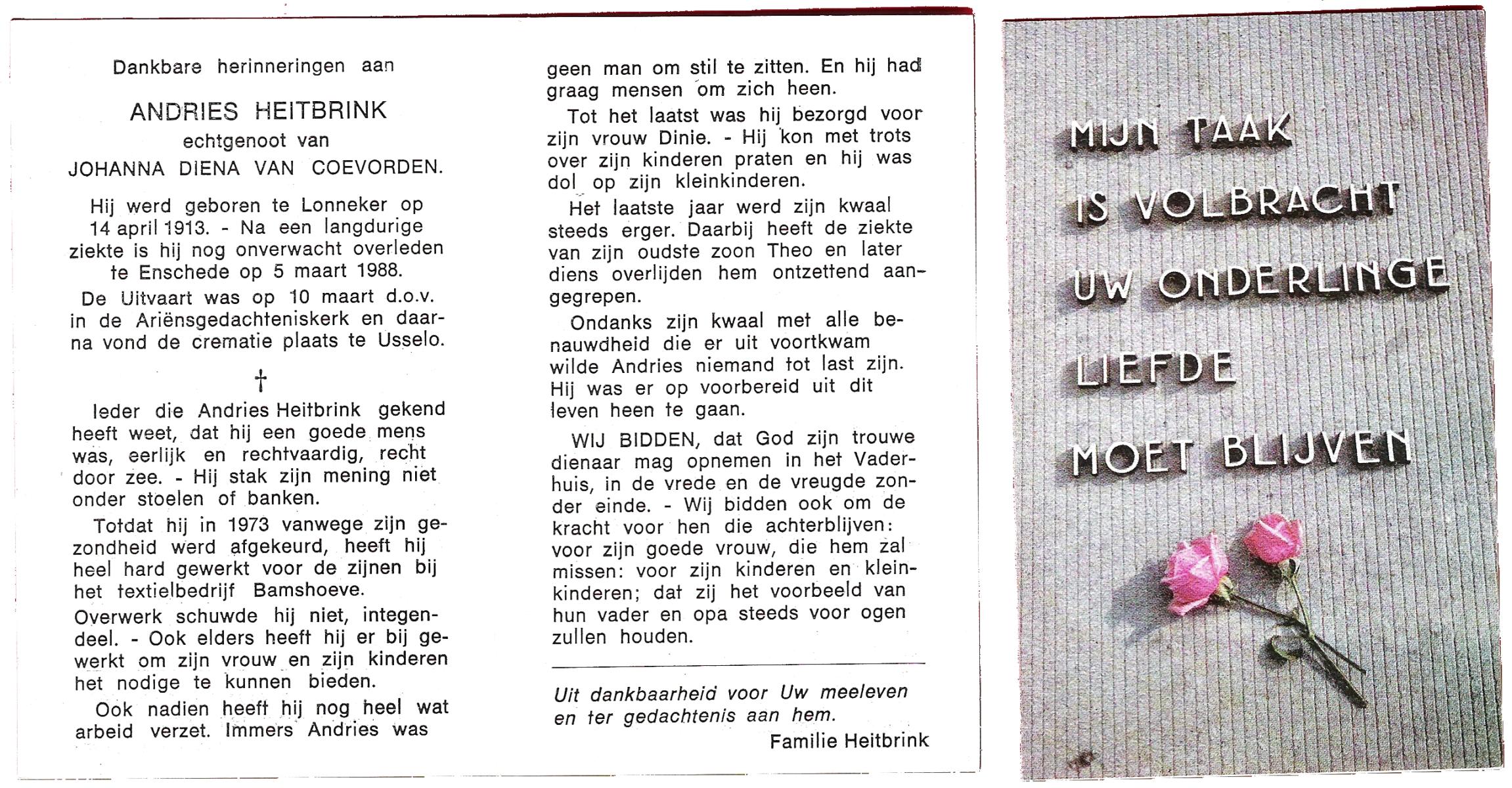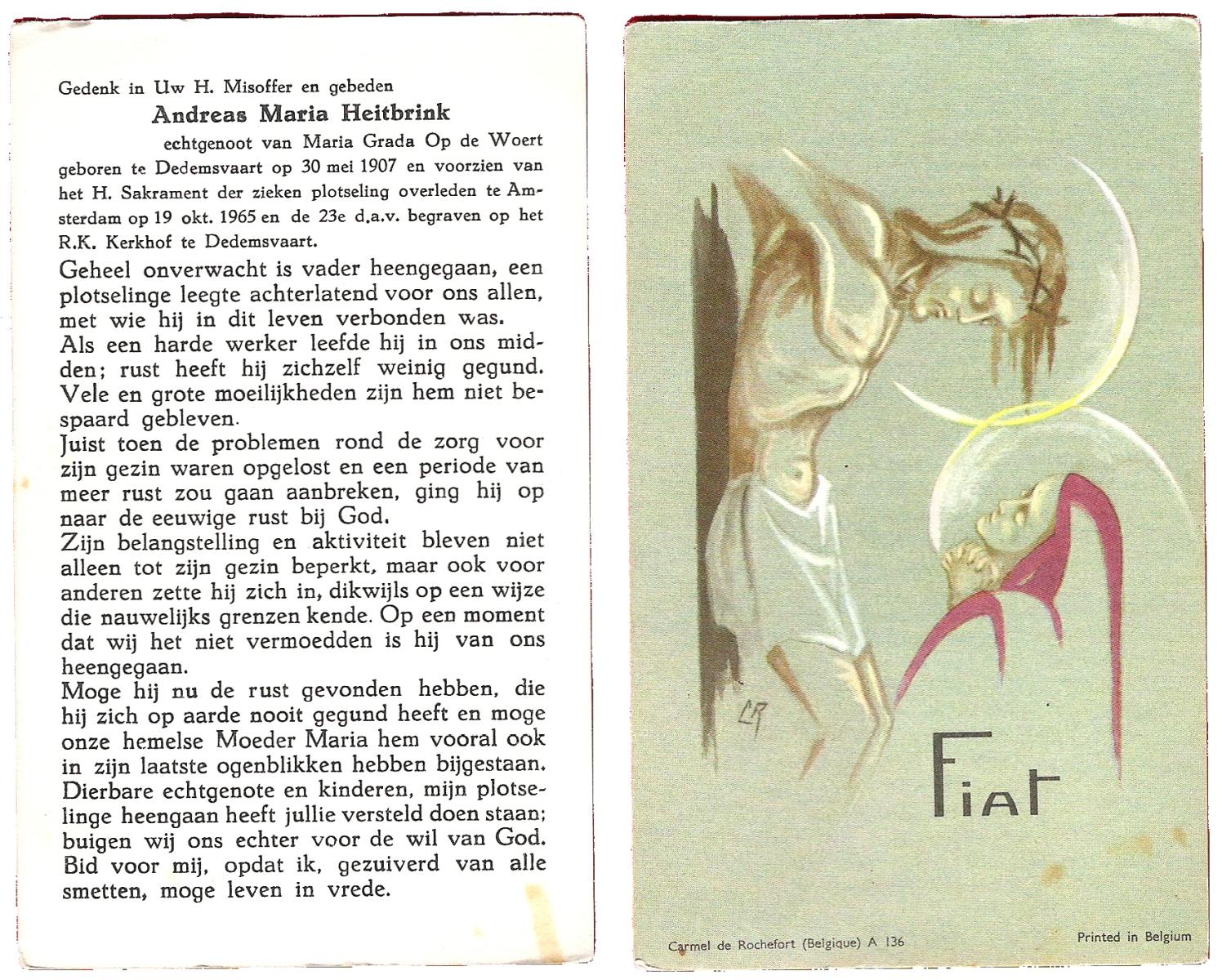 HEITBRINK, Andreas Maria, geboren op 30-5-1907 te Dedemsvaart, overleden op 19-10-1965 te Amsterdam op 58-jarige leeftijd, begraven op 23-10-1965 te Dedemsvaart.