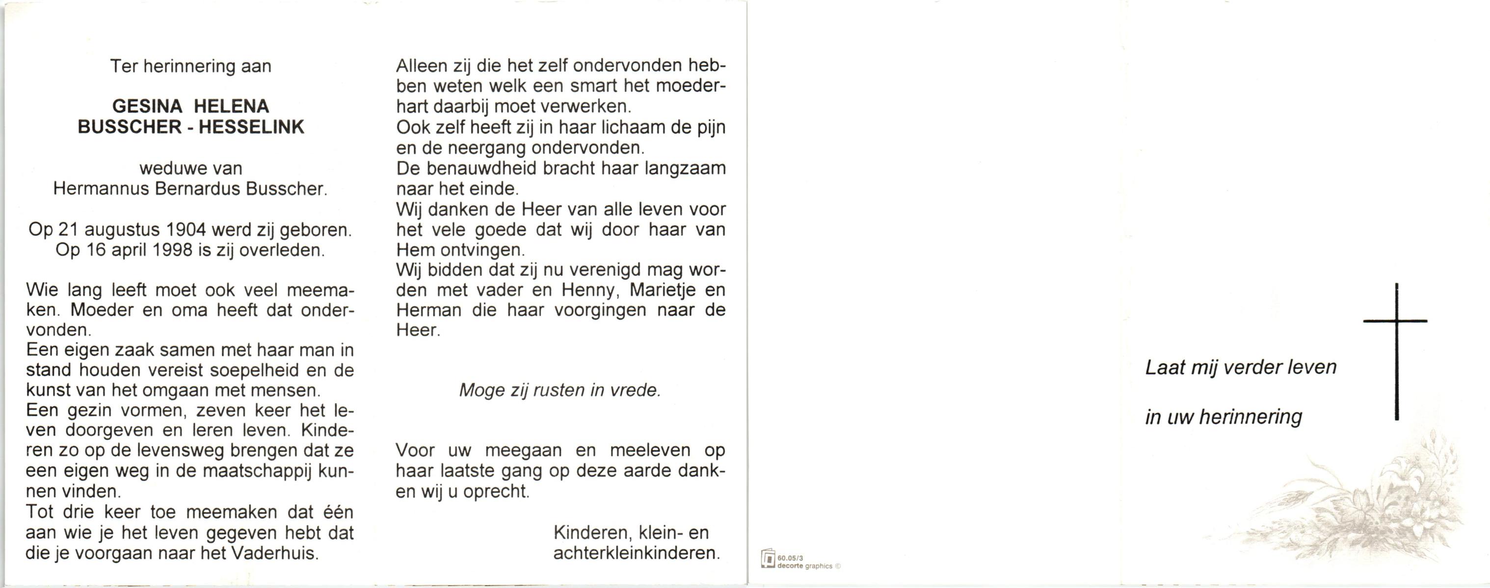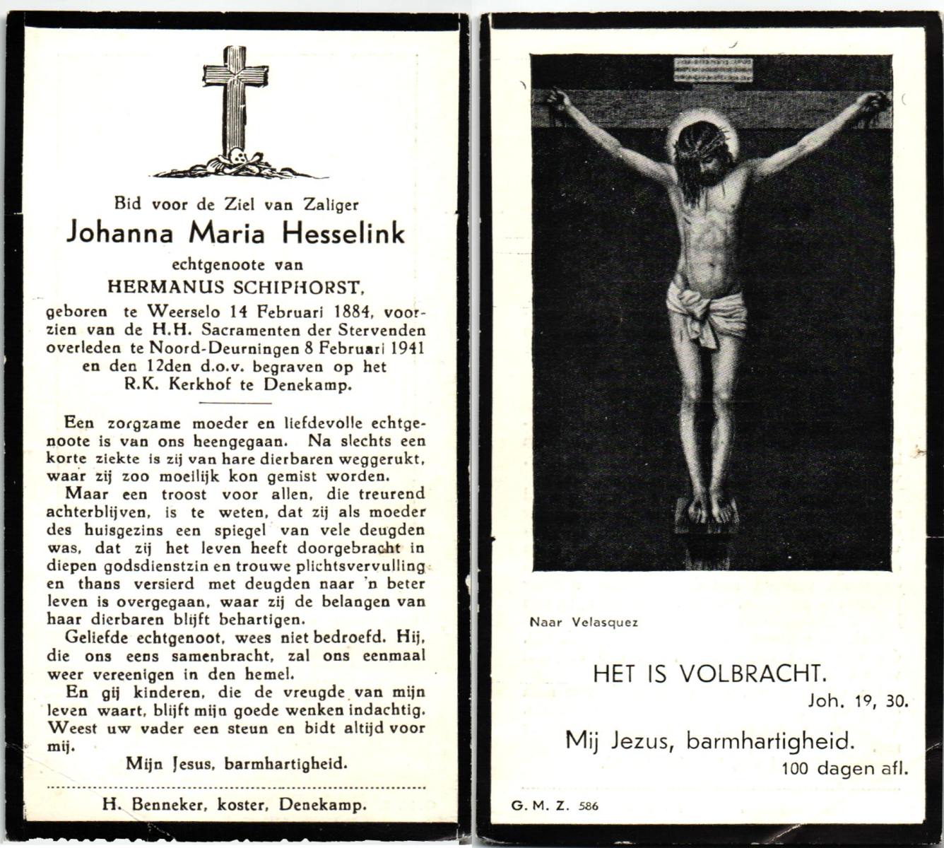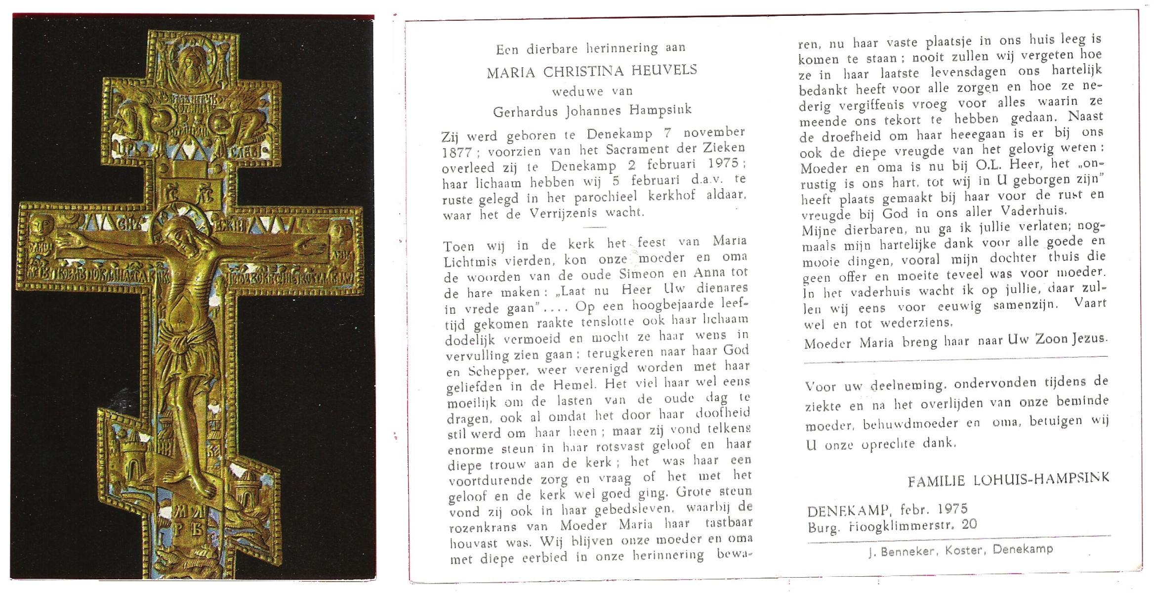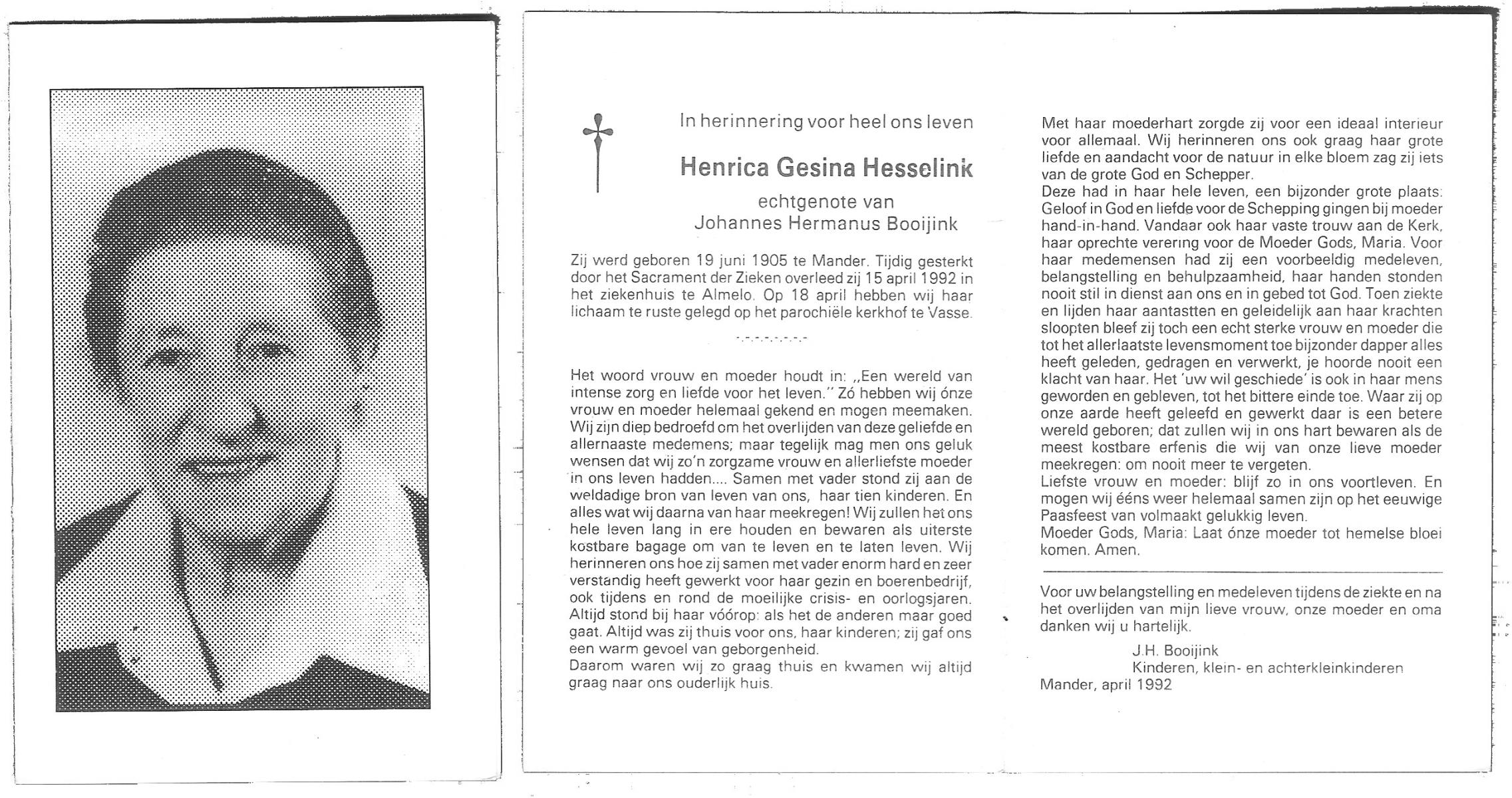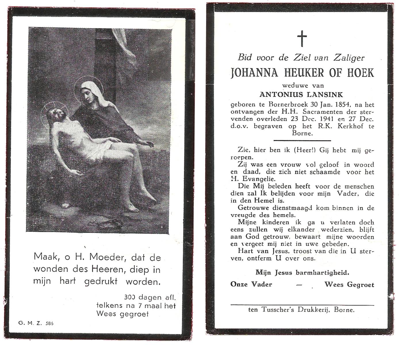 HISKER, Johanna Maria, geboren op 16-03-1894 te Lünten(D), overleden op 20-12-1988 te Buurse op 94-jarige leeftijd, begraven op 24-12-1988 te Buurse.