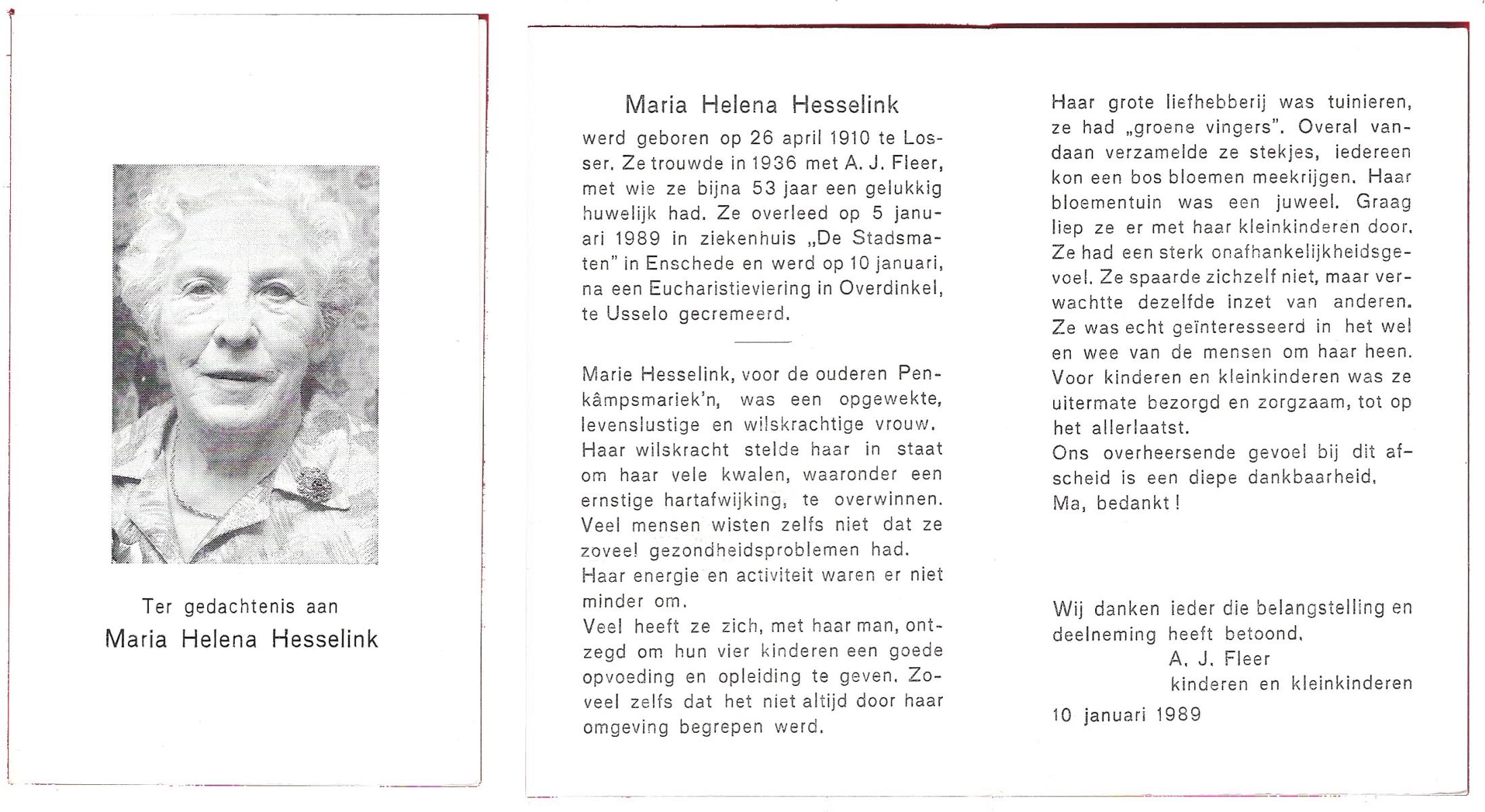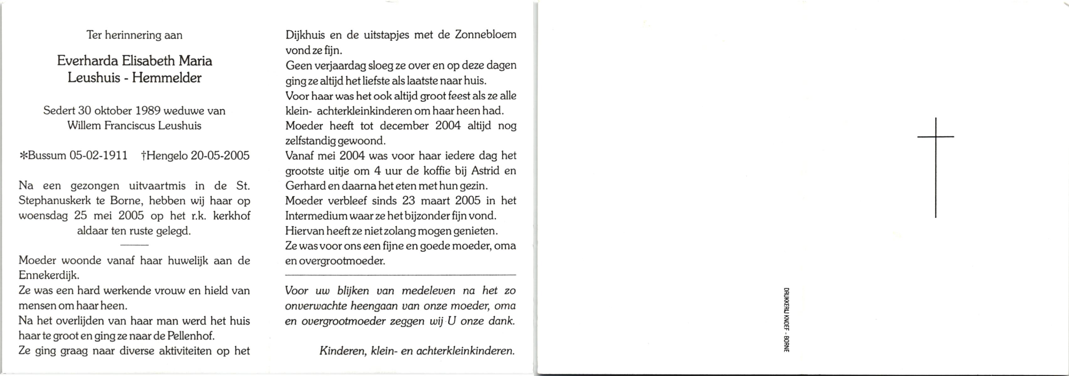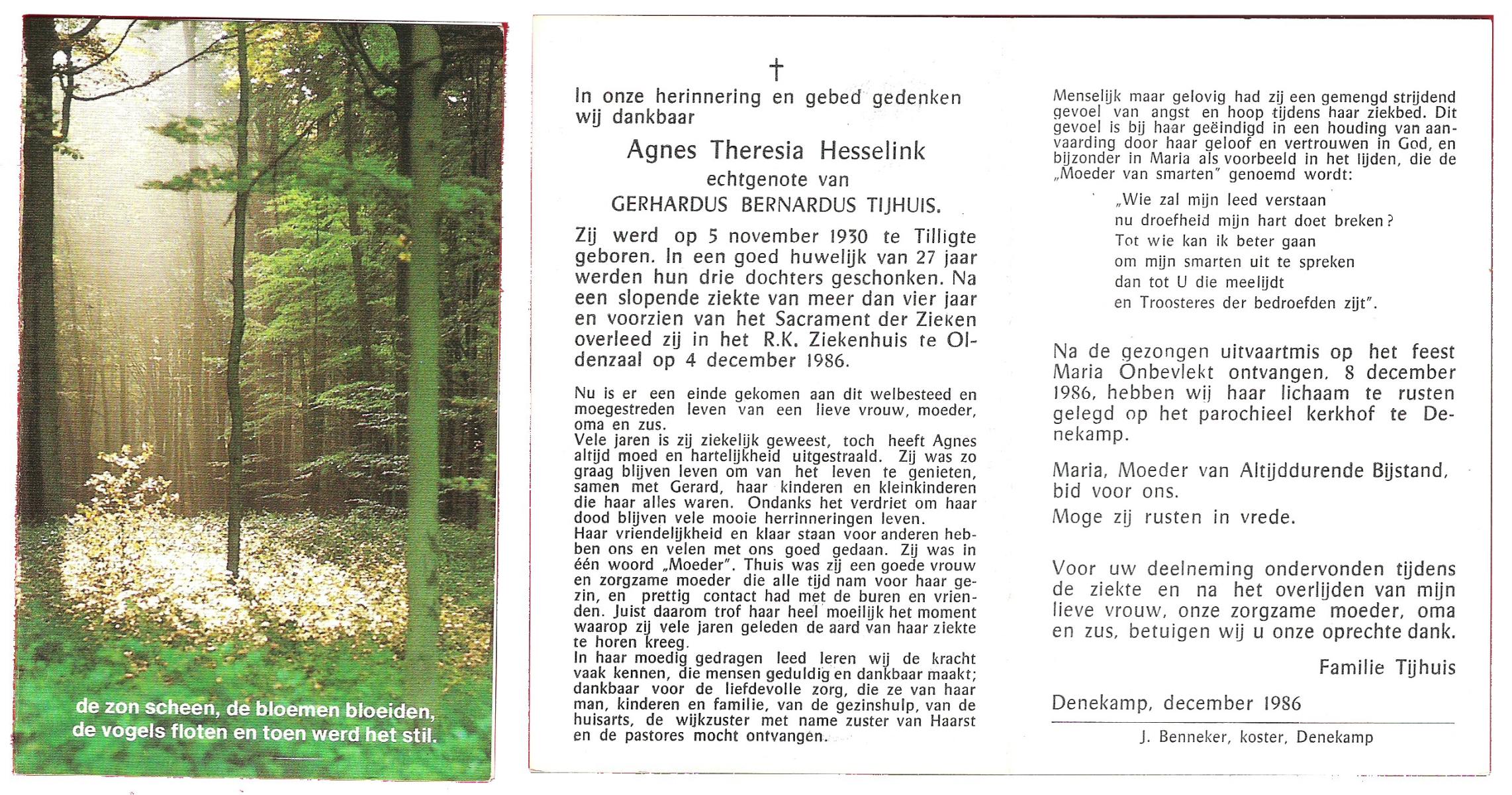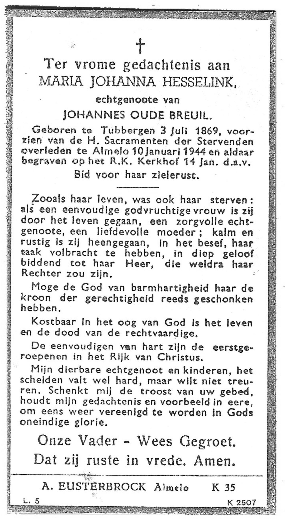 HISKER, Johanna Maria, geboren op 16-03-1894 te Lünten(D), overleden op 20-12-1988 te Buurse op 94-jarige leeftijd, begraven op 24-12-1988 te Buurse.