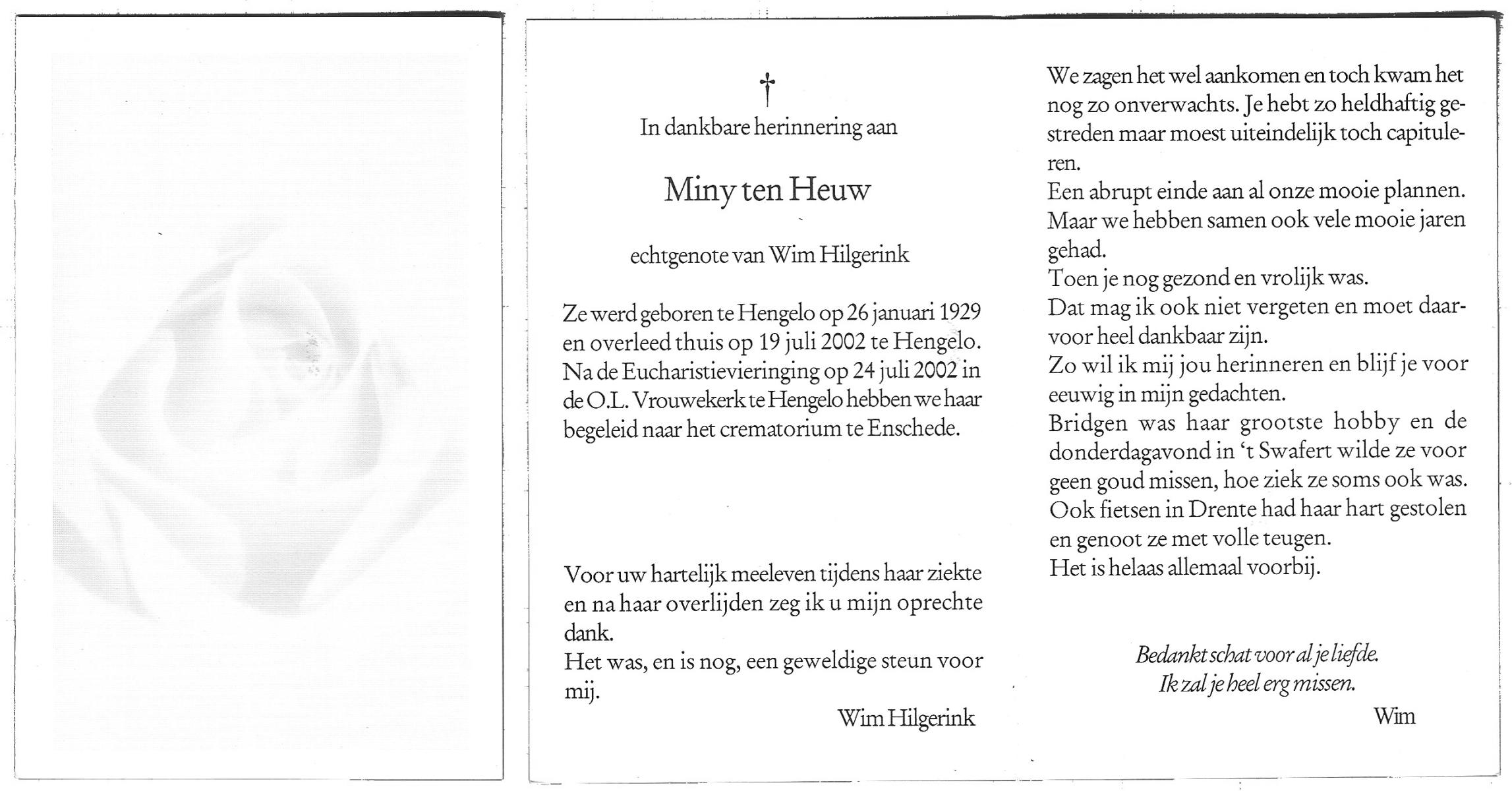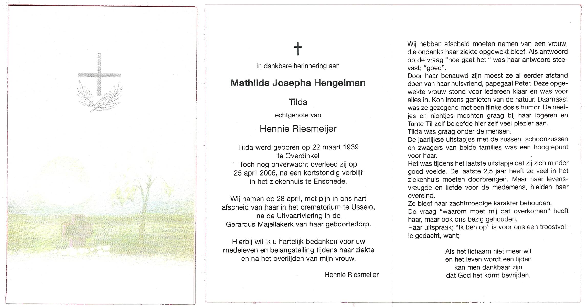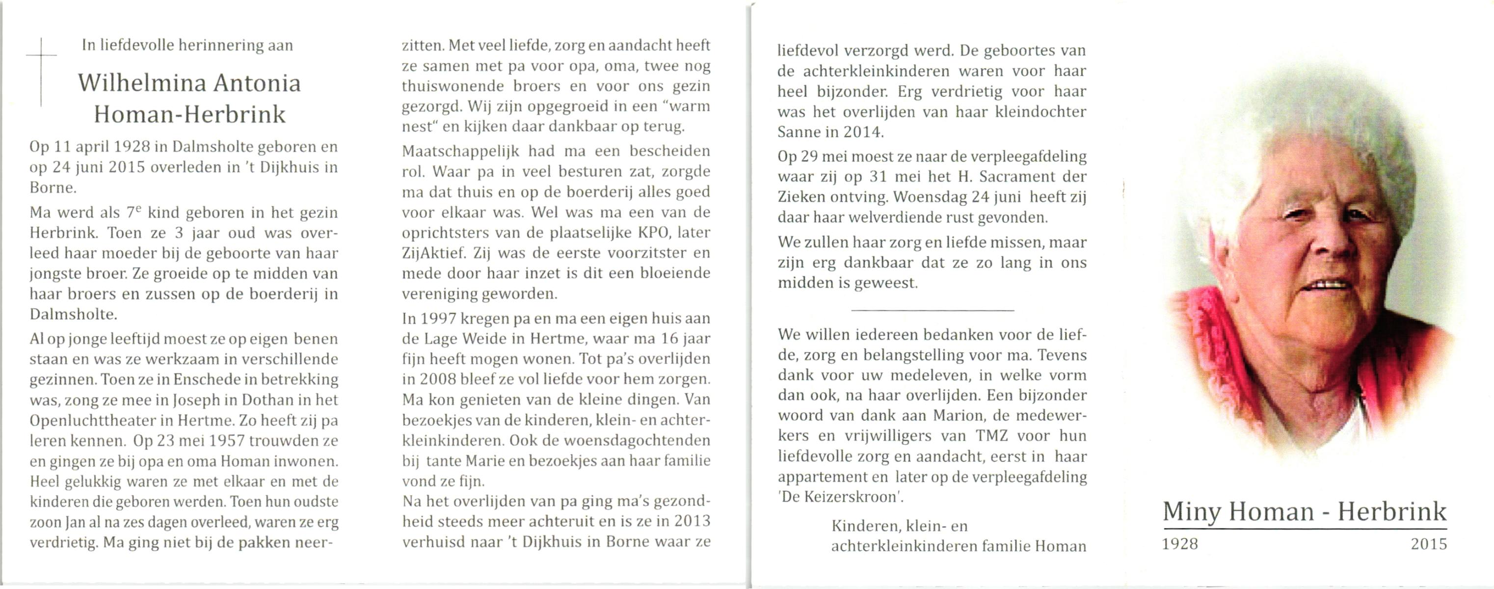 HILBERINK, Wilhelmina Maria Jozefina, geboren op 17-3-1932 te Hellendoorn, Nijverdal, overleden op 26-7-2006 te Hellendoorn op 74-jarige leeftijd, begraven op 31-7-2006 te Hellendoorn, Nijverdal.