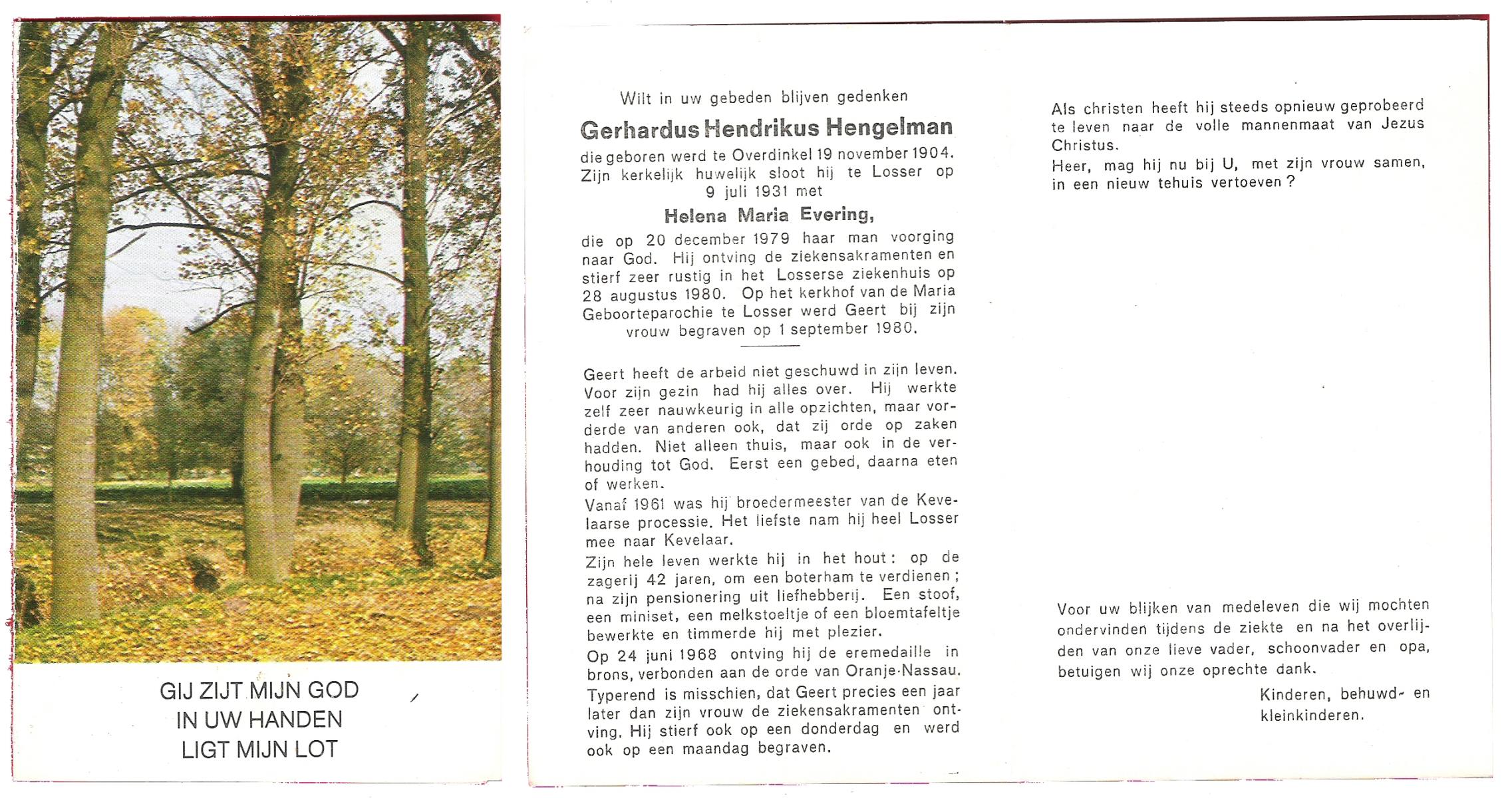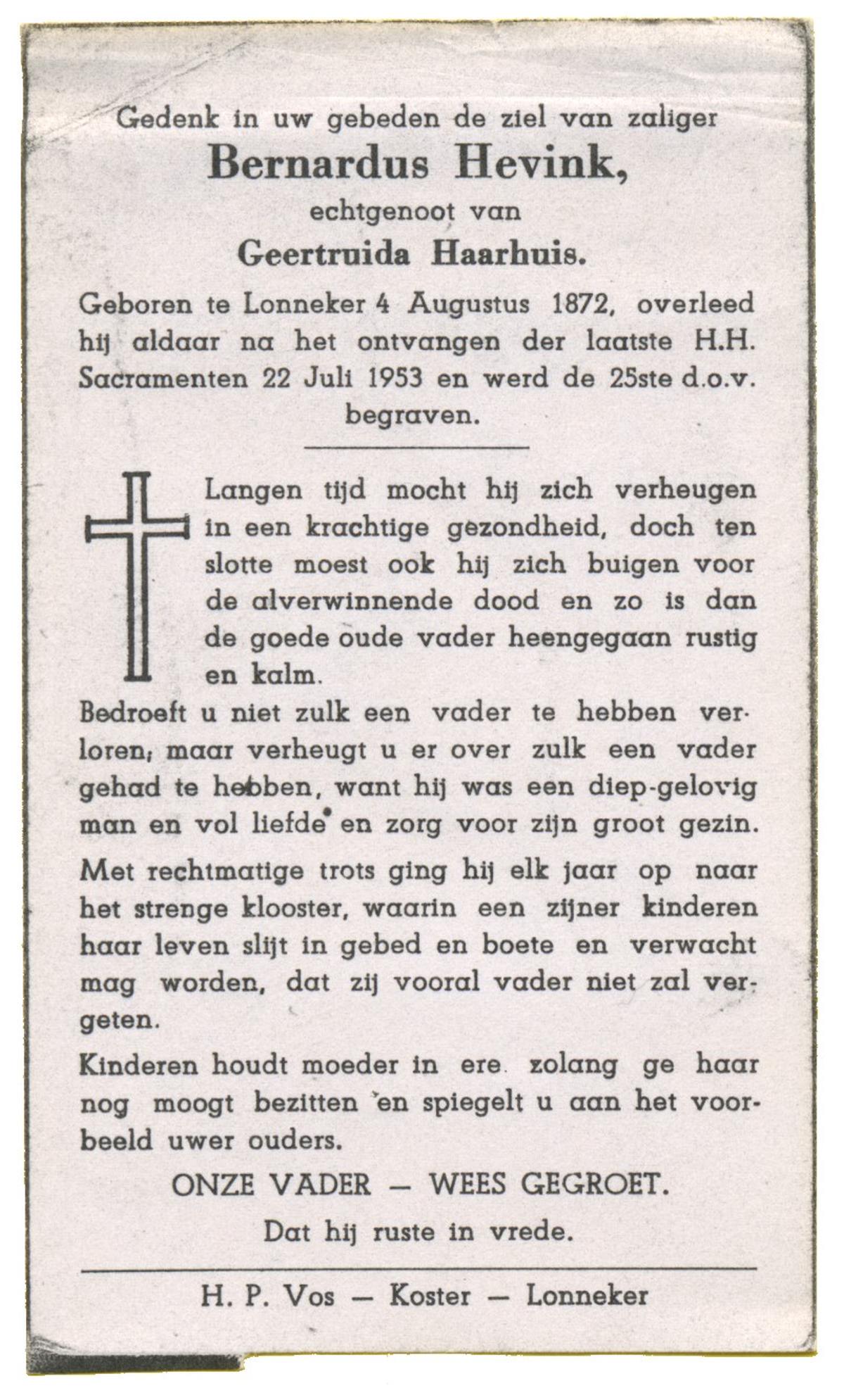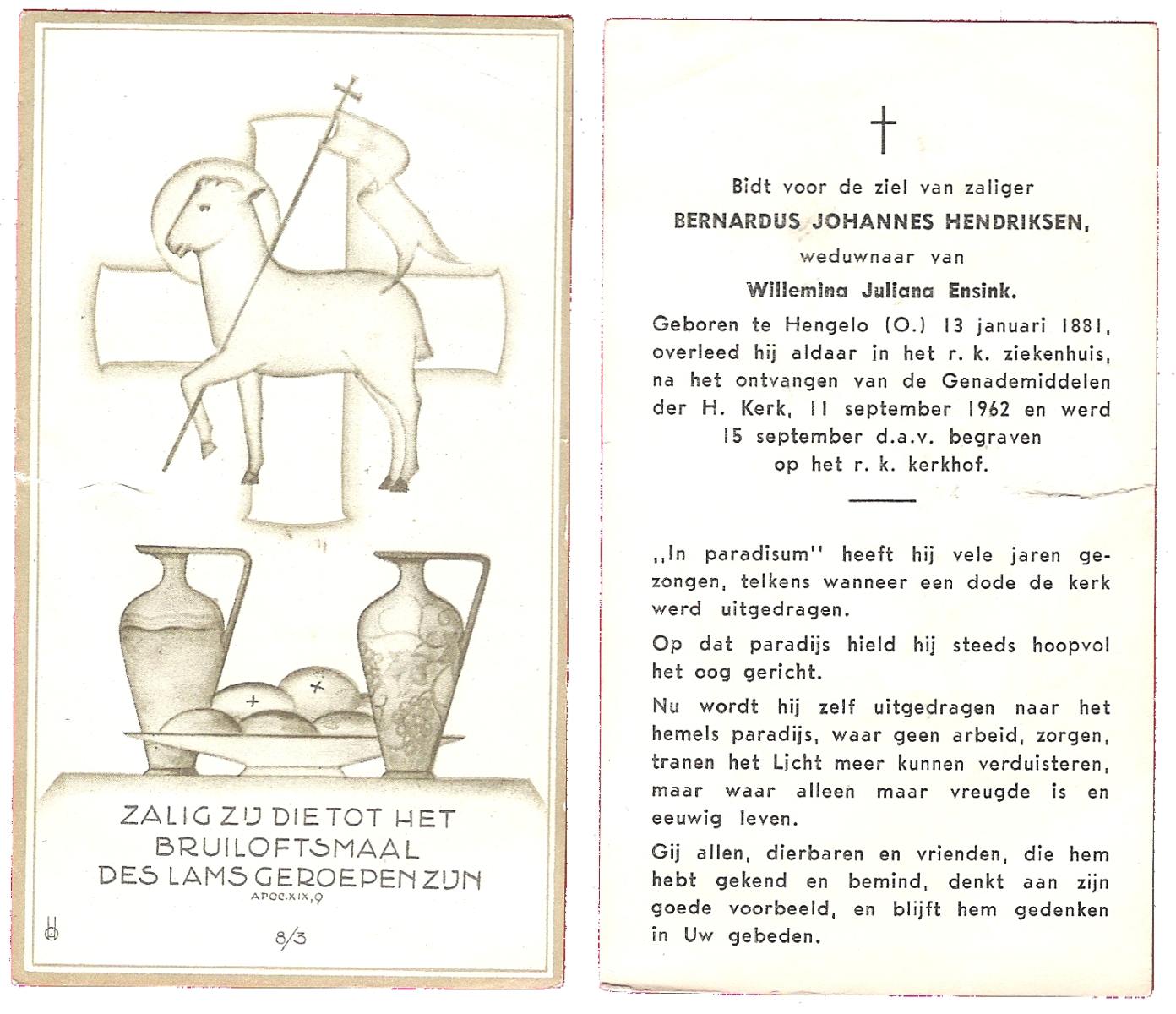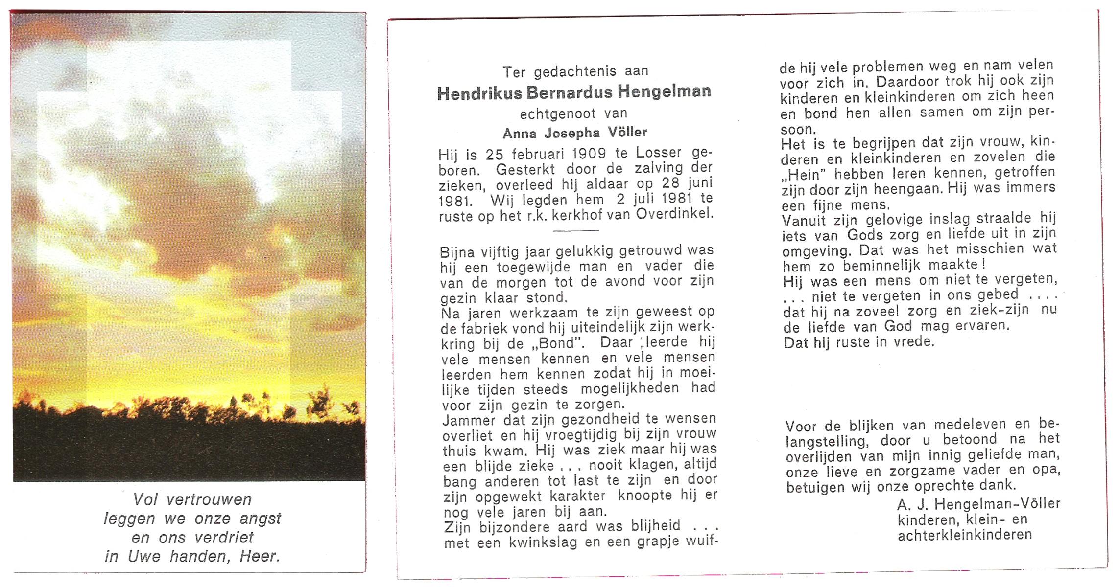 HOBBELINK, Bernardus, geboren op 21-03-1888 te Hengevelde, overleden op 3-4-1980 te Losser op 92-jarige leeftijd, begraven op 8-4-1980 te Hengevelde.