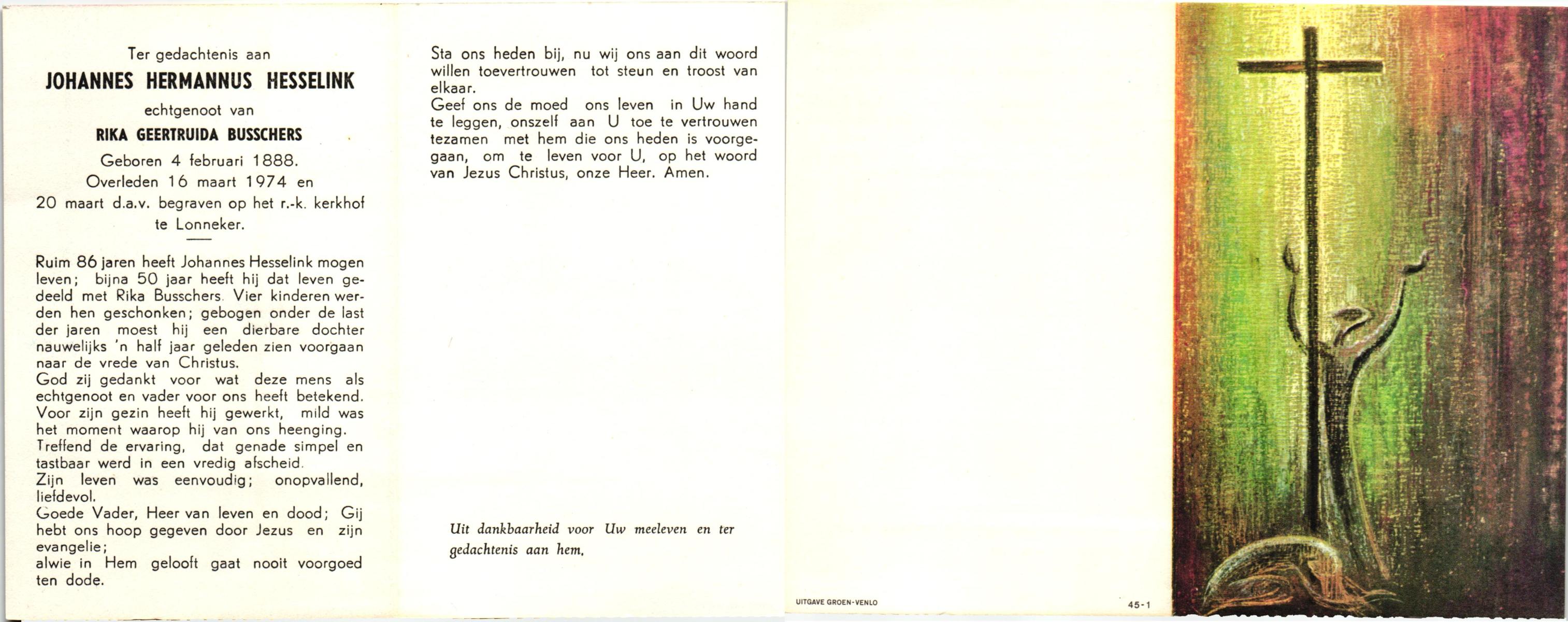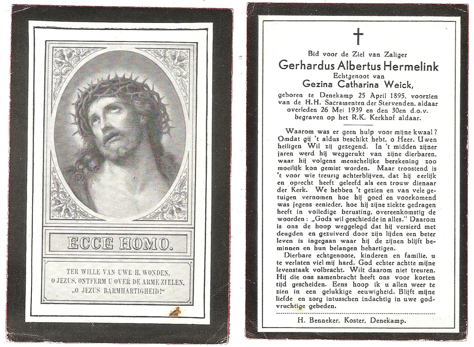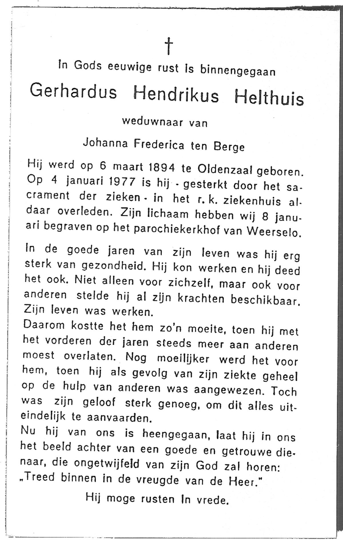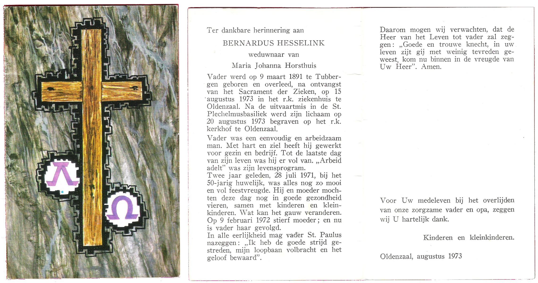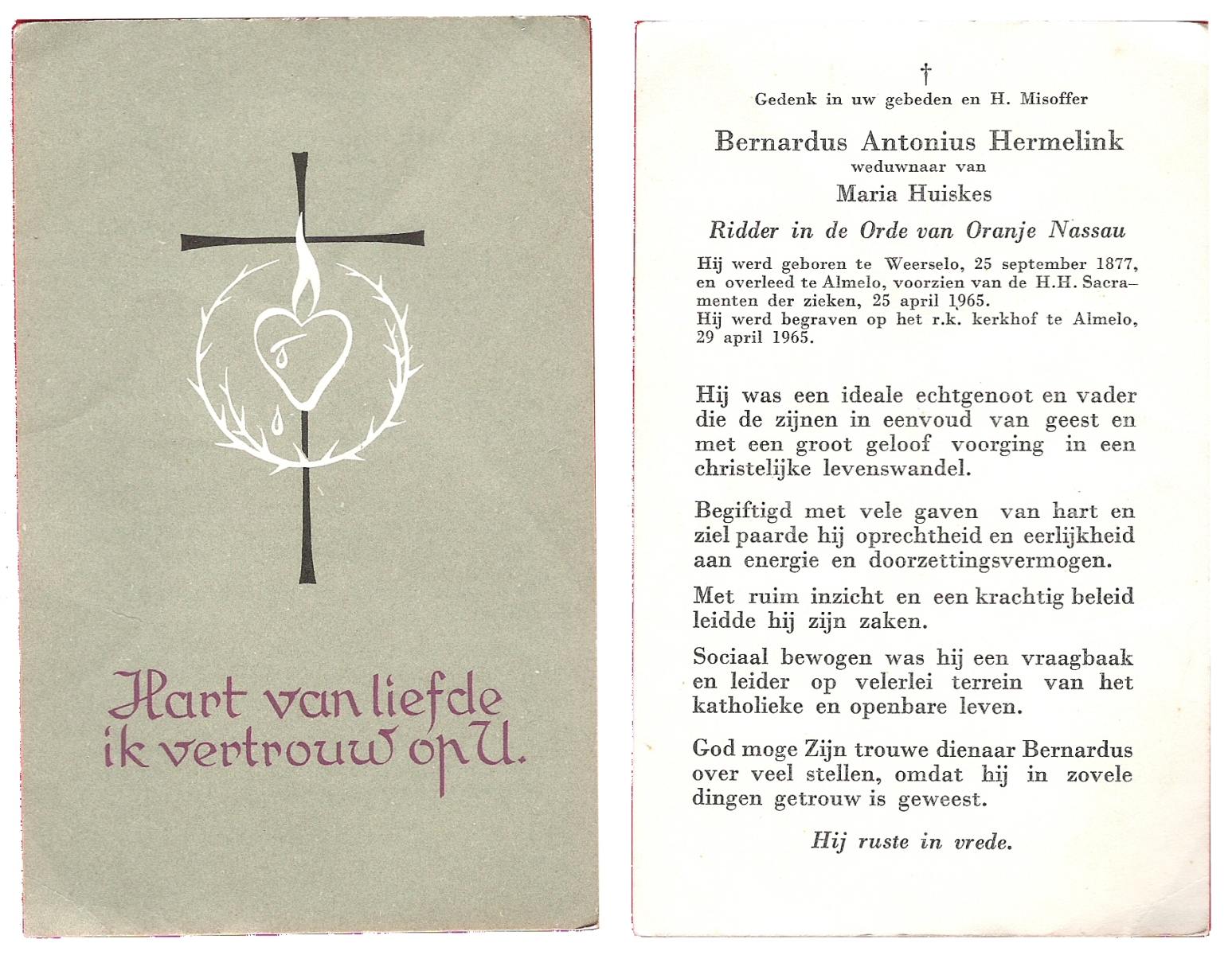 HOBBELINK, Bernardus, geboren op 21-03-1888 te Hengevelde, overleden op 3-4-1980 te Losser op 92-jarige leeftijd, begraven op 8-4-1980 te Hengevelde.