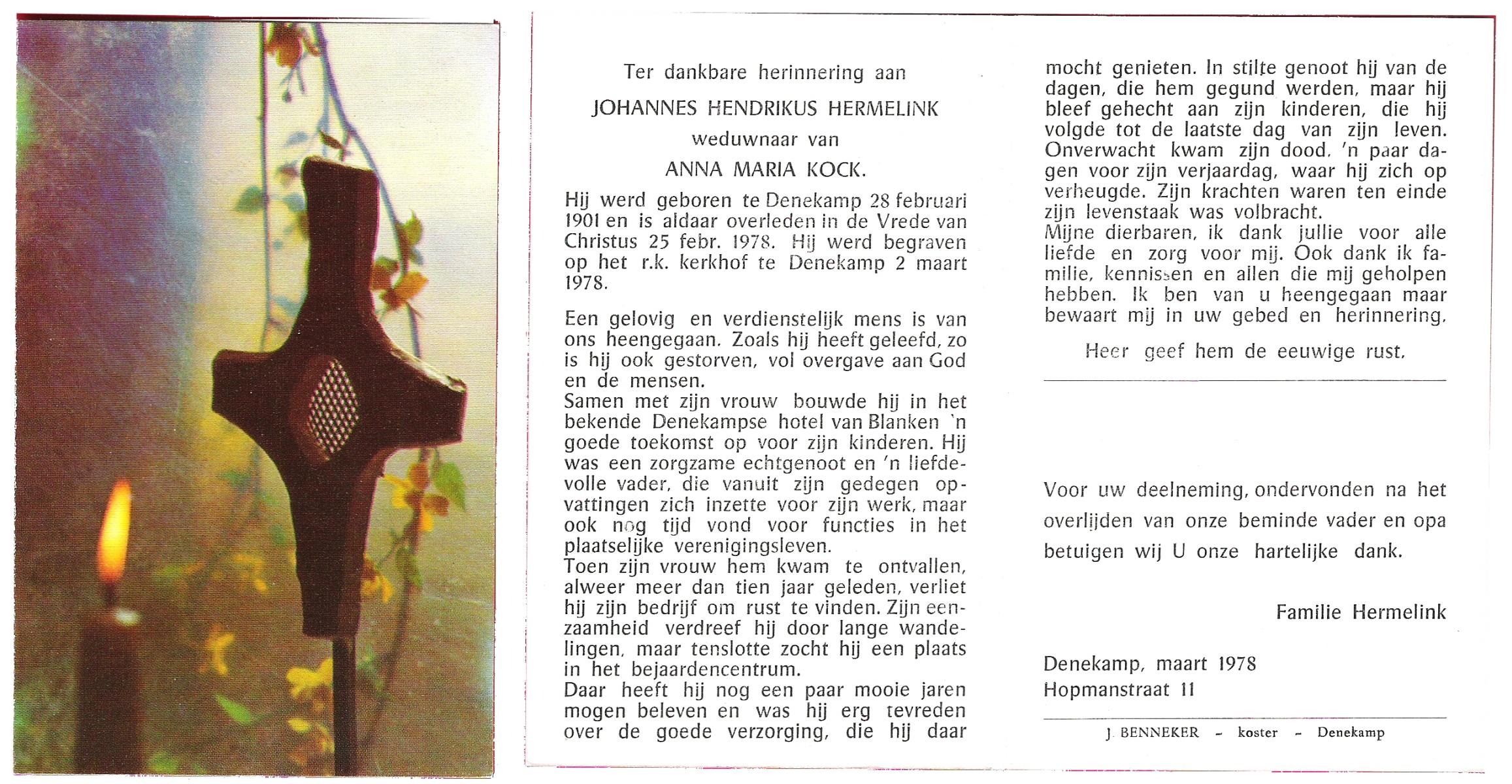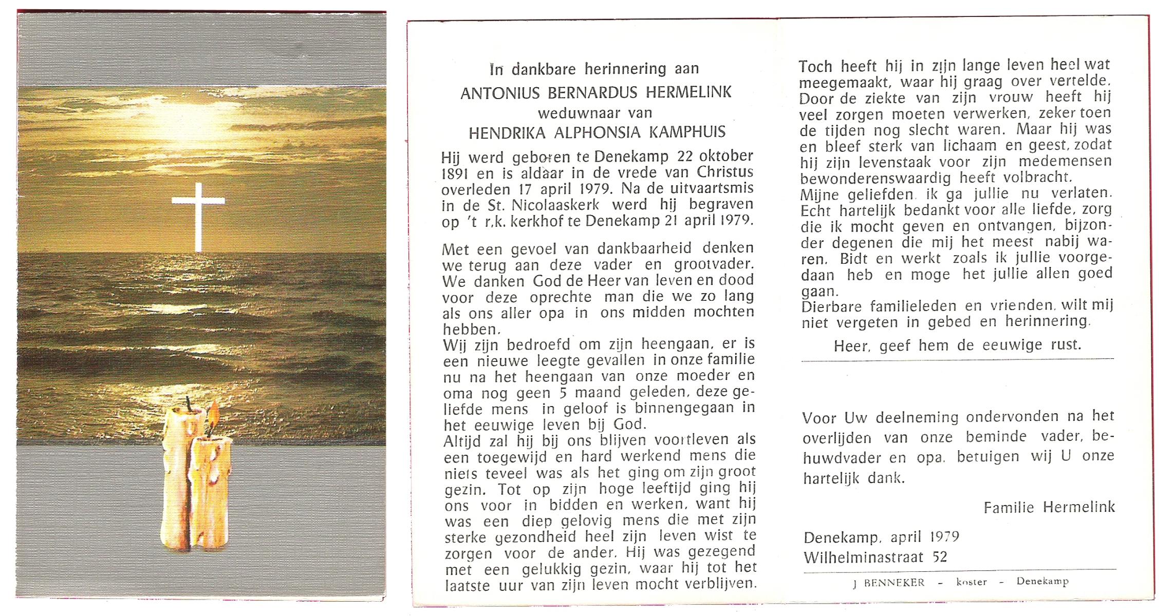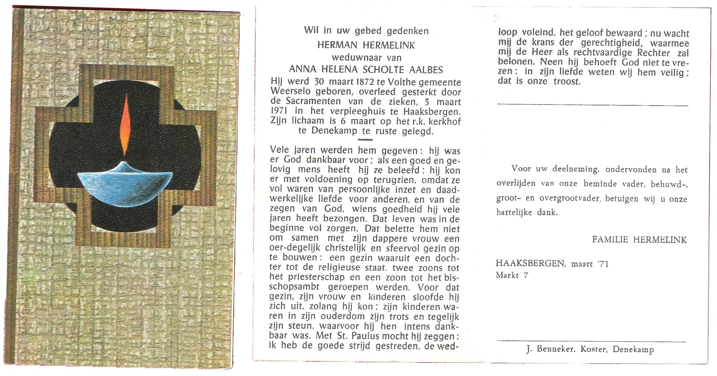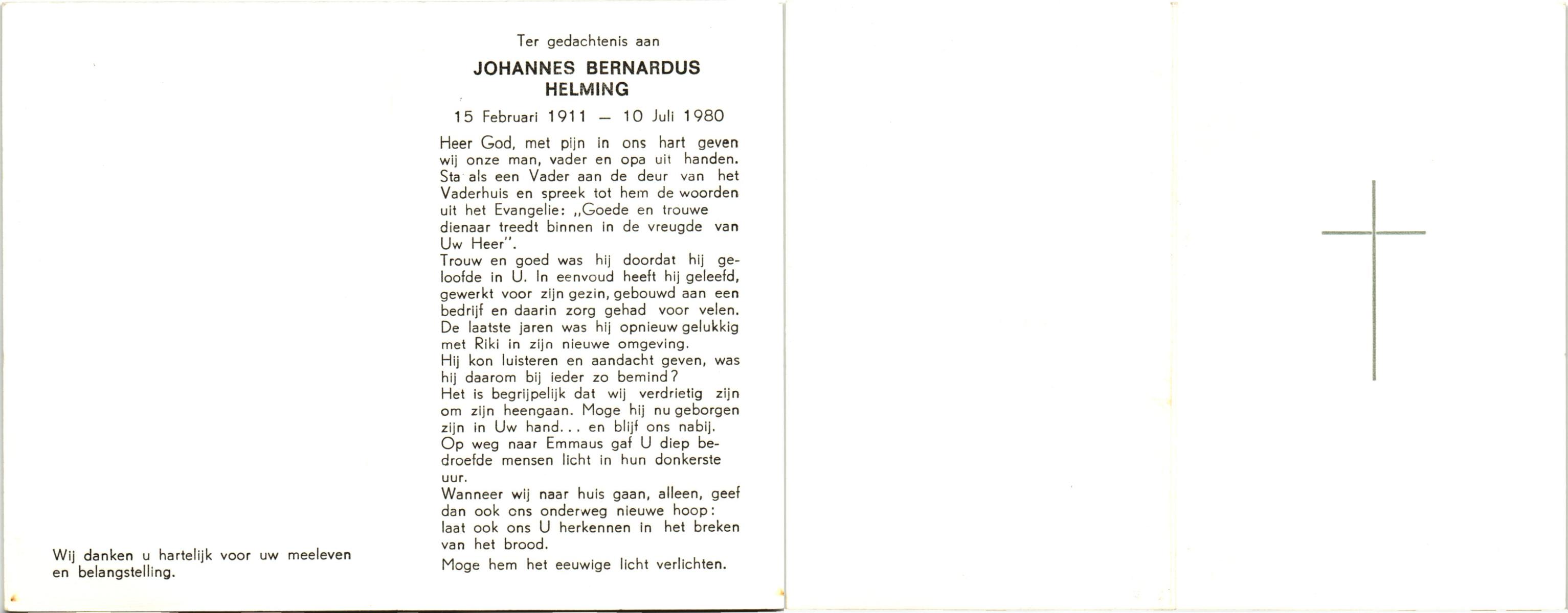HOBBELINK, Bernardus, geboren op 21-03-1888 te Hengevelde, overleden op 3-4-1980 te Losser op 92-jarige leeftijd, begraven op 8-4-1980 te Hengevelde.