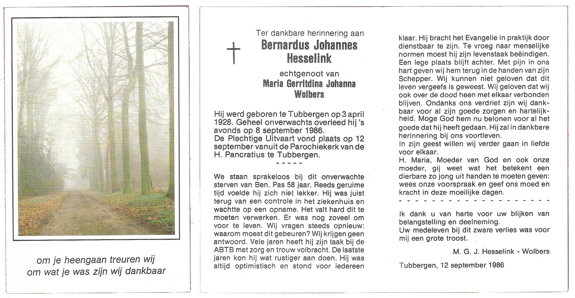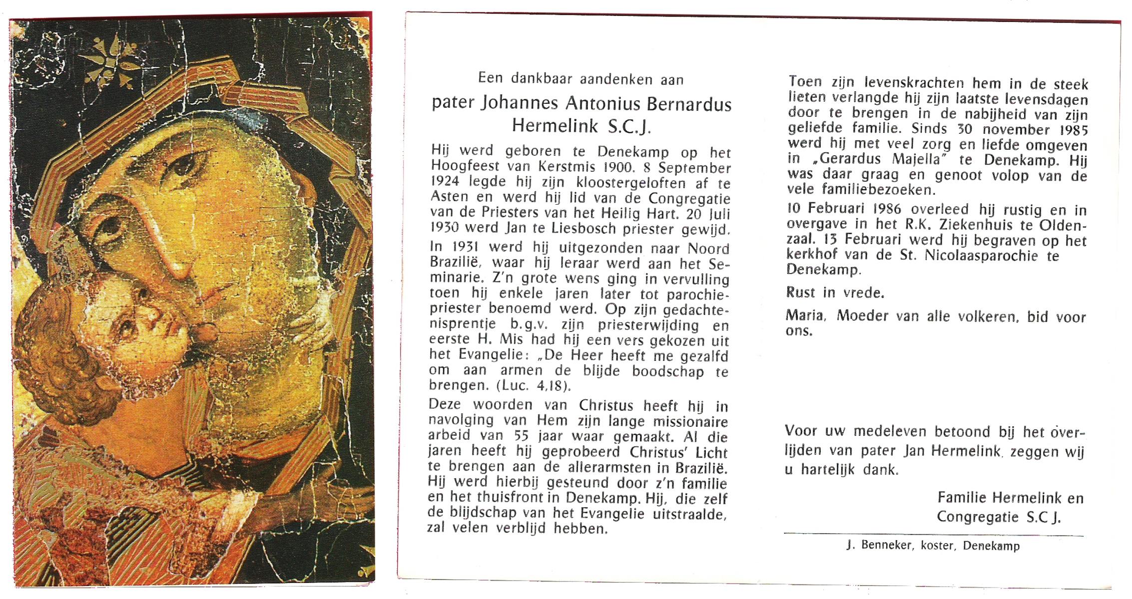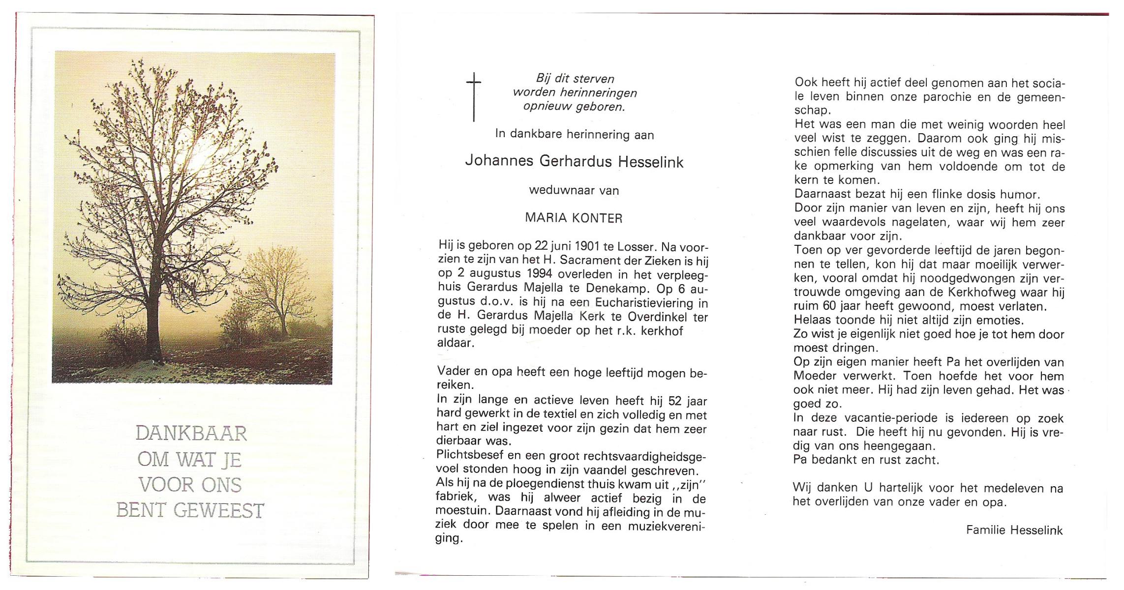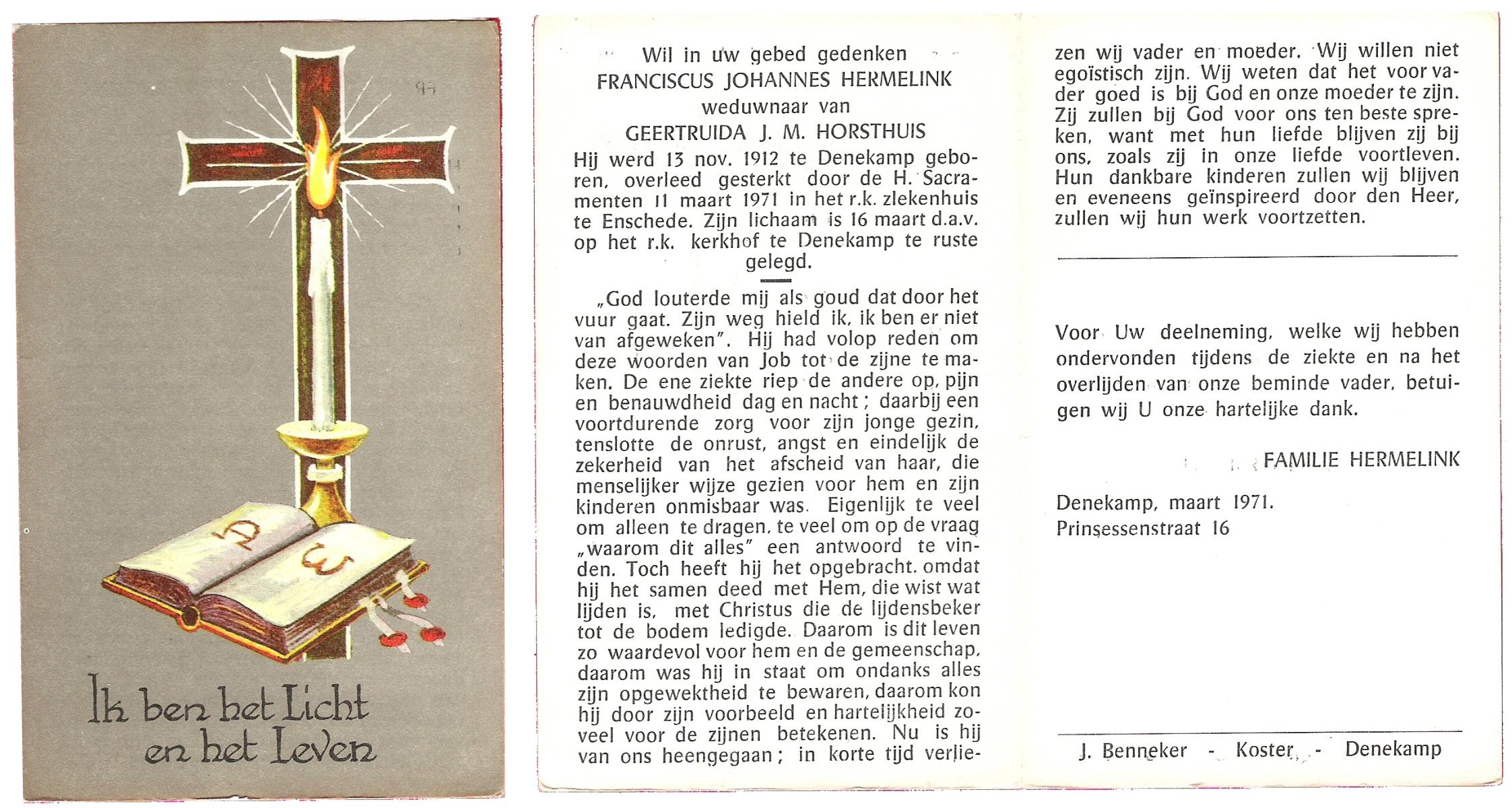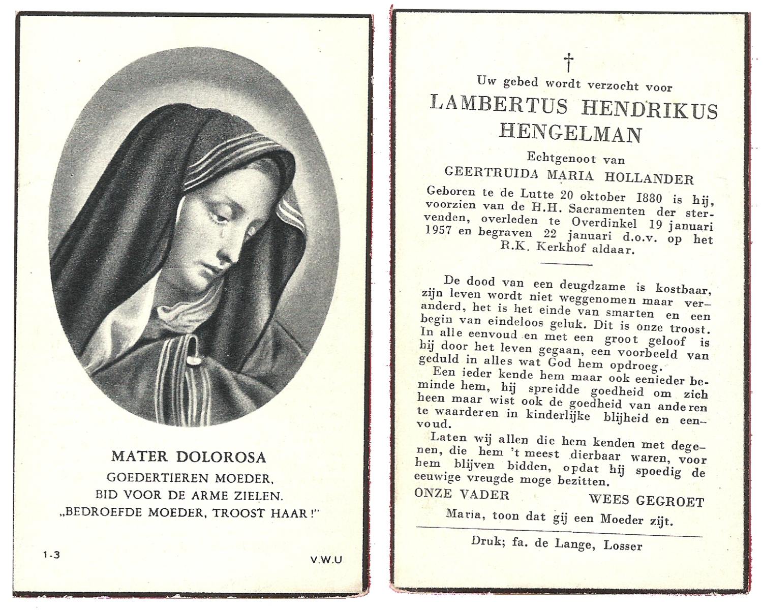 HOBBELINK, Bernardus, geboren op 21-03-1888 te Hengevelde, overleden op 3-4-1980 te Losser op 92-jarige leeftijd, begraven op 8-4-1980 te Hengevelde.