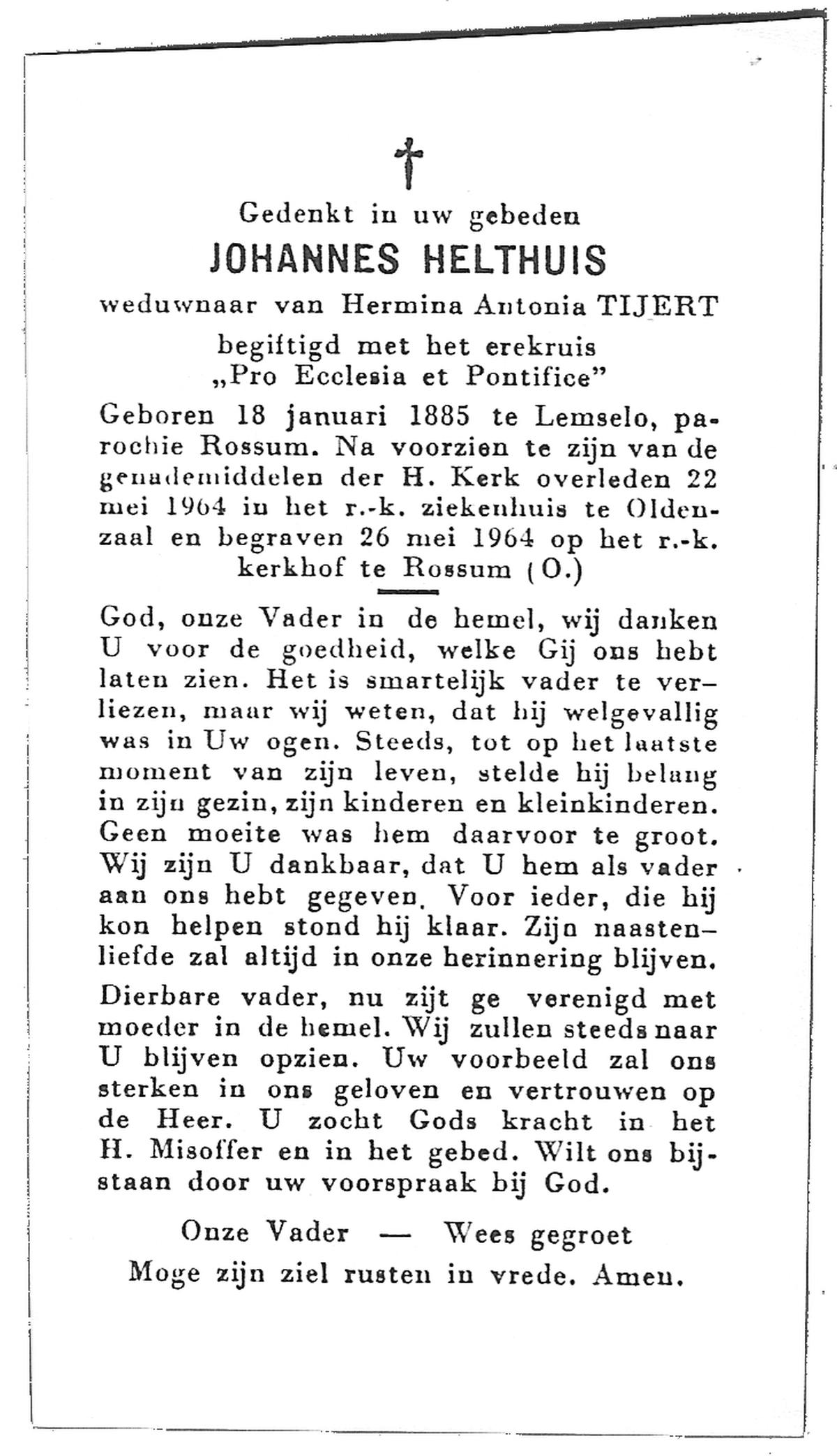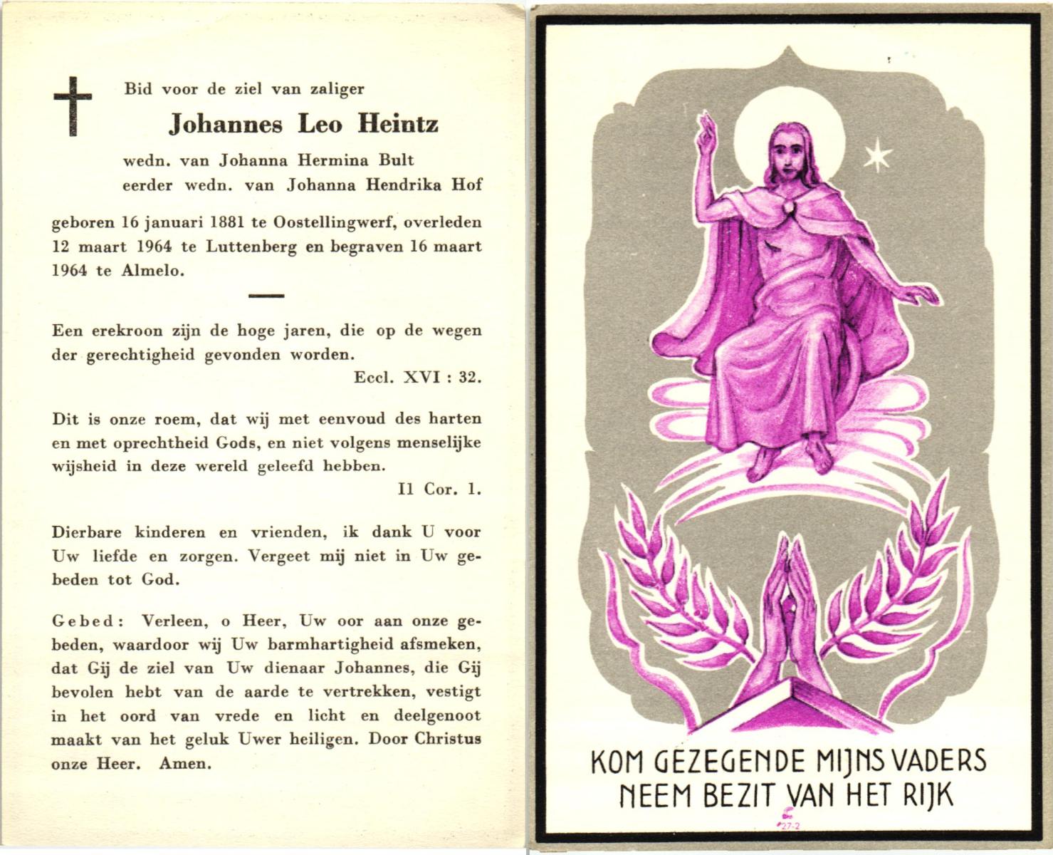 HEINTZ, Johannes Leo, geboren op 16-01-1881 te Ooststellingwerf, overleden op 12-3-1964 te Raalte, Luttenberg op 83-jarige leeftijd, begraven op 16-3-1964 te Almelo.