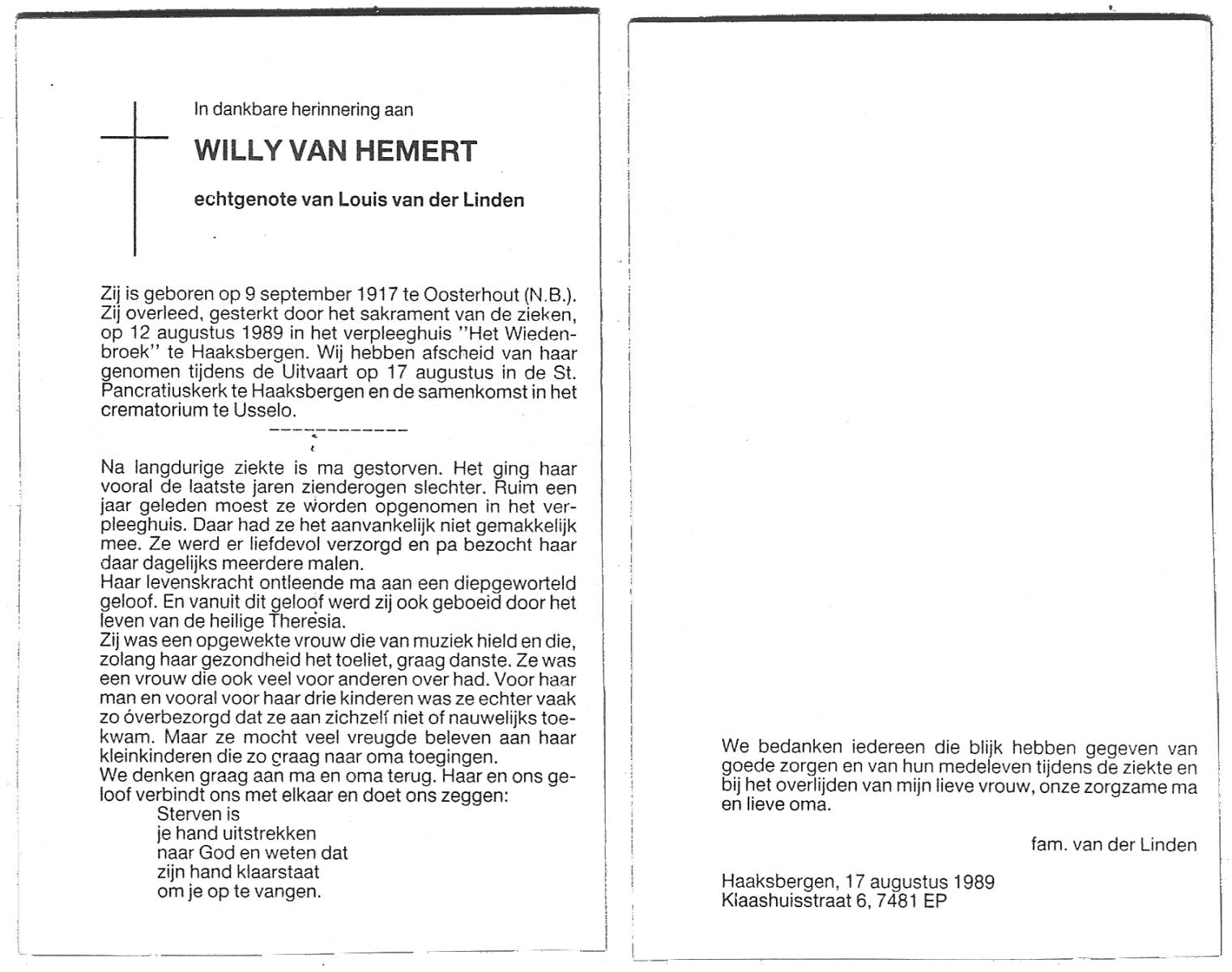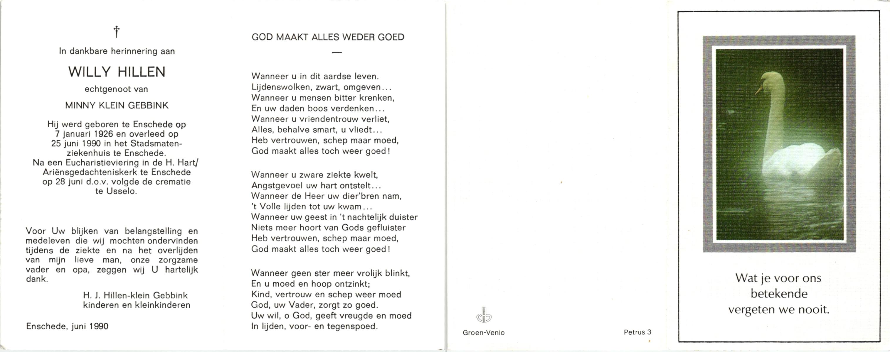 HILLEN, , Willy, geboren op 7-1-1926 te Enschede, overleden op 25-6-1990 te Enschede op 64-jarige leeftijd, gecremeerd op 28-6-1990 te Usselo.