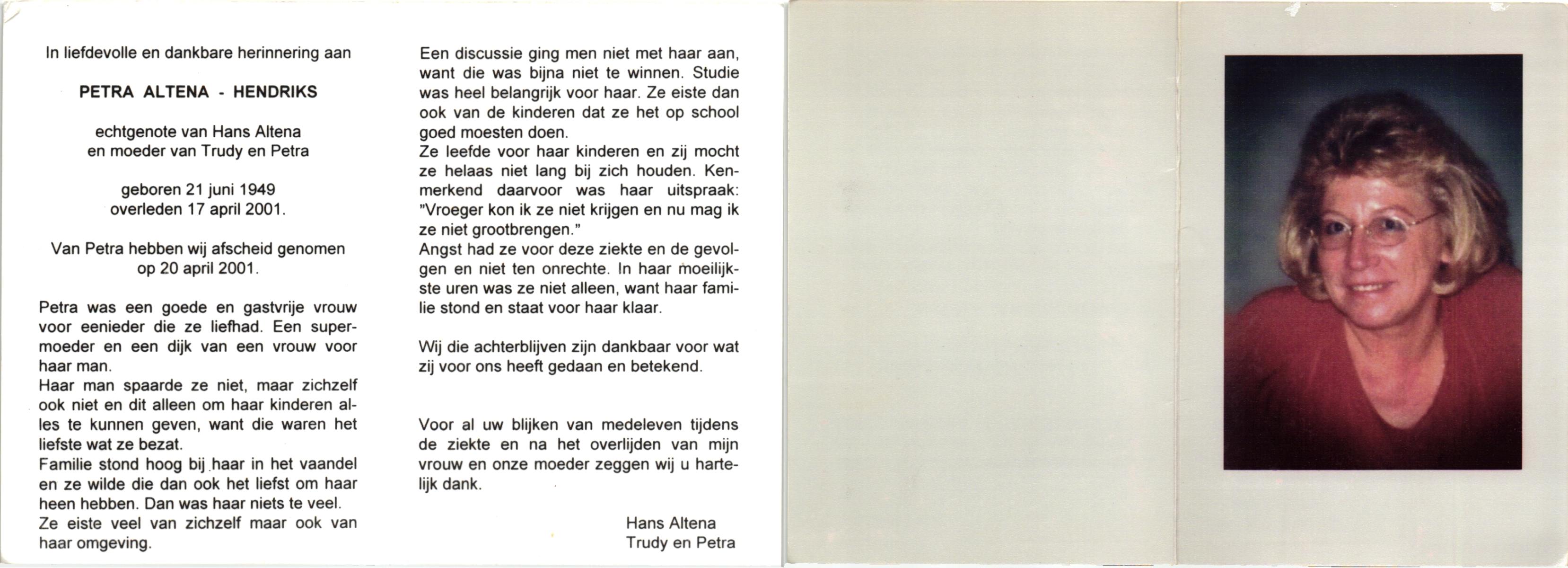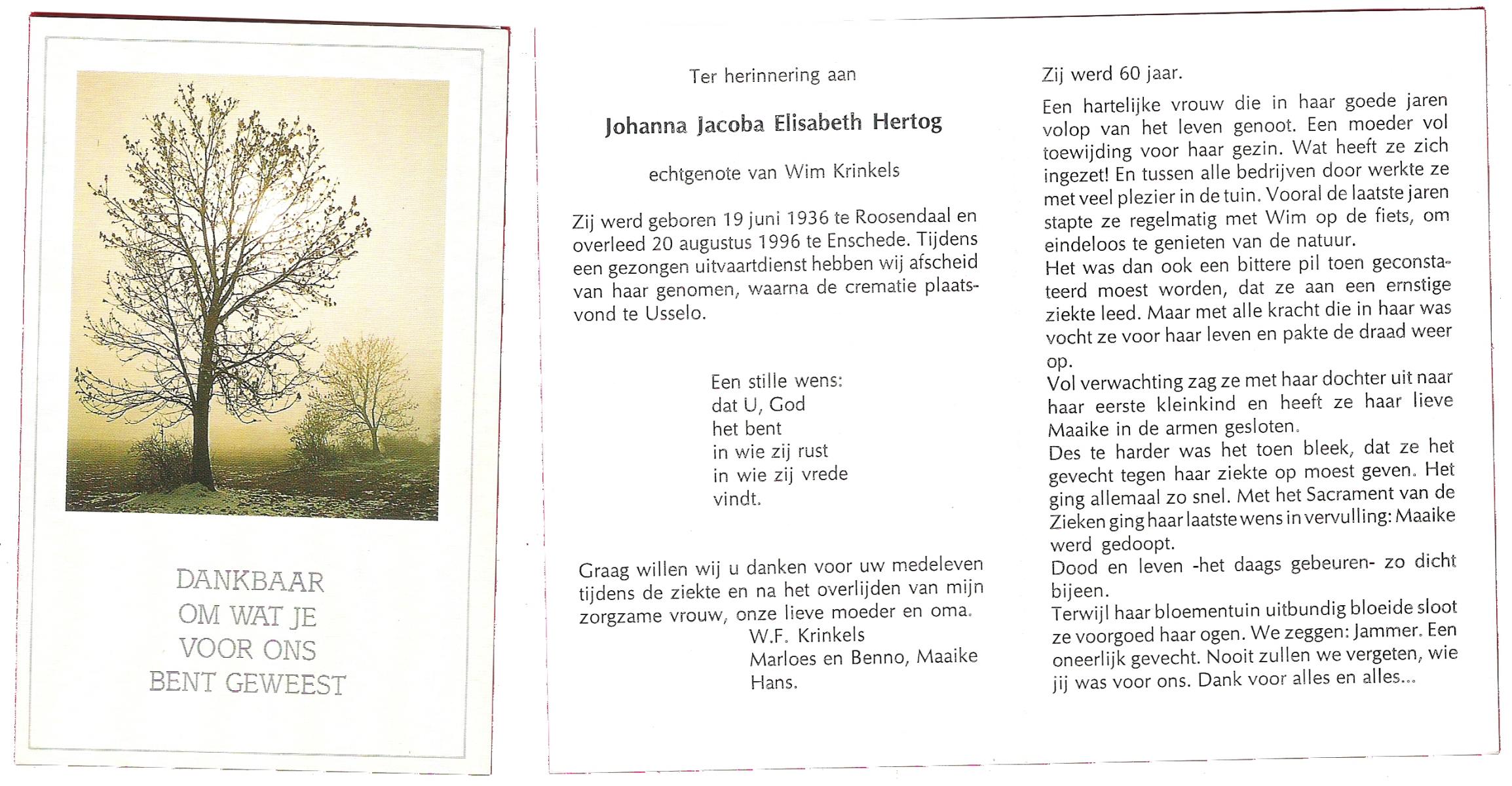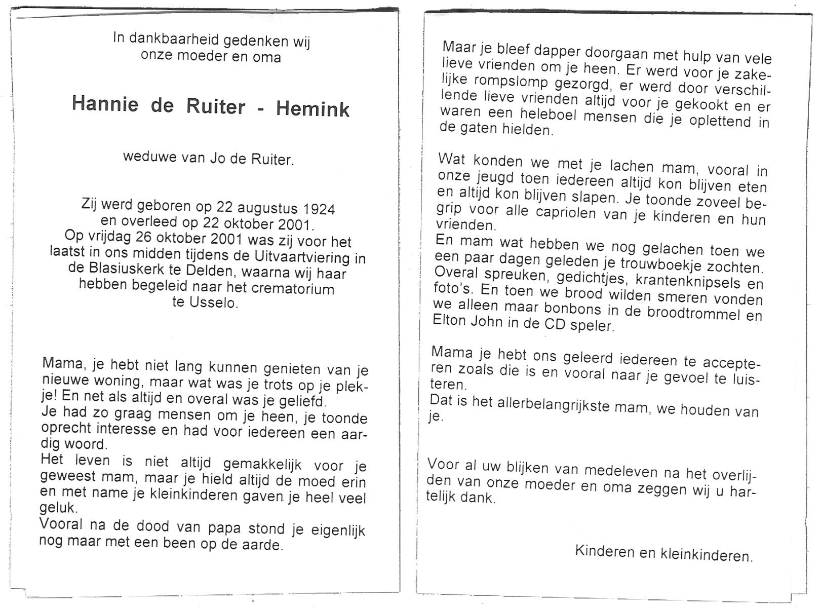 HINDERIKS, Johanna Margaretha, geboren op 30-10-1929 te Gramsbergen, overleden op 15-1-2005 te Almelo op 75-jarige leeftijd, begraven op 21-1-2005 te Hellendoorn, Nijverdal.