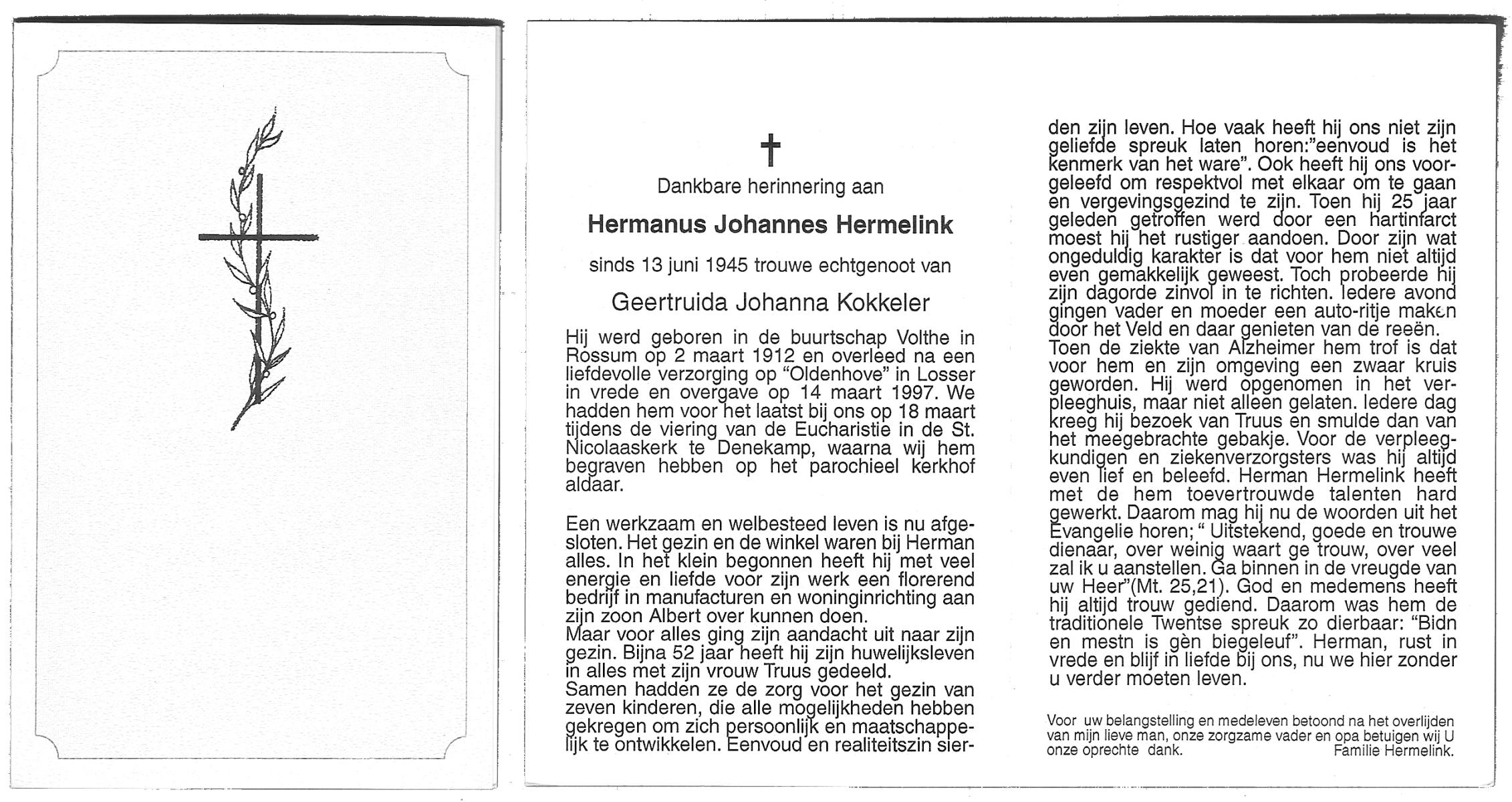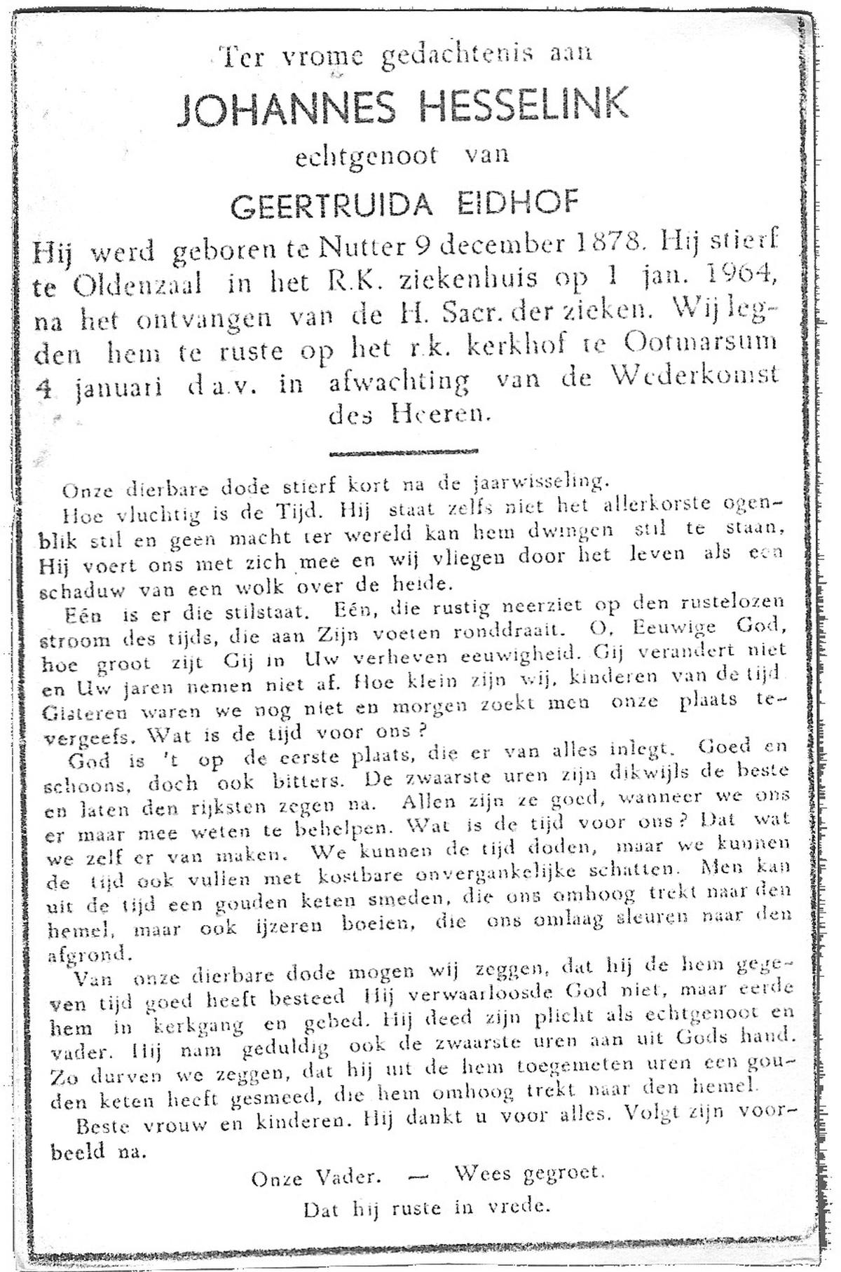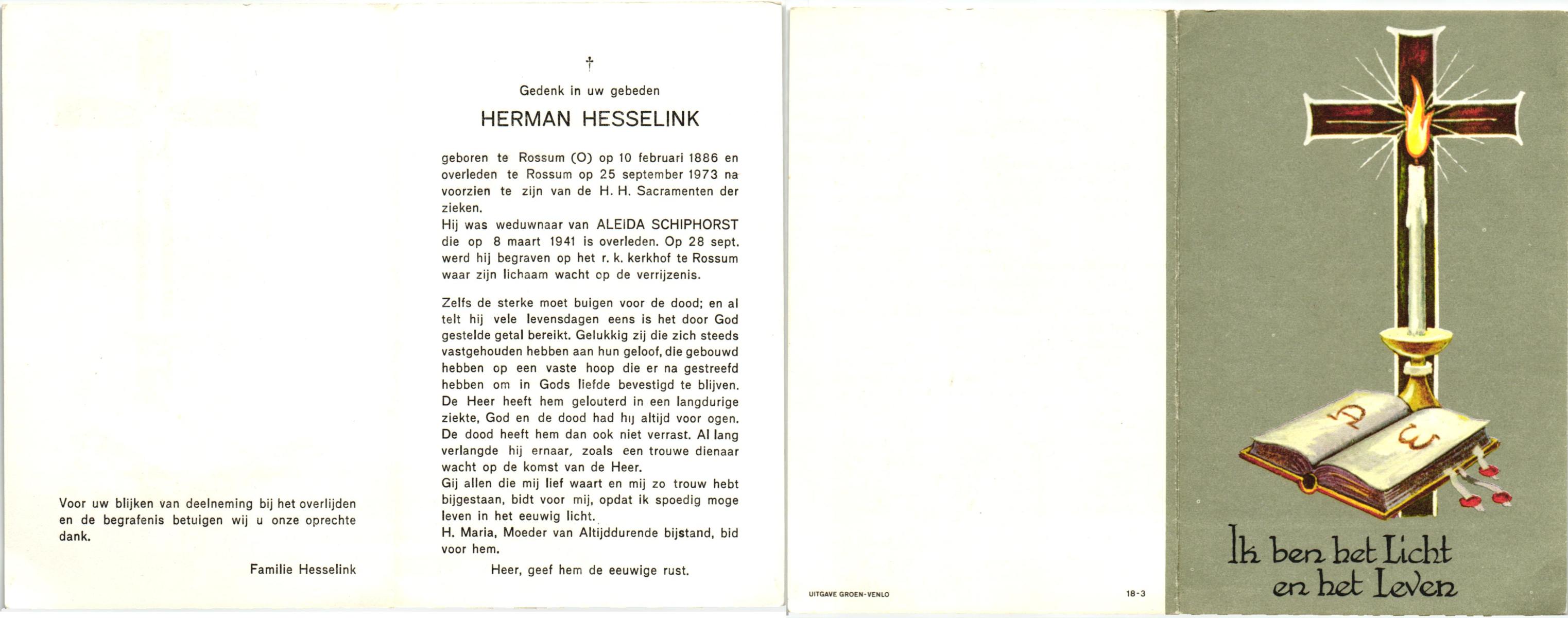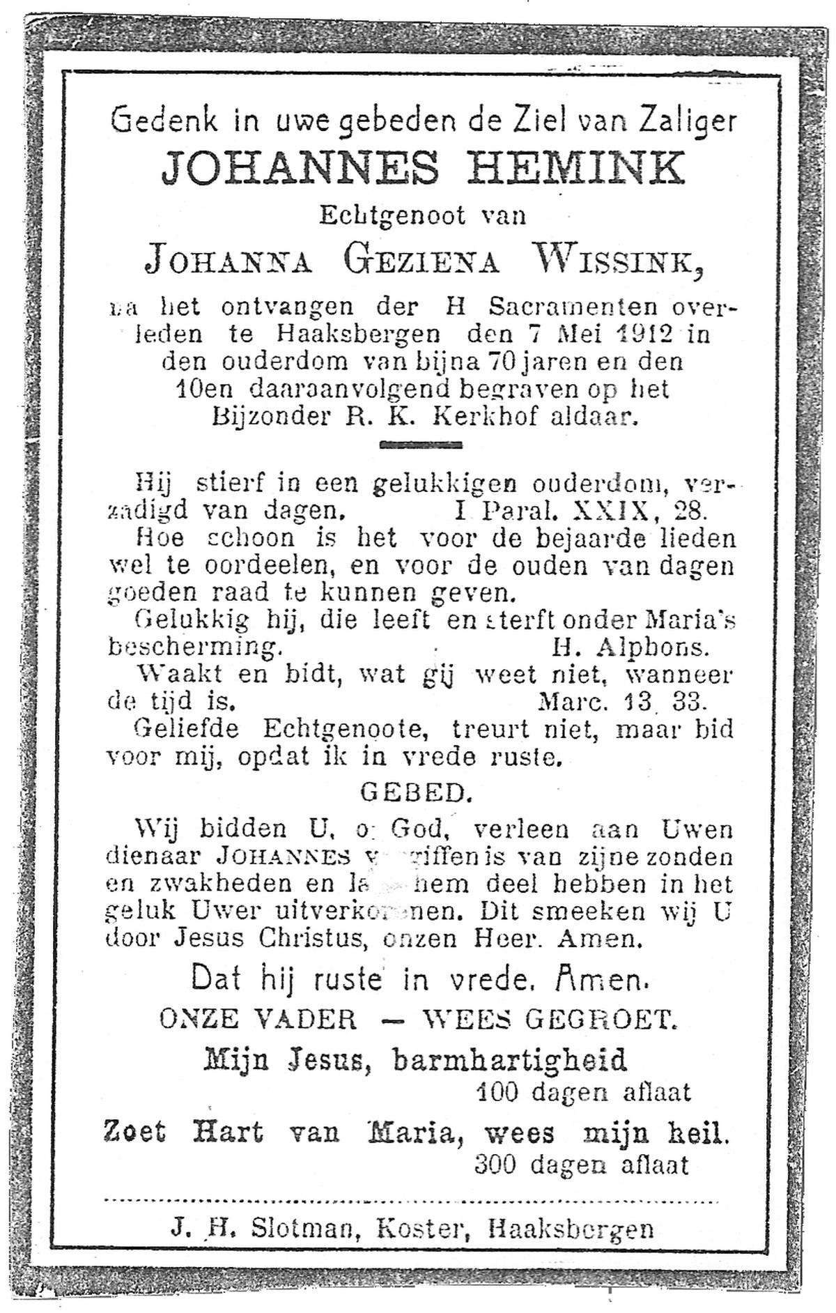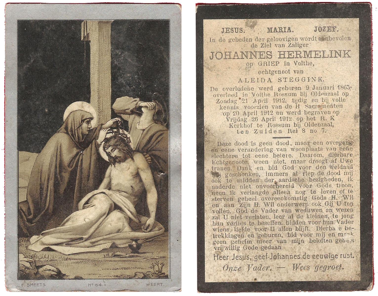 HOBBELINK, Hermanus, geboren op 27-04-1864 te Weerselo, overleden op 6-1-1942 te Lemselo op 77-jarige leeftijd, begraven op 10-1-1942 te Rossum.