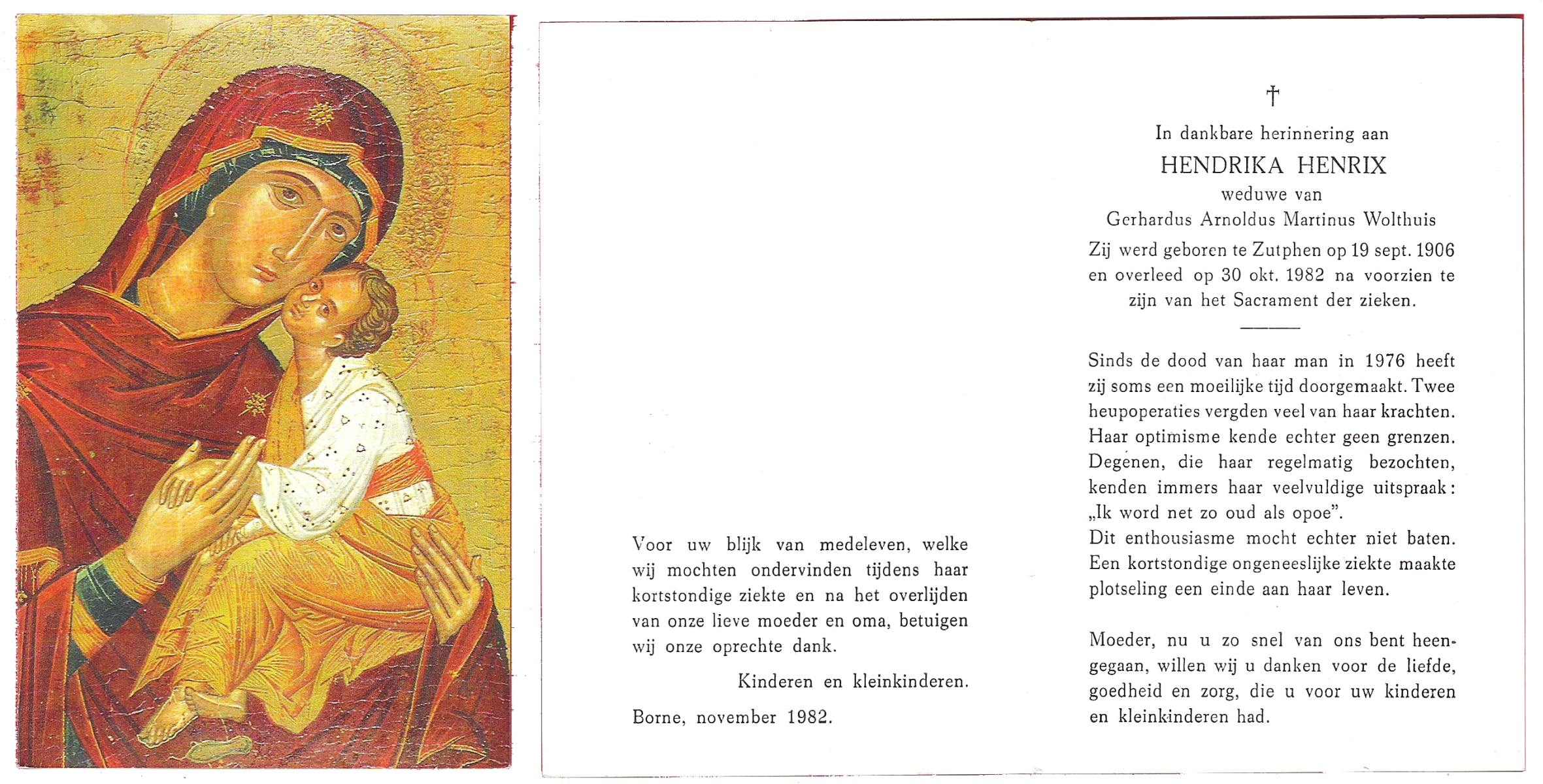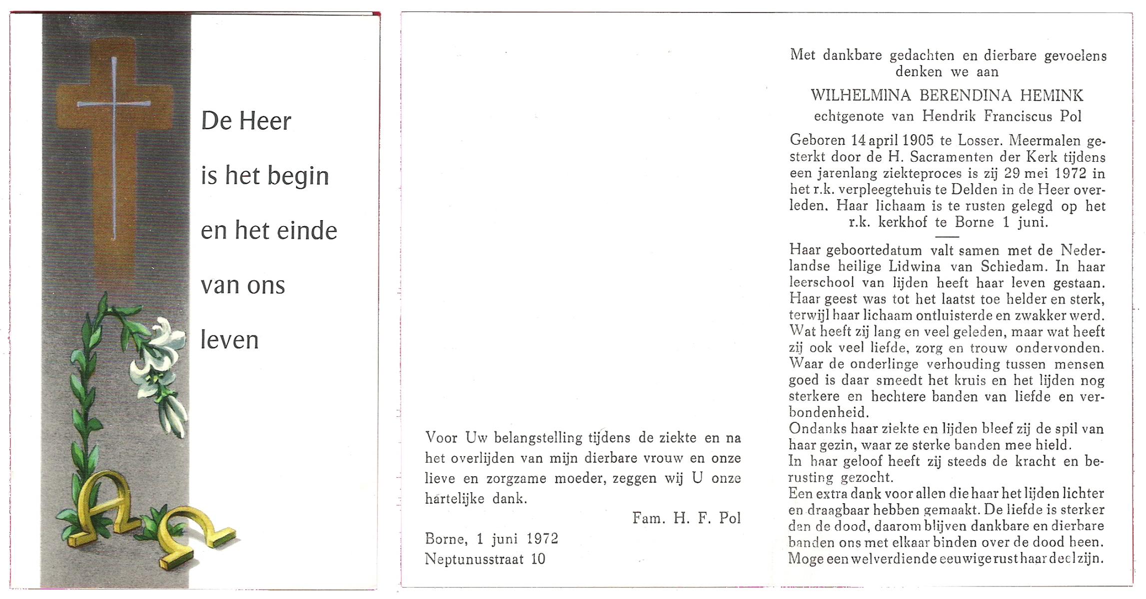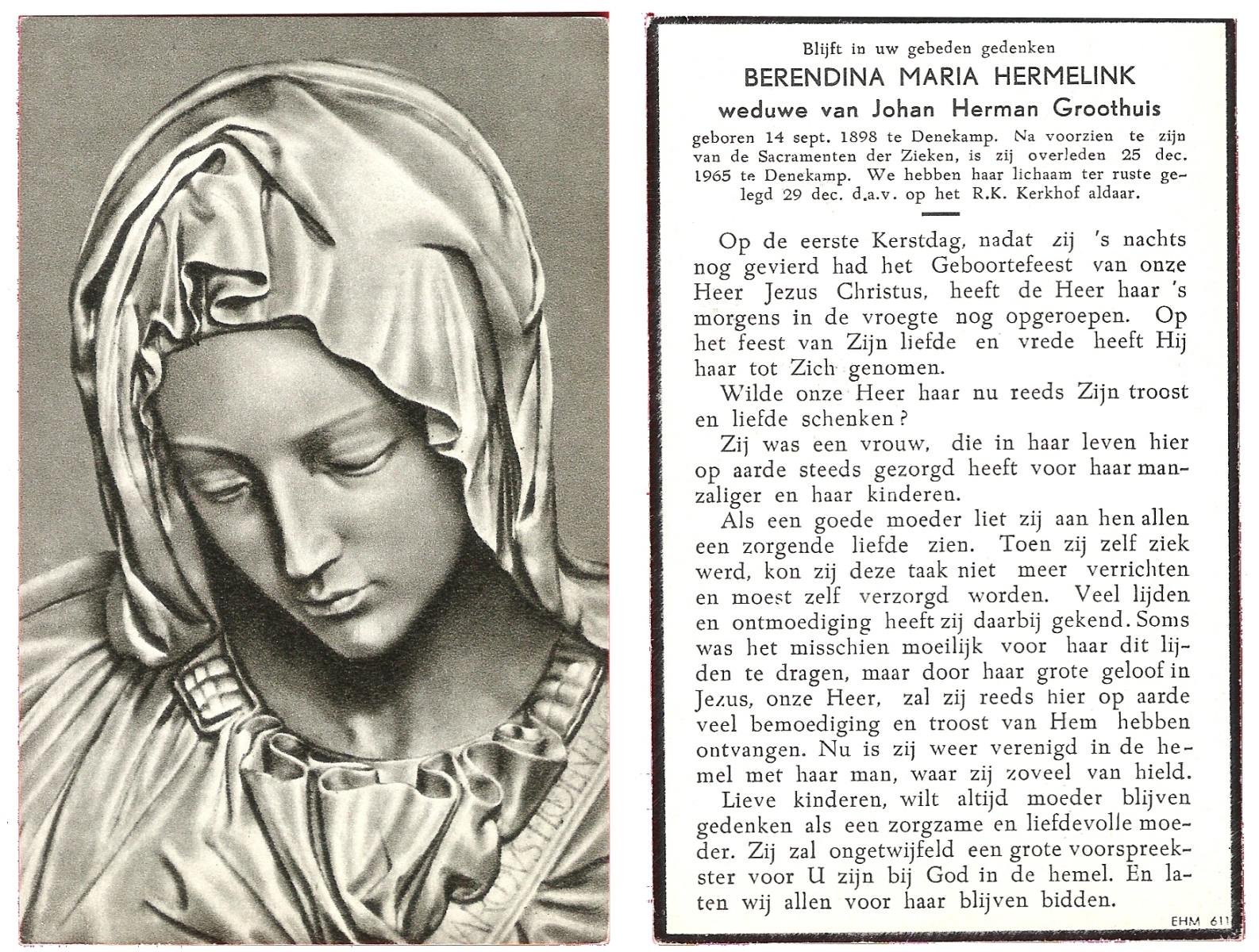 HILBERINK, Maria Berendina, geboren op 9-5-1905 te Ootmarsum, overleden op 12-7-1982 te Borne op 77-jarige leeftijd, begraven op 15-7-1982 te Borne.