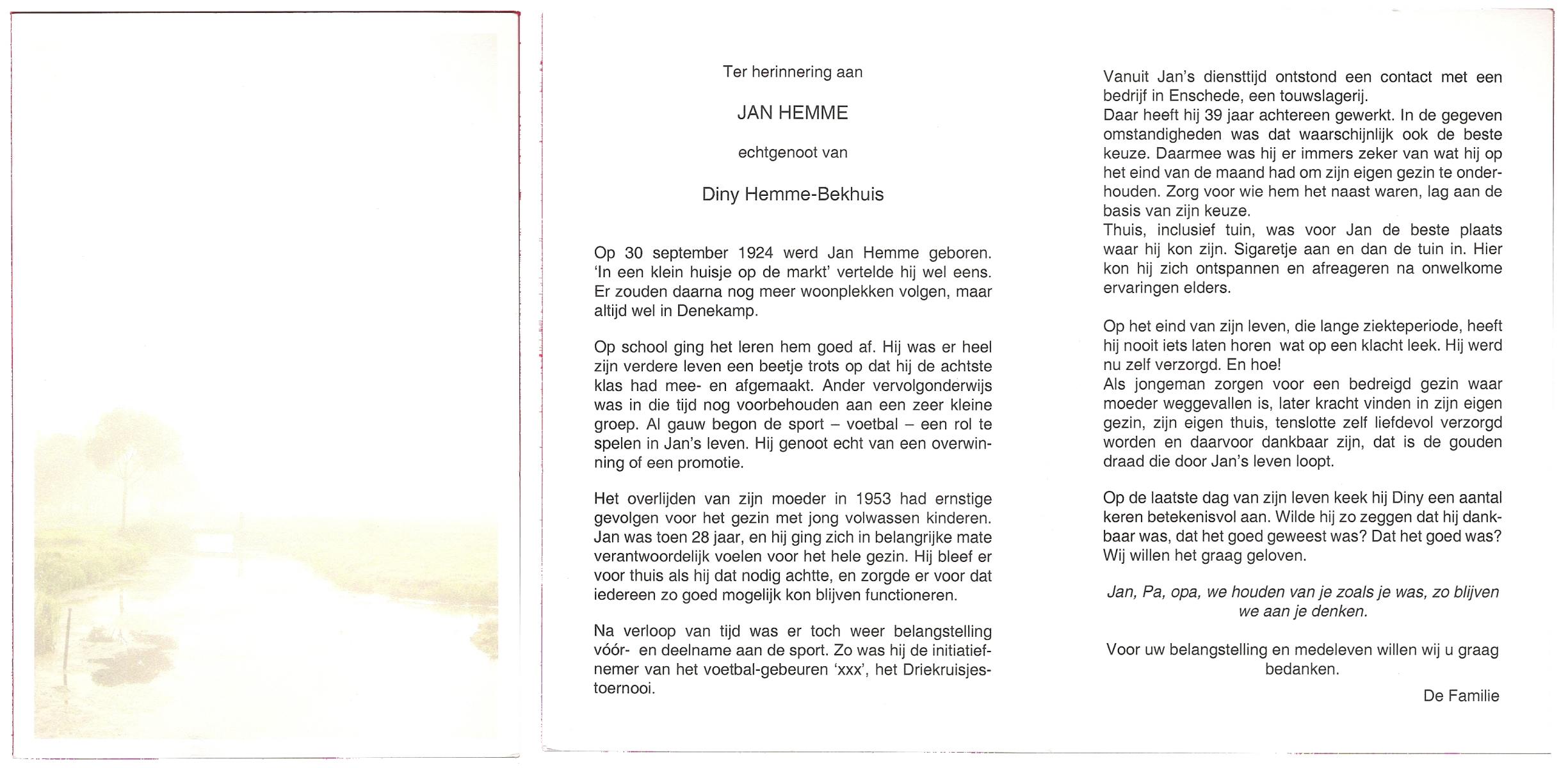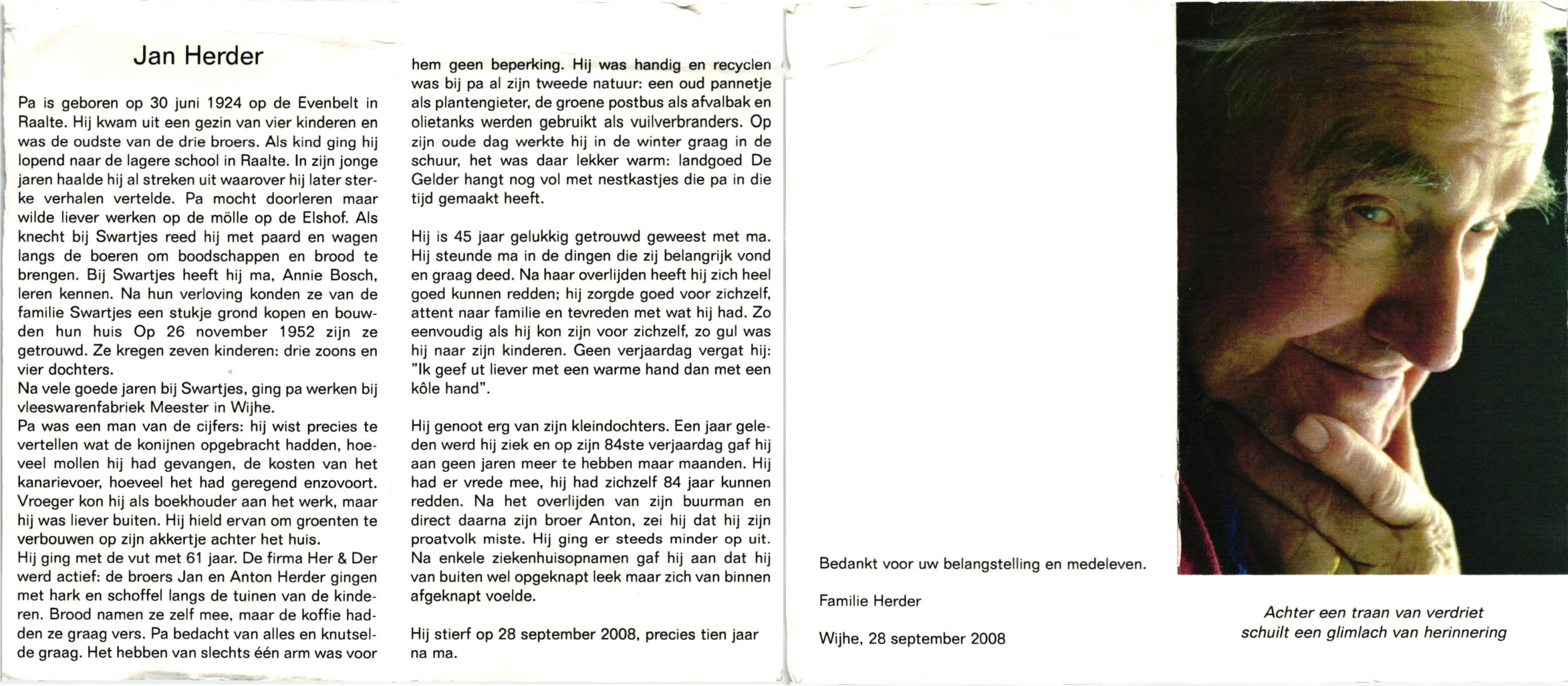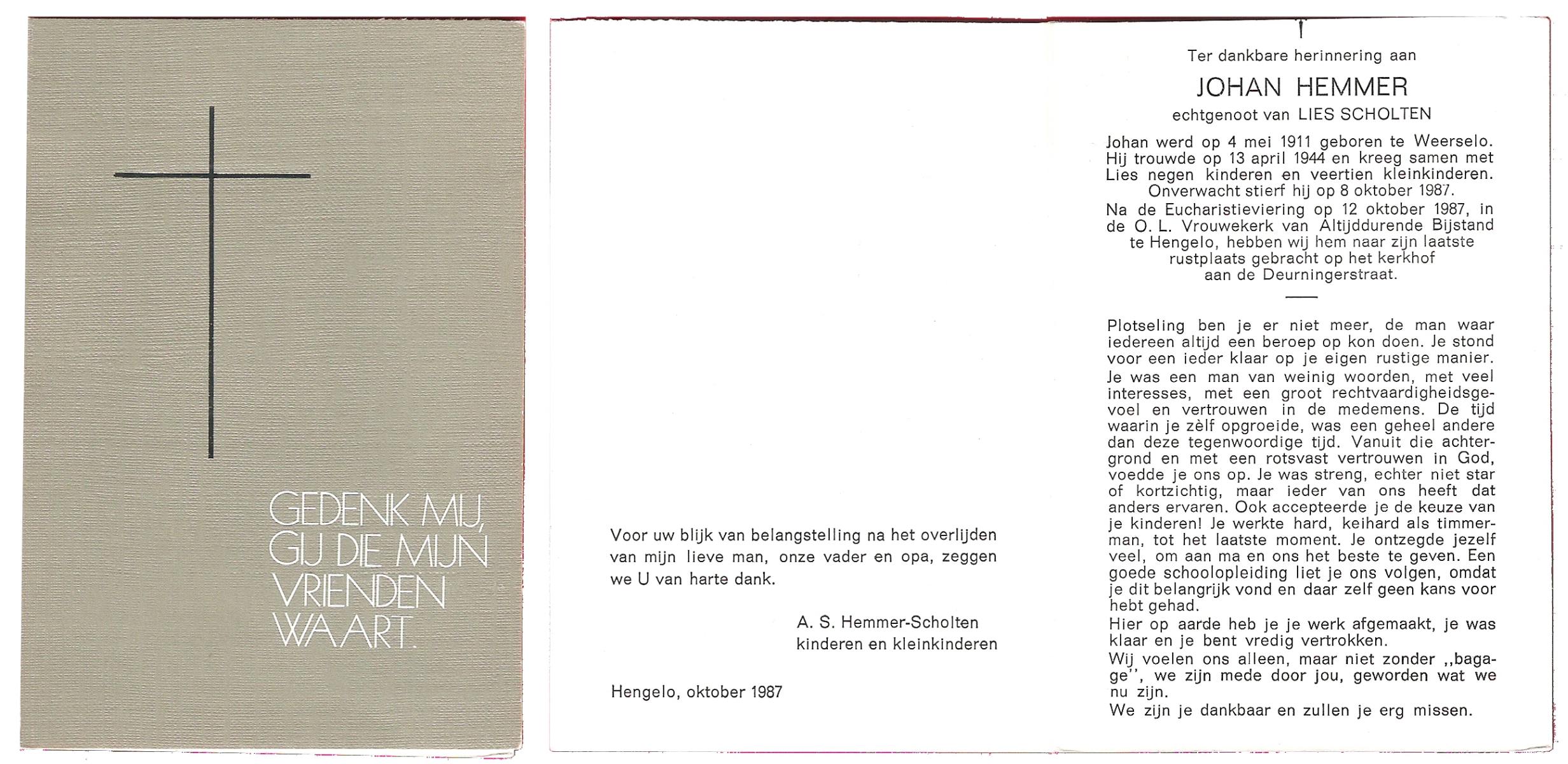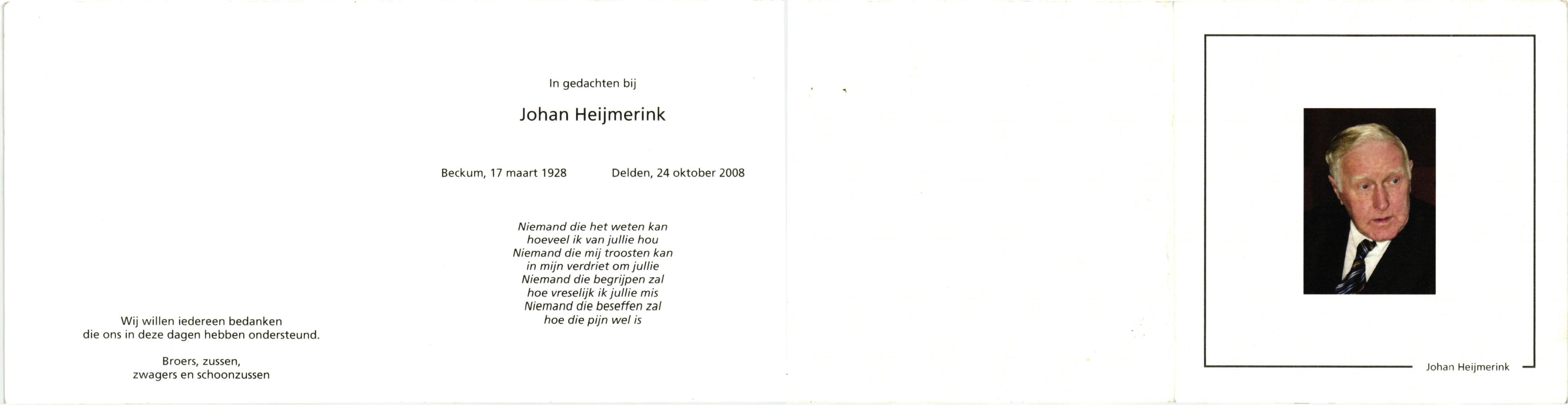 HEIJMERINK, Johan, geboren op 17-3-1928 te Beckum, overleden op 24-10-2008 te Delden op 80-jarige leeftijd.
