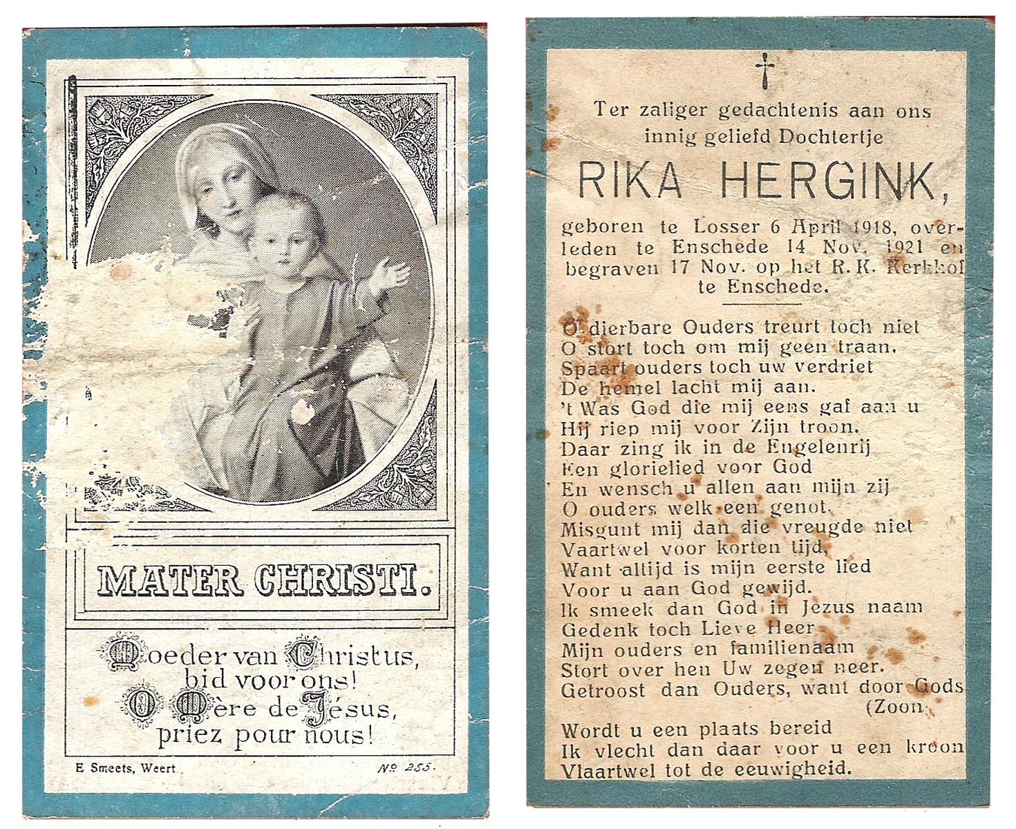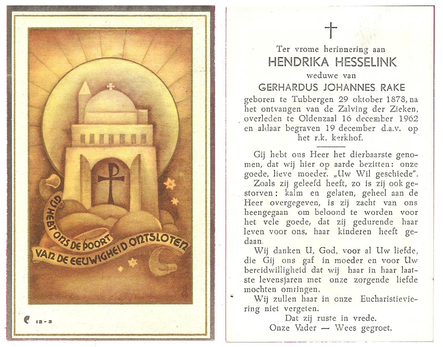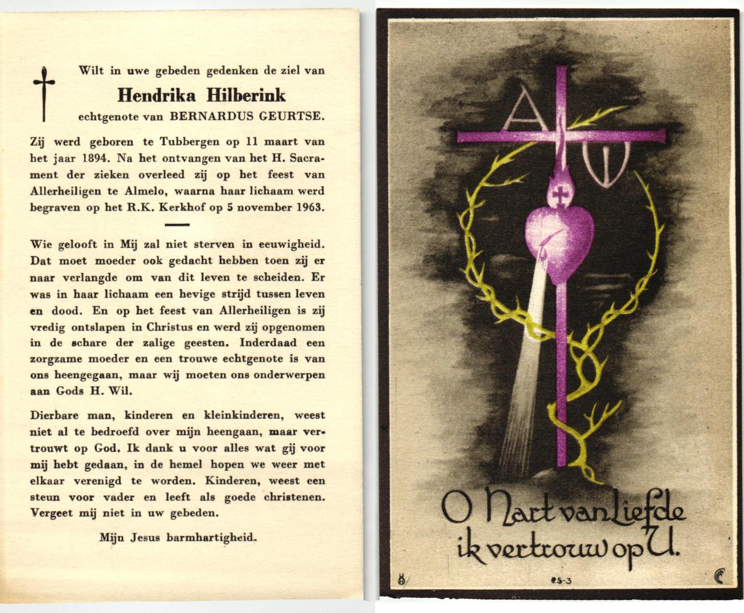HILBERINK, Hendrika, geboren op 11-03-1894 te Tubbergen, overleden op 1-11-1963 te Almelo op 69-jarige leeftijd, begraven op 5-11-1963 te Almelo.
