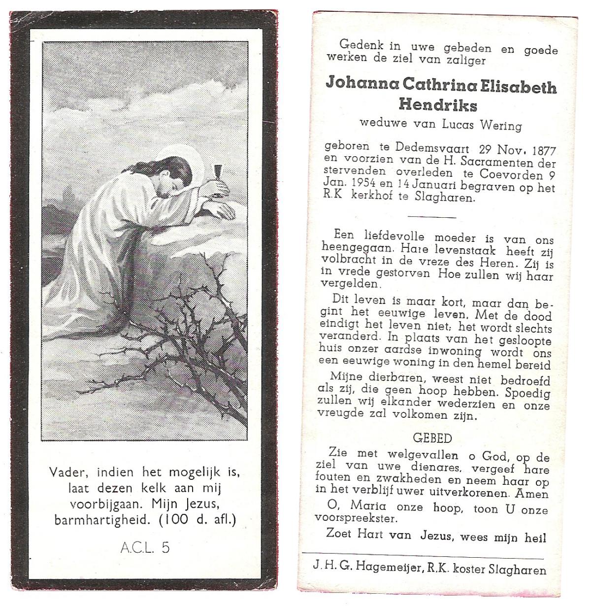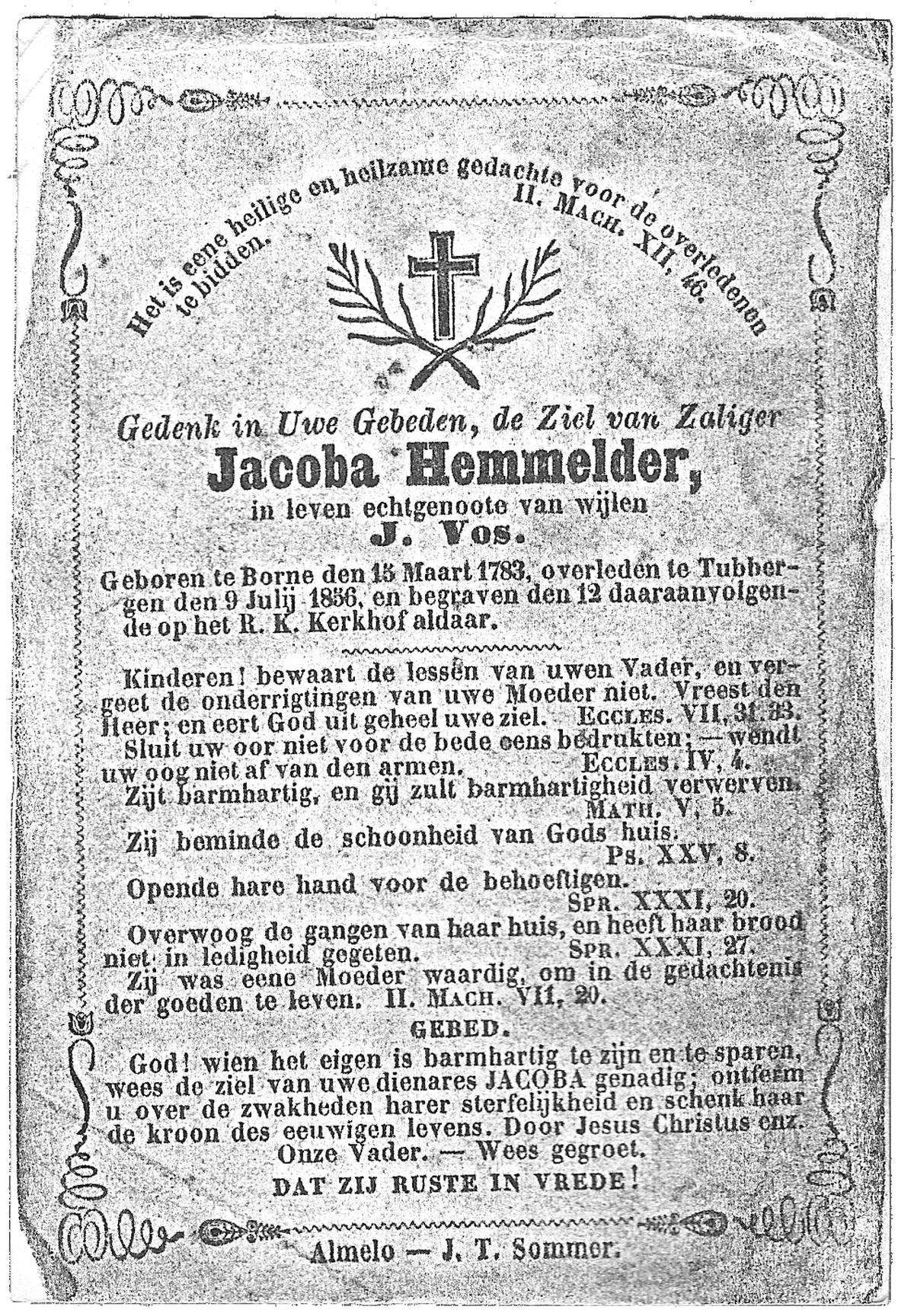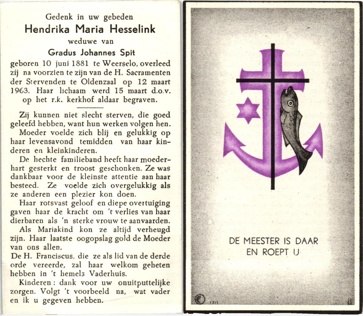 HILBERINK, Hendrika, geboren op 11-03-1894 te Tubbergen, overleden op 1-11-1963 te Almelo op 69-jarige leeftijd, begraven op 5-11-1963 te Almelo.
