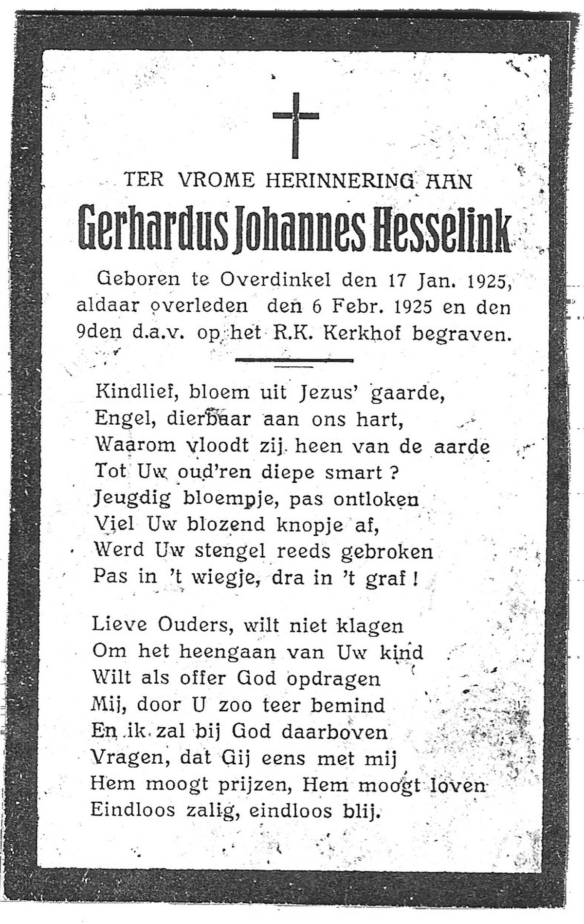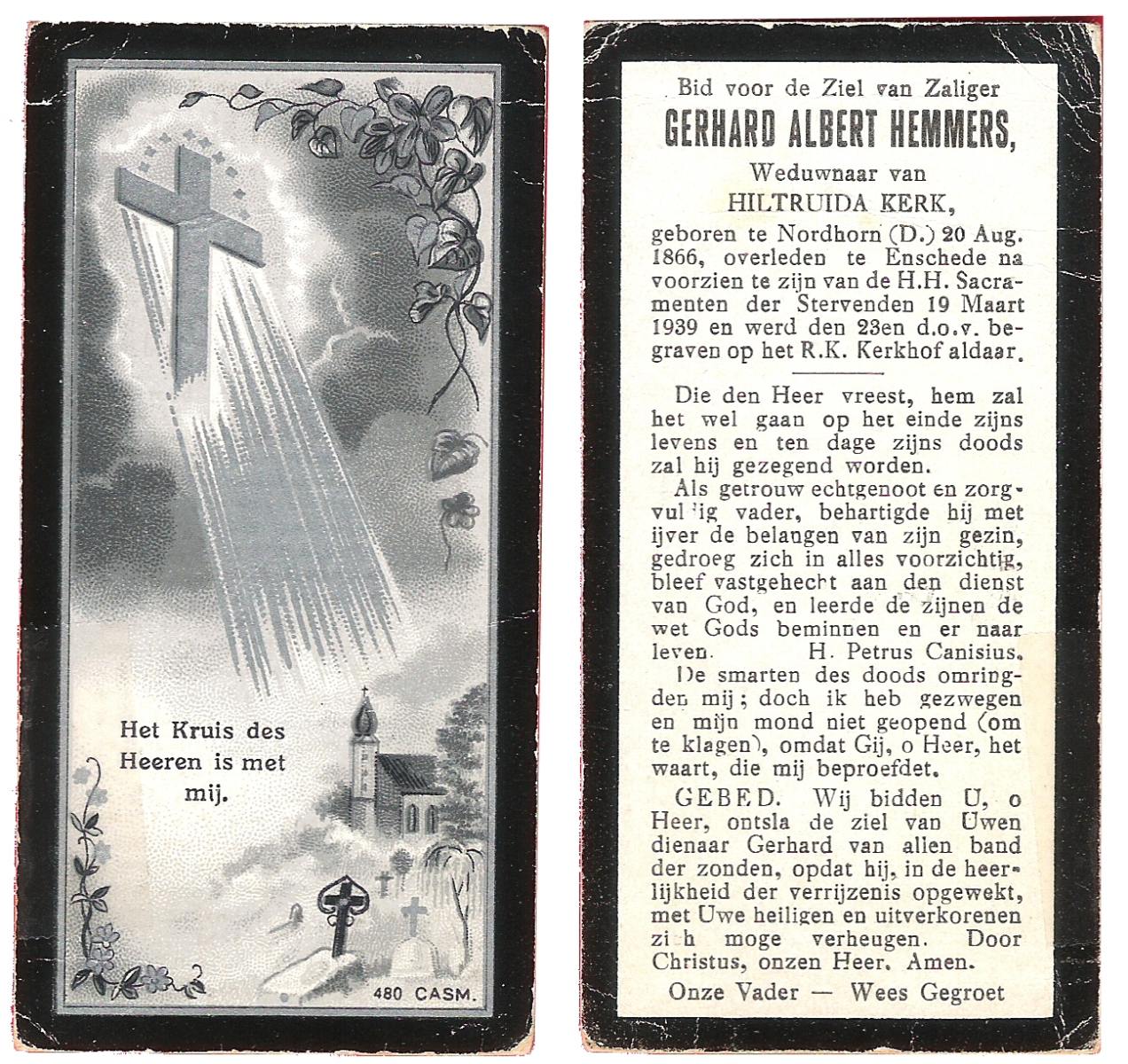 HILBERINK, Gerardus Johannes, geboren op 12-05-1874 te Tubbergen, overleden op 17-7-1943 te Albergen op 69-jarige leeftijd, begraven op 20-7-1943 te Albergen.