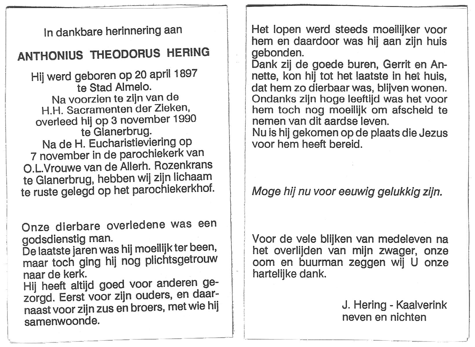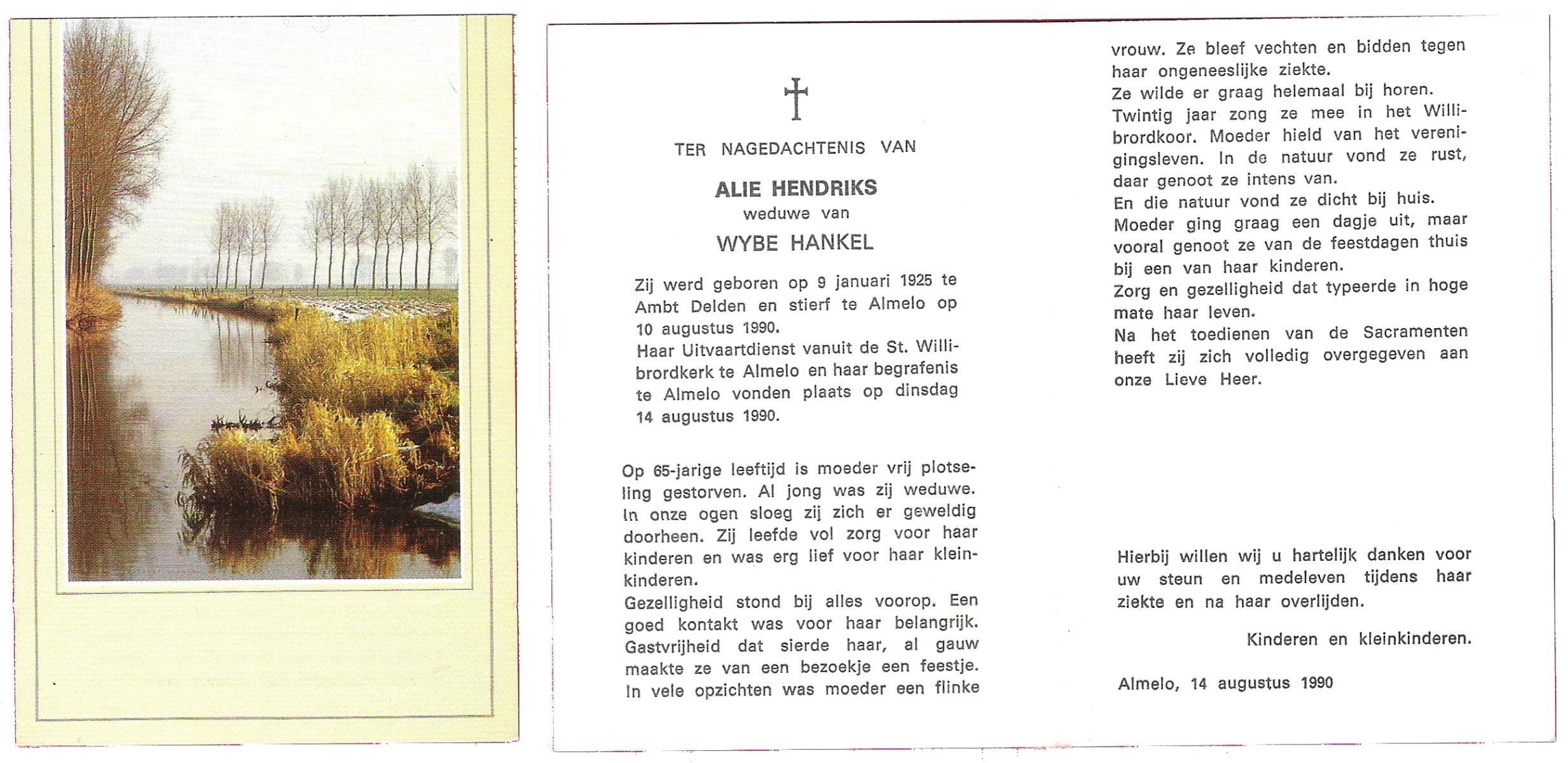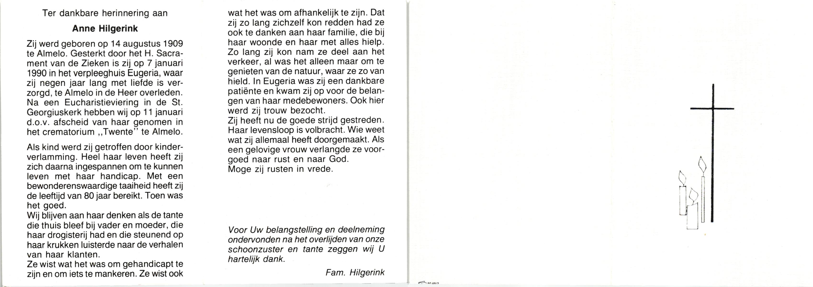 HILGERINK, , Anne, geboren op 14-8-1909 te Almelo, overleden op 7-1-1990 te Almelo op 80-jarige leeftijd, gecremeerd op 11-1-1990 te Almelo.