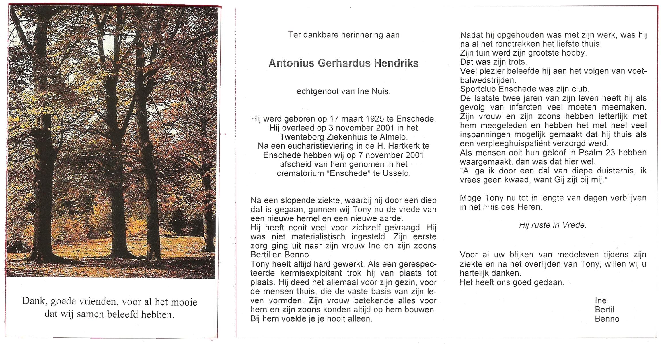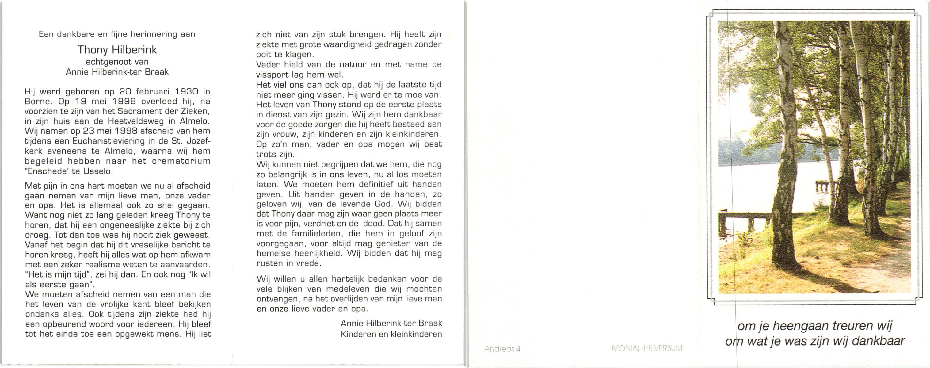 HILBERINK, Thony, geboren op 20-2-1930 te Borne, overleden op 19-5-1998 te Almelo op 68-jarige leeftijd, gecremeerd op 23-5-1998 te Usselo.