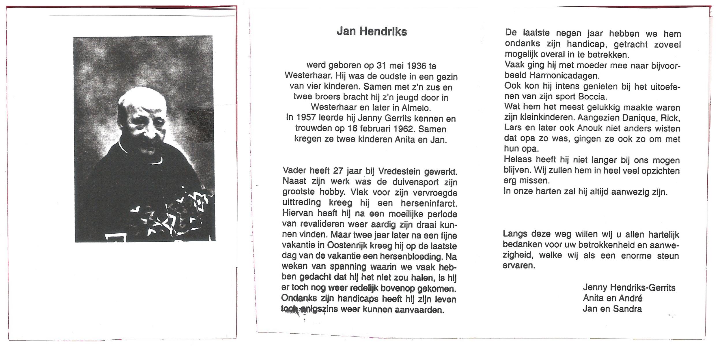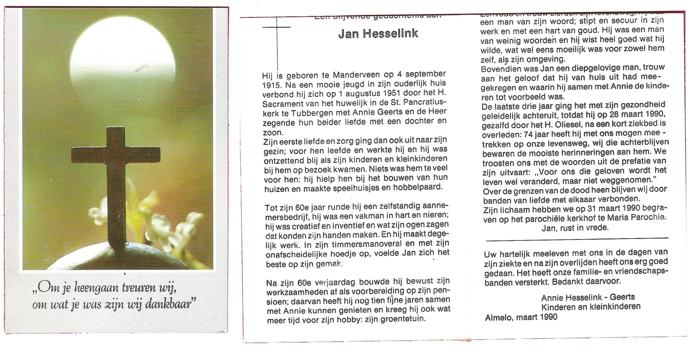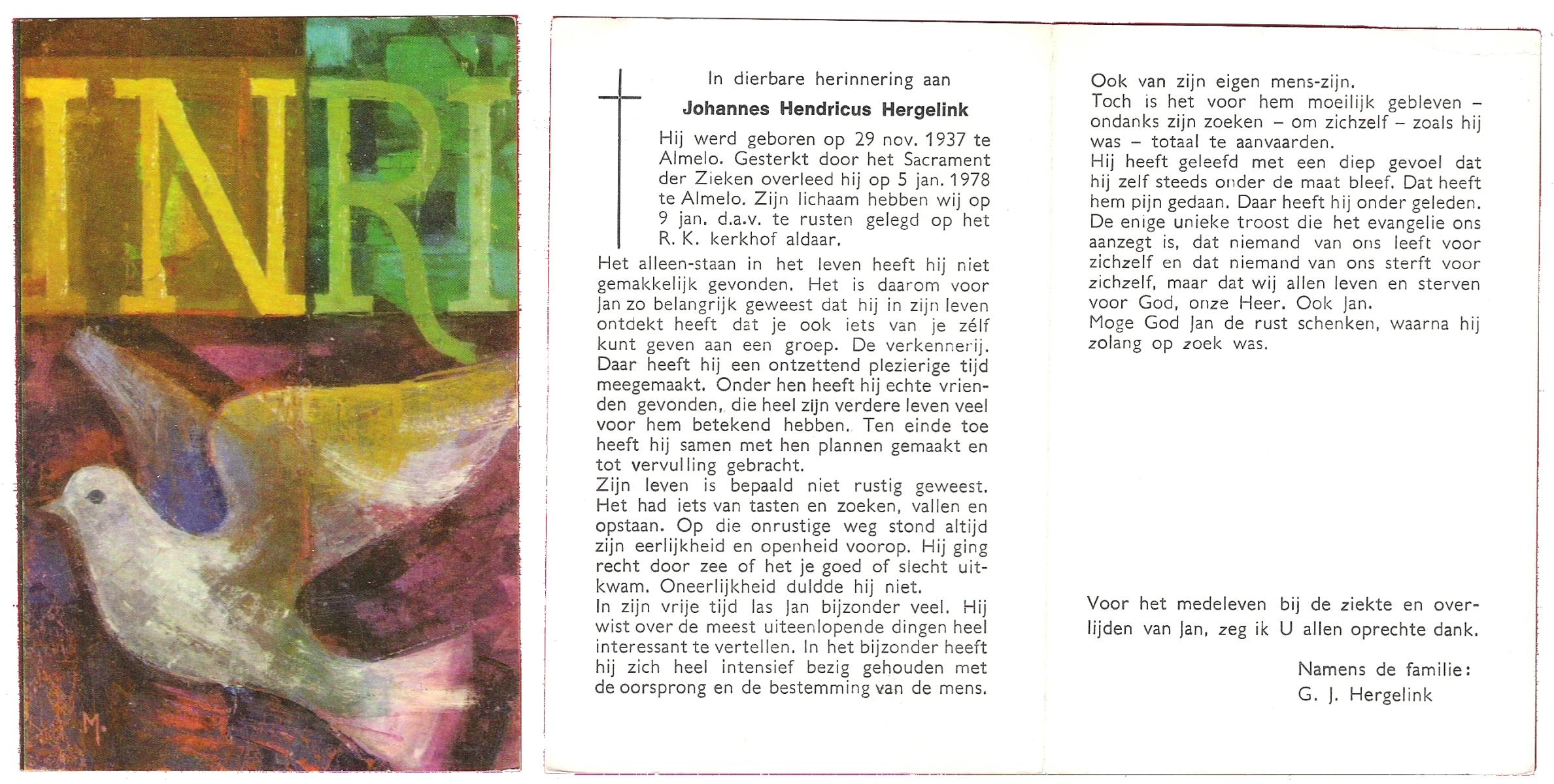 HILGERINK, Jan, geboren op 19-12-1920 te Almelo, overleden op 23-9-1991 te Almelo op 70-jarige leeftijd, gecremeerd op 27-9-1991 te Almelo.
