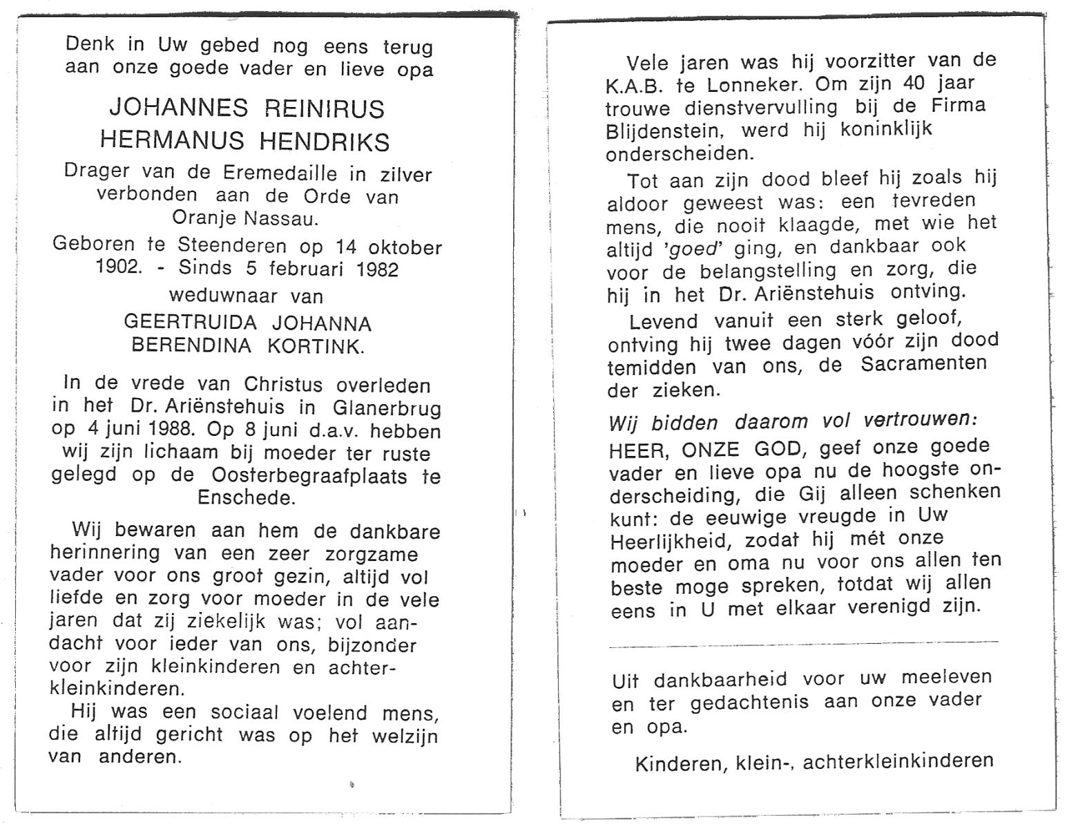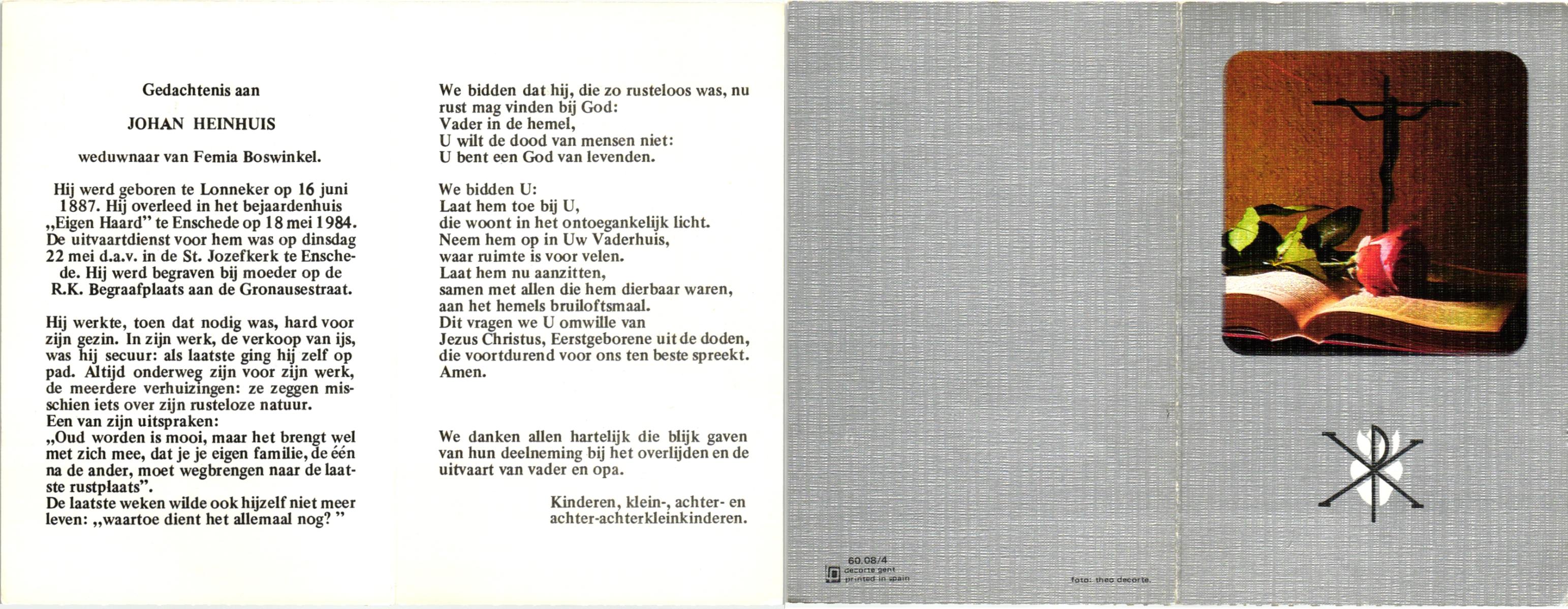HEINHUIS, , Johan, geboren op 16-06-1887 te Lonneker, overleden op 18-5-1984 te Enschede op 96-jarige leeftijd, begraven op 22-5-1984 te Glanerbrug.