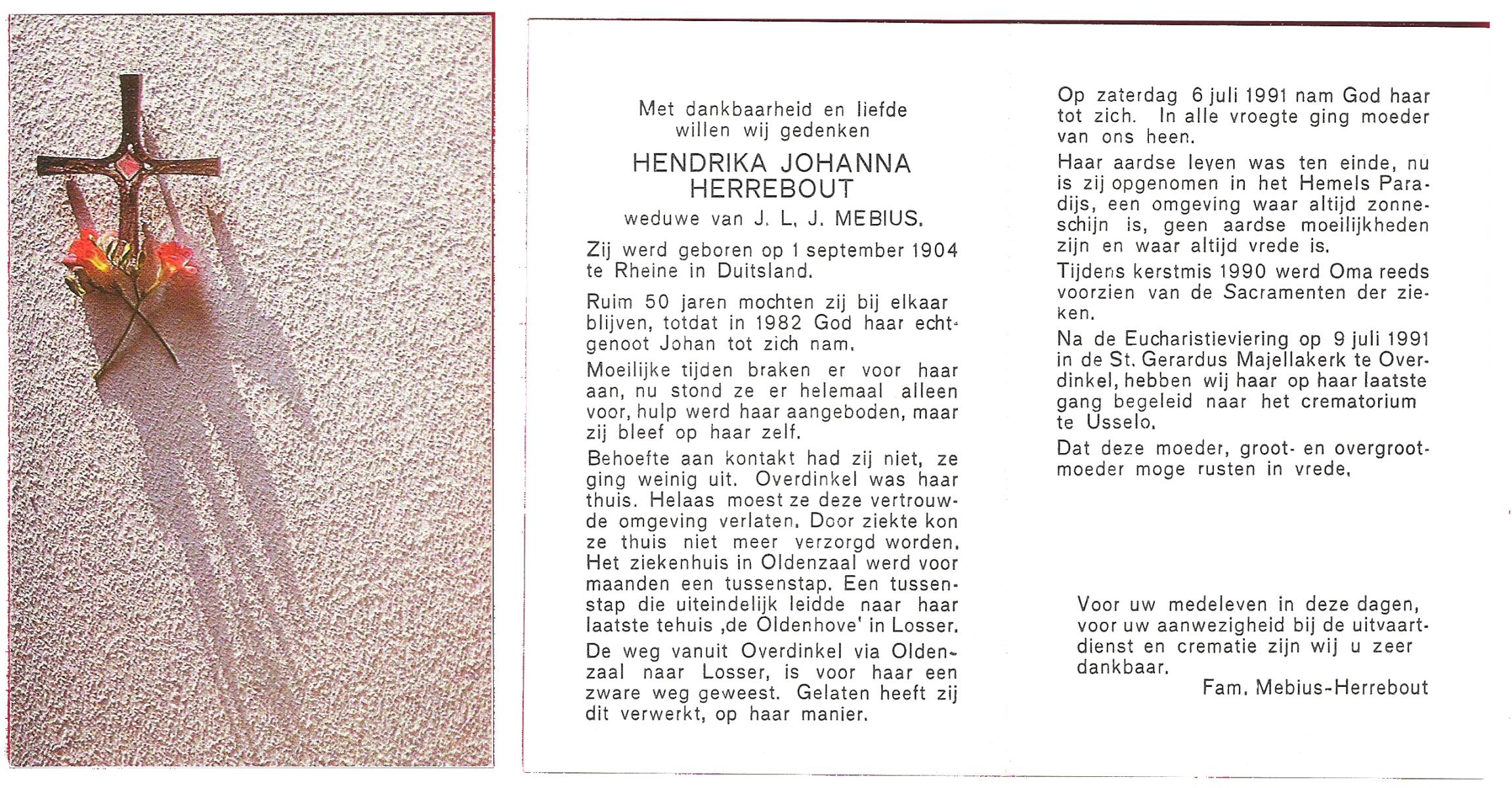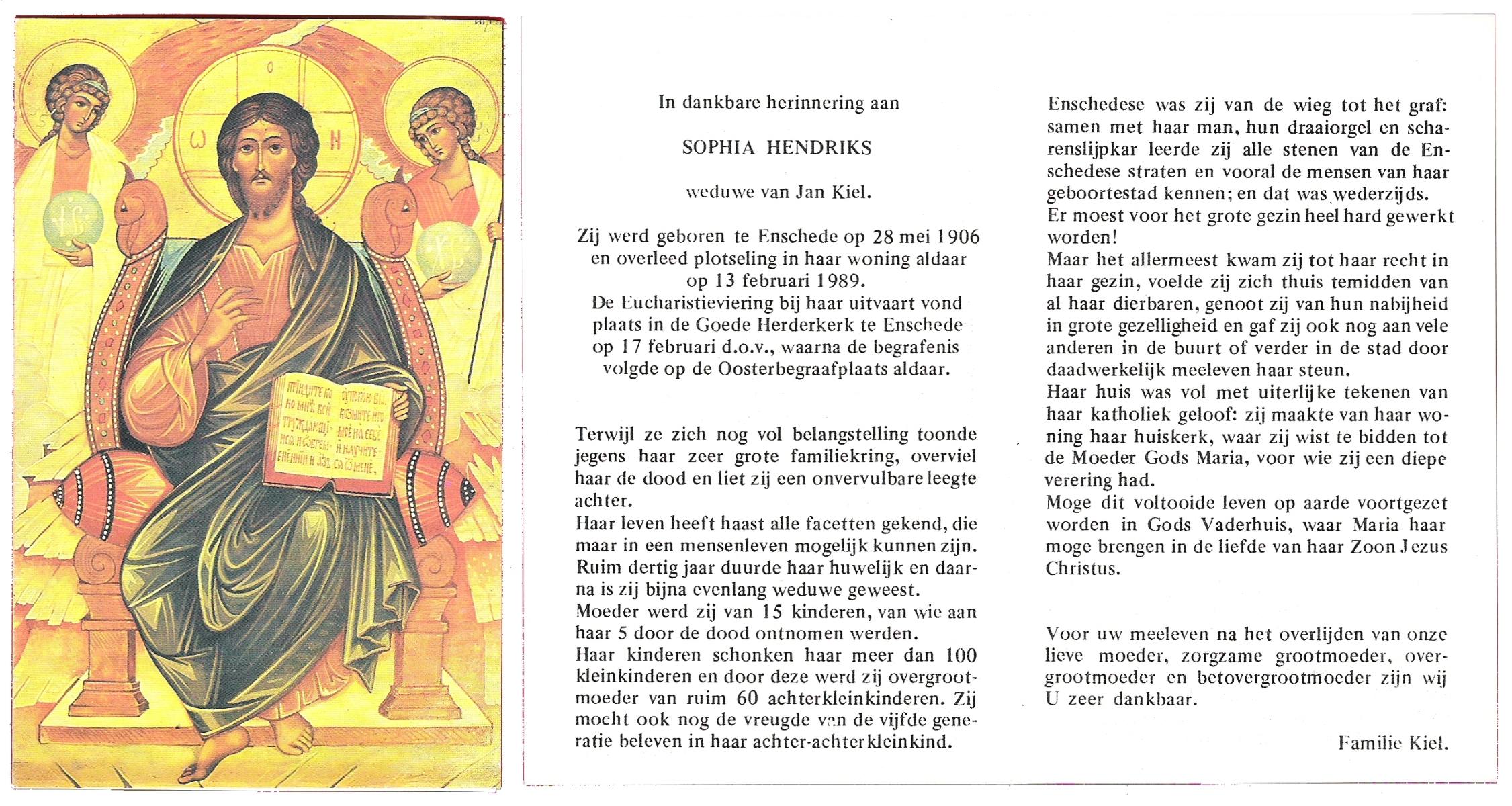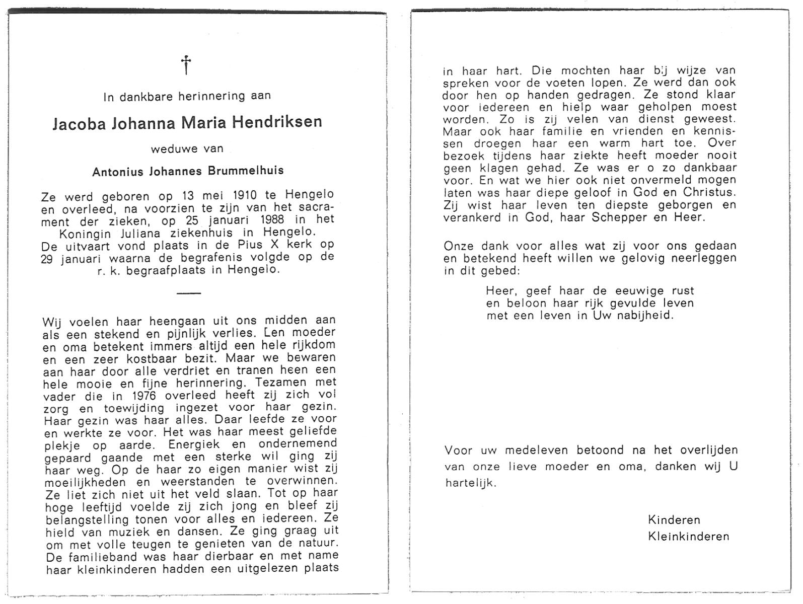 HILLENAAR, Hendrica Johanna, geboren op 15-2-1920 te Enschede, overleden op 18-6-1987 te Enschede op 67-jarige leeftijd, begraven op 23-6-1987 te Enschede.