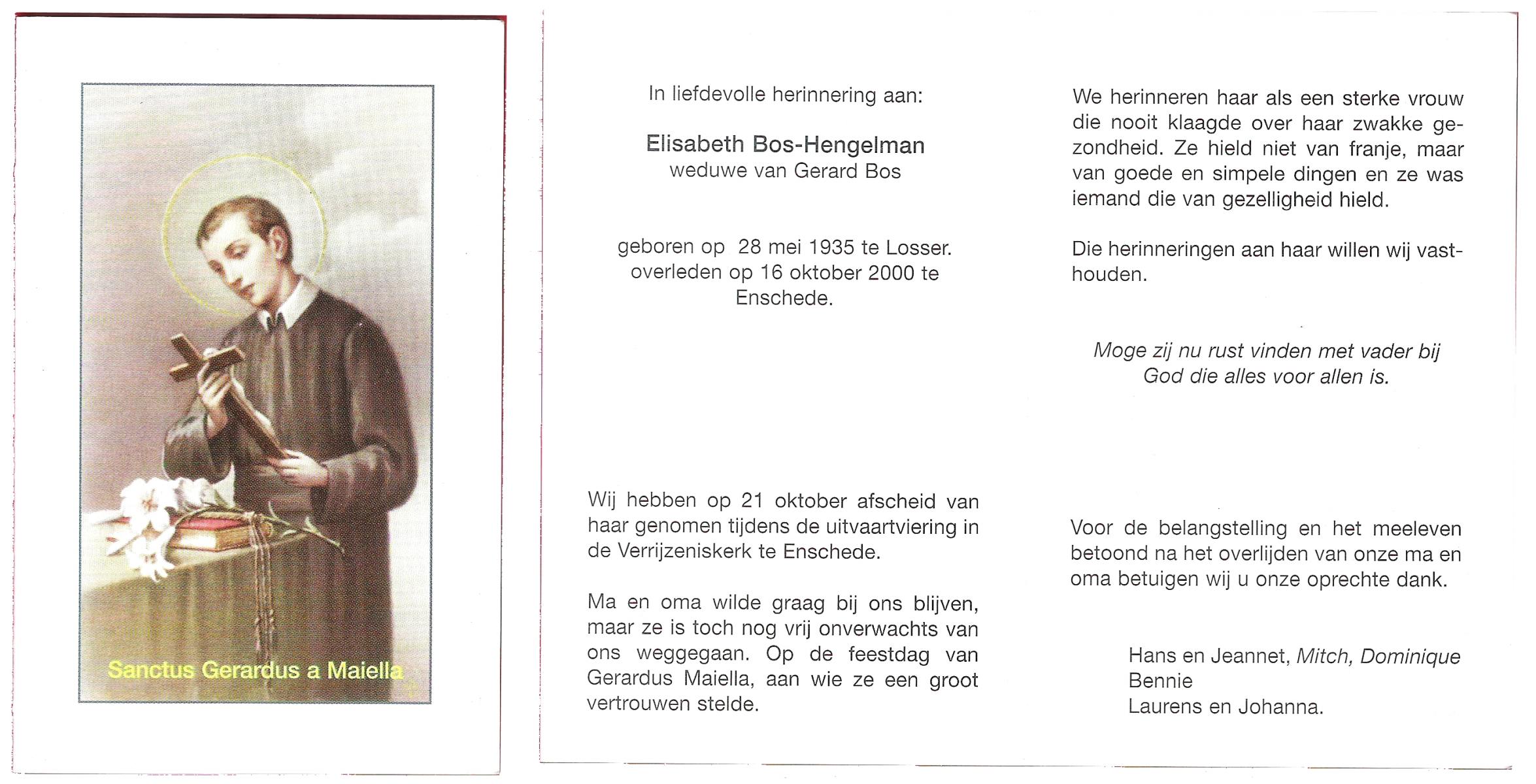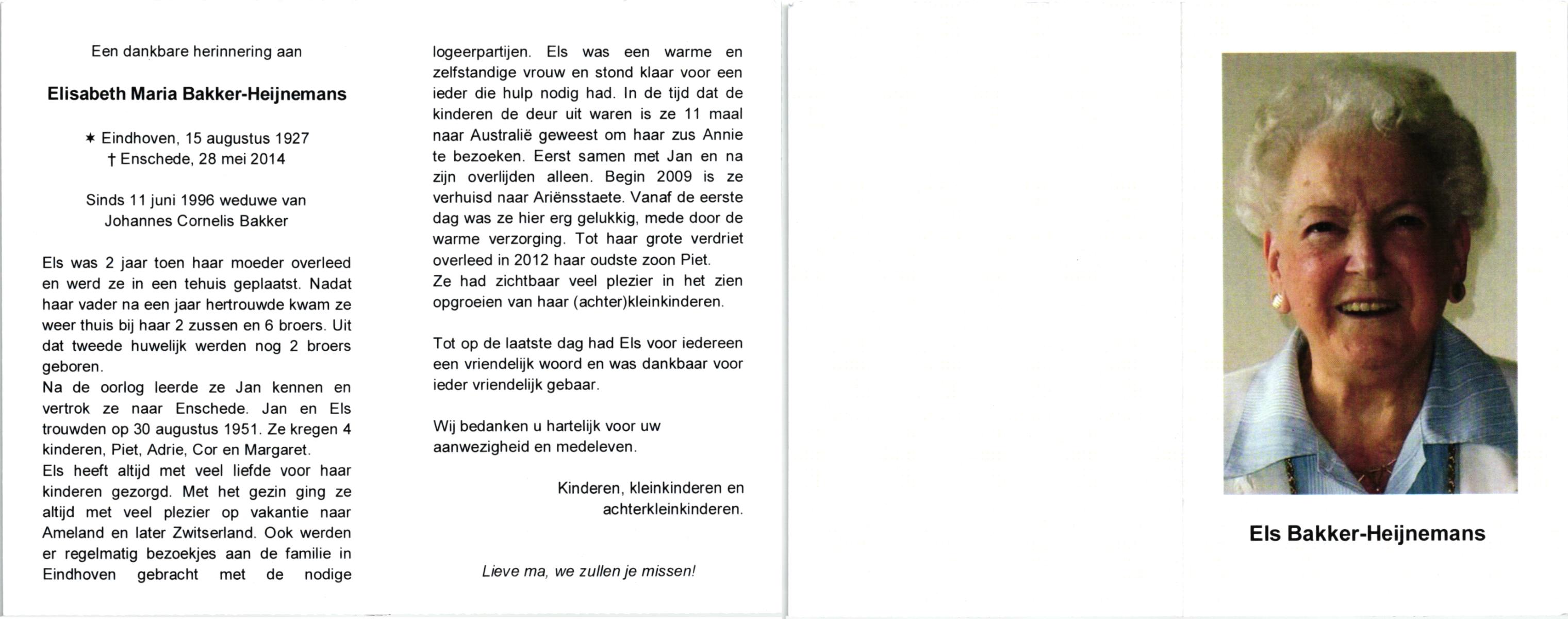 HEIJNEMANS, , Elisabeth Maria, geboren op 15-8-1927 te Eindhoven, overleden op 28-5-2014 te Enschede op 86-jarige leeftijd.