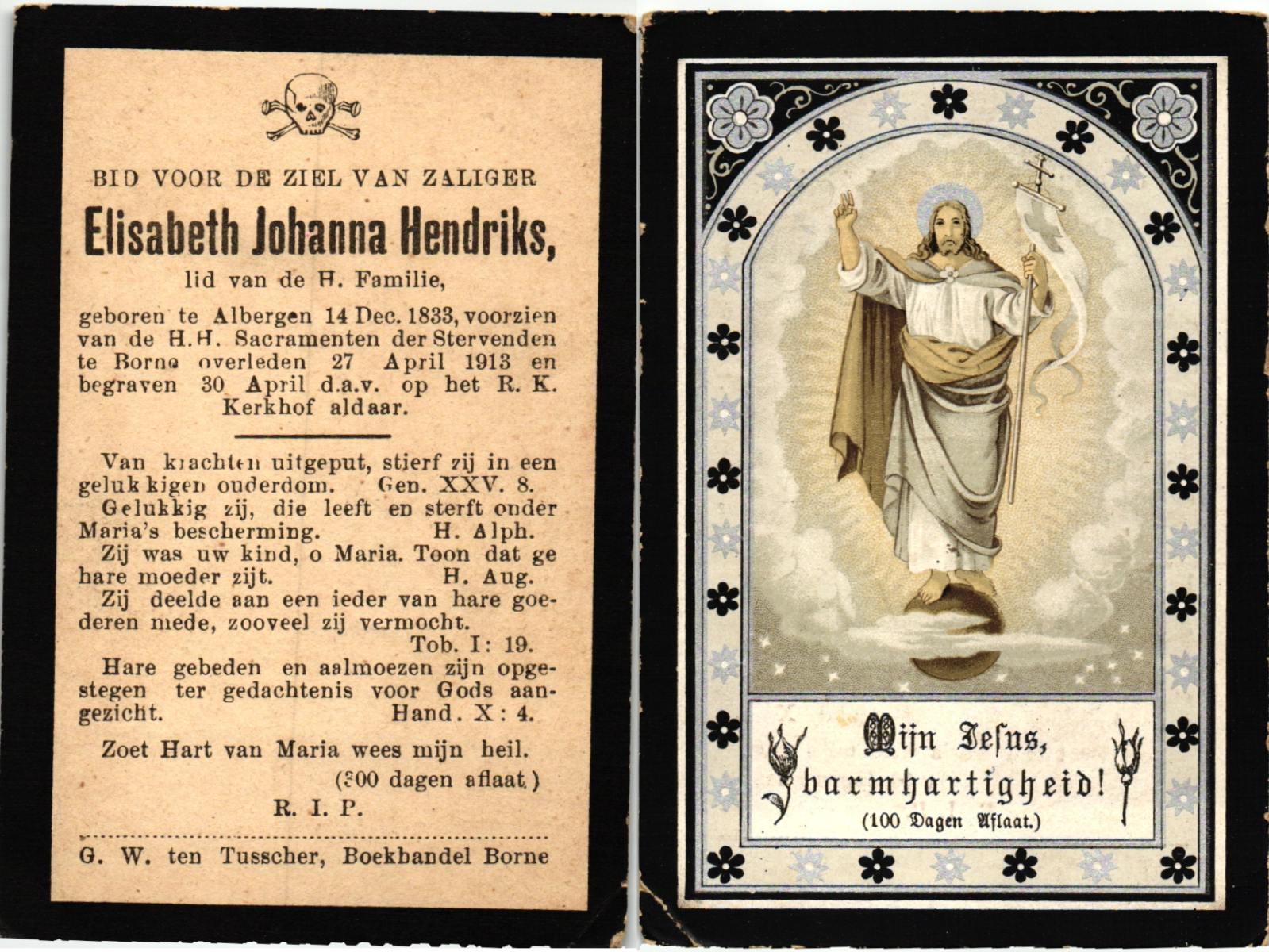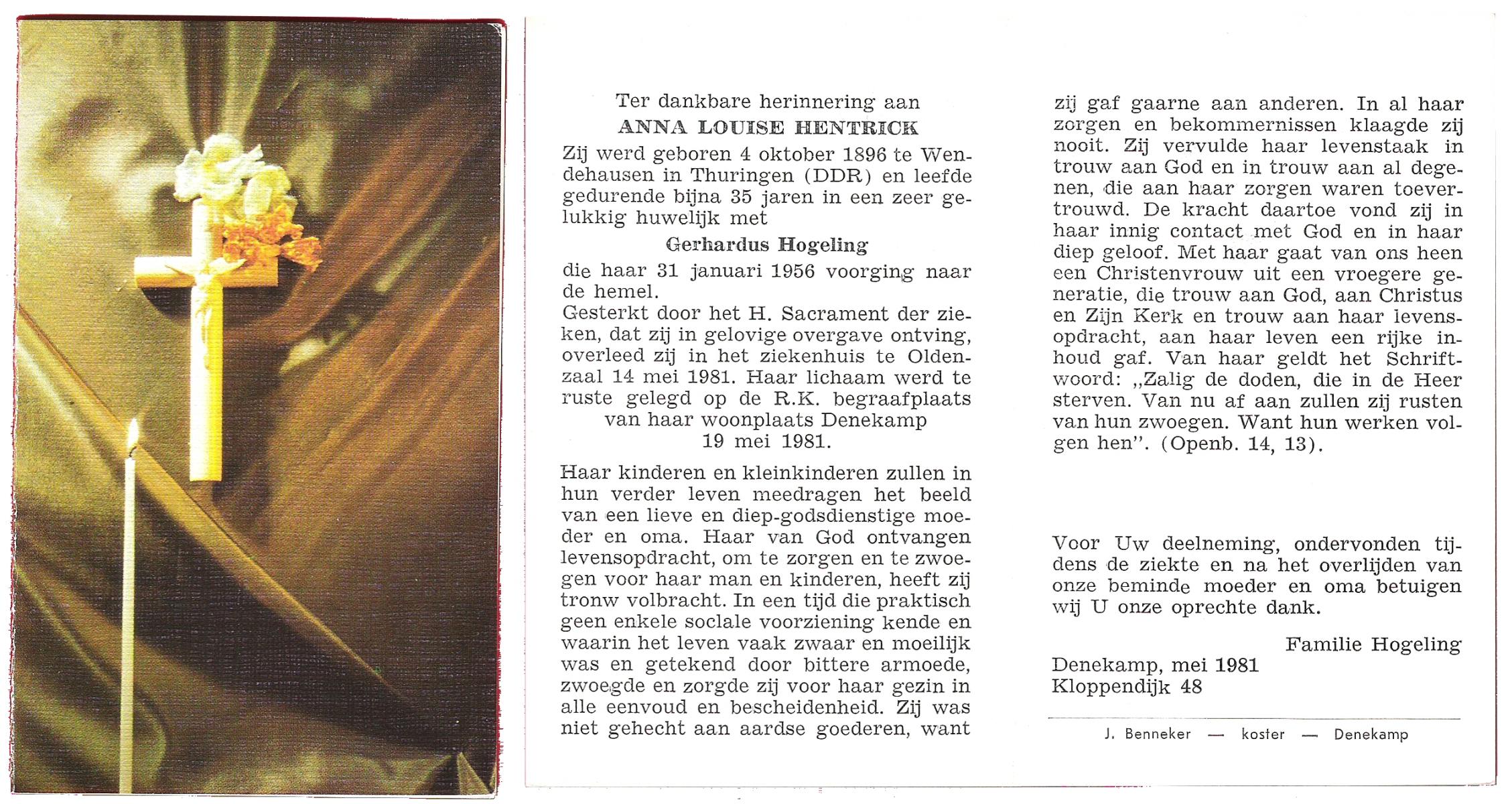 HILGERINK, Hendrika, geboren op 29-07-1884 te Almelo, overleden op 4-10-1965 te Bornerbroek op 81-jarige leeftijd, begraven op 8-10-1965 te Bornerbroek.