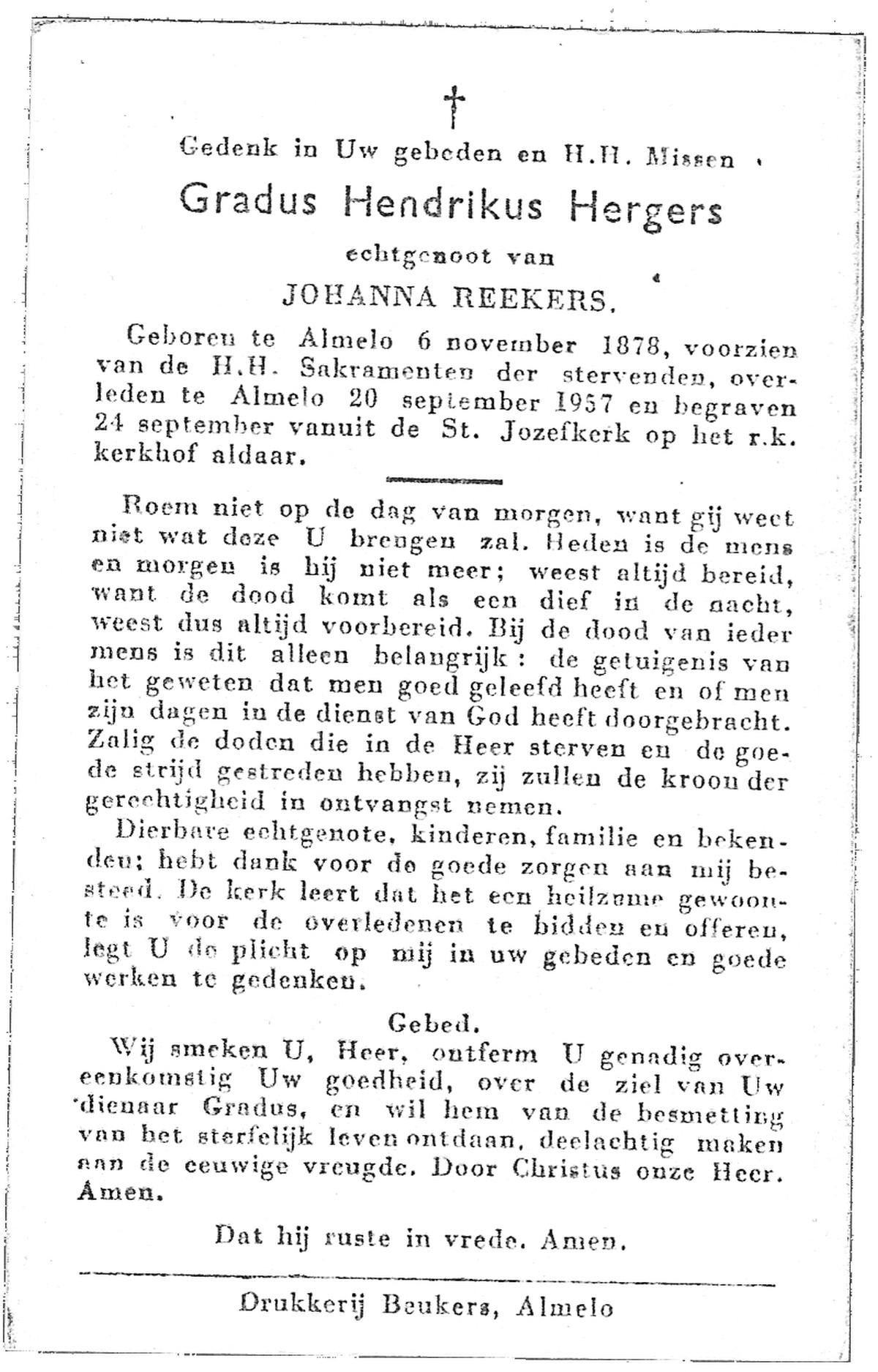 HILGERINK, Gradus, geboren op 18-02-1879 te Almelo, overleden op 4-12-1963 te Almelo op 84-jarige leeftijd, begraven op 7-12-1963 te Almelo.